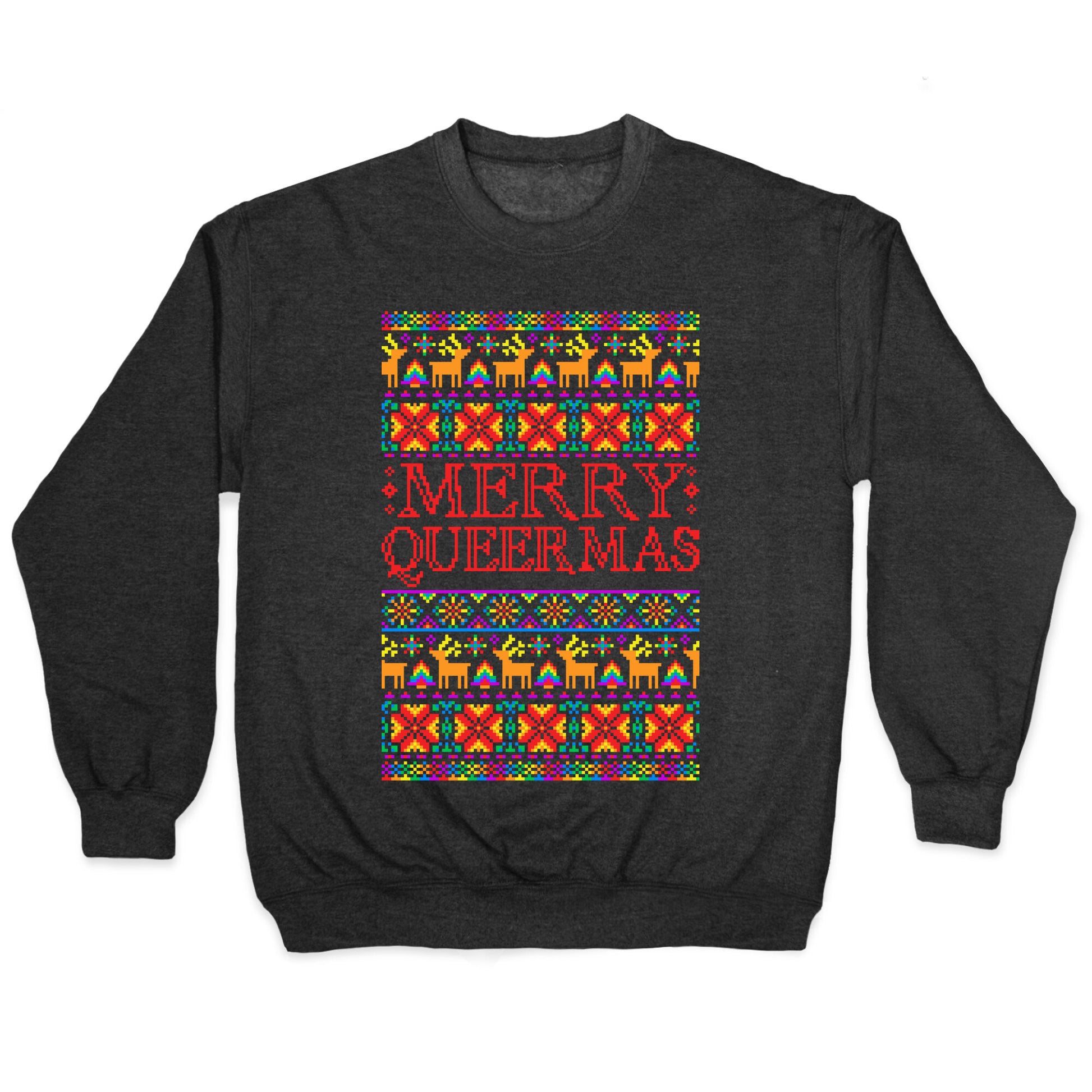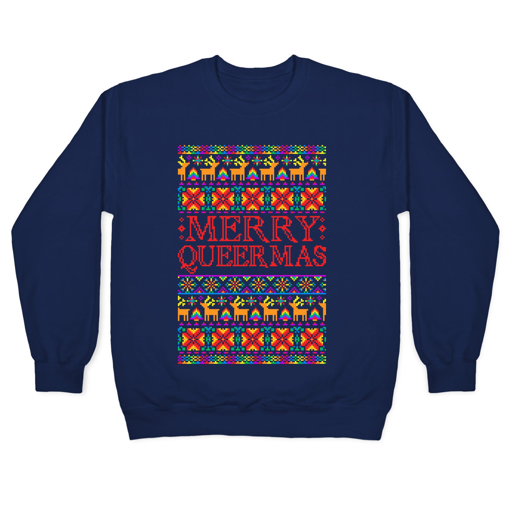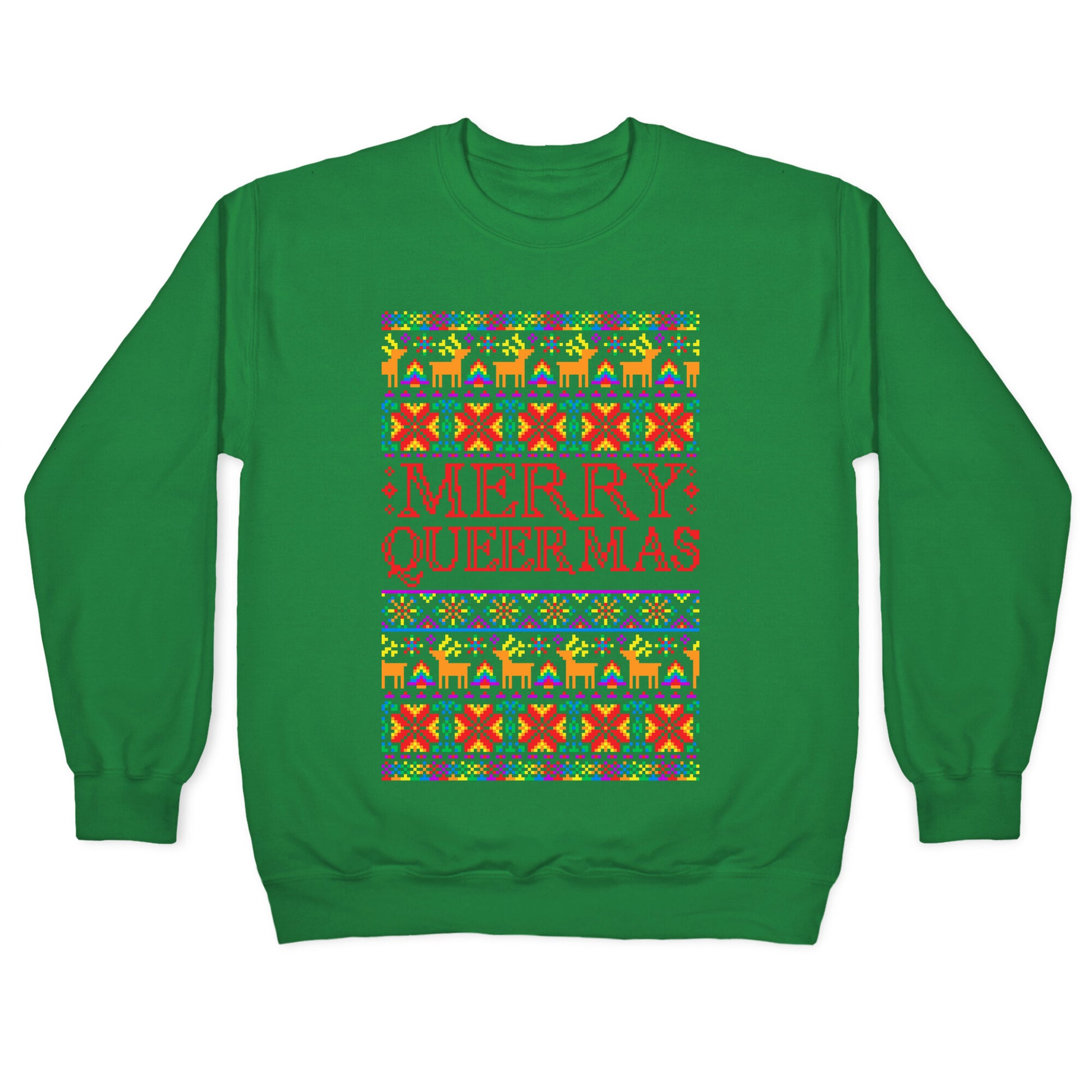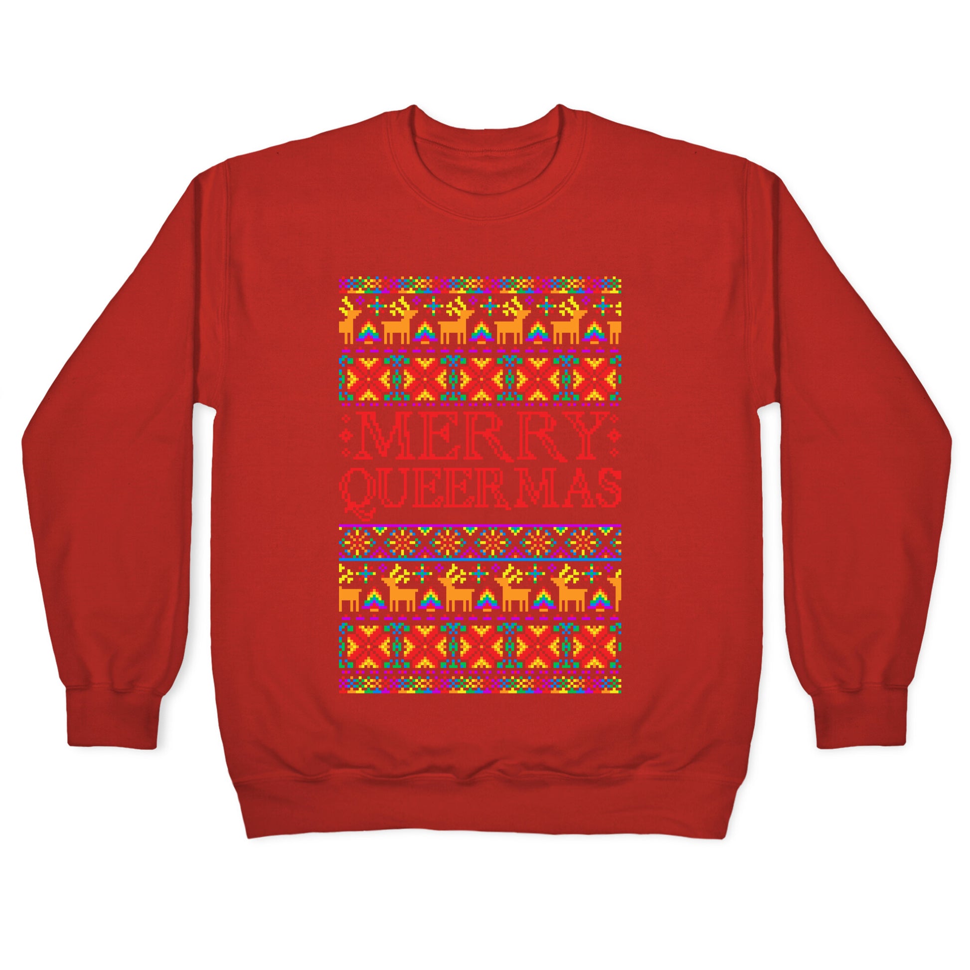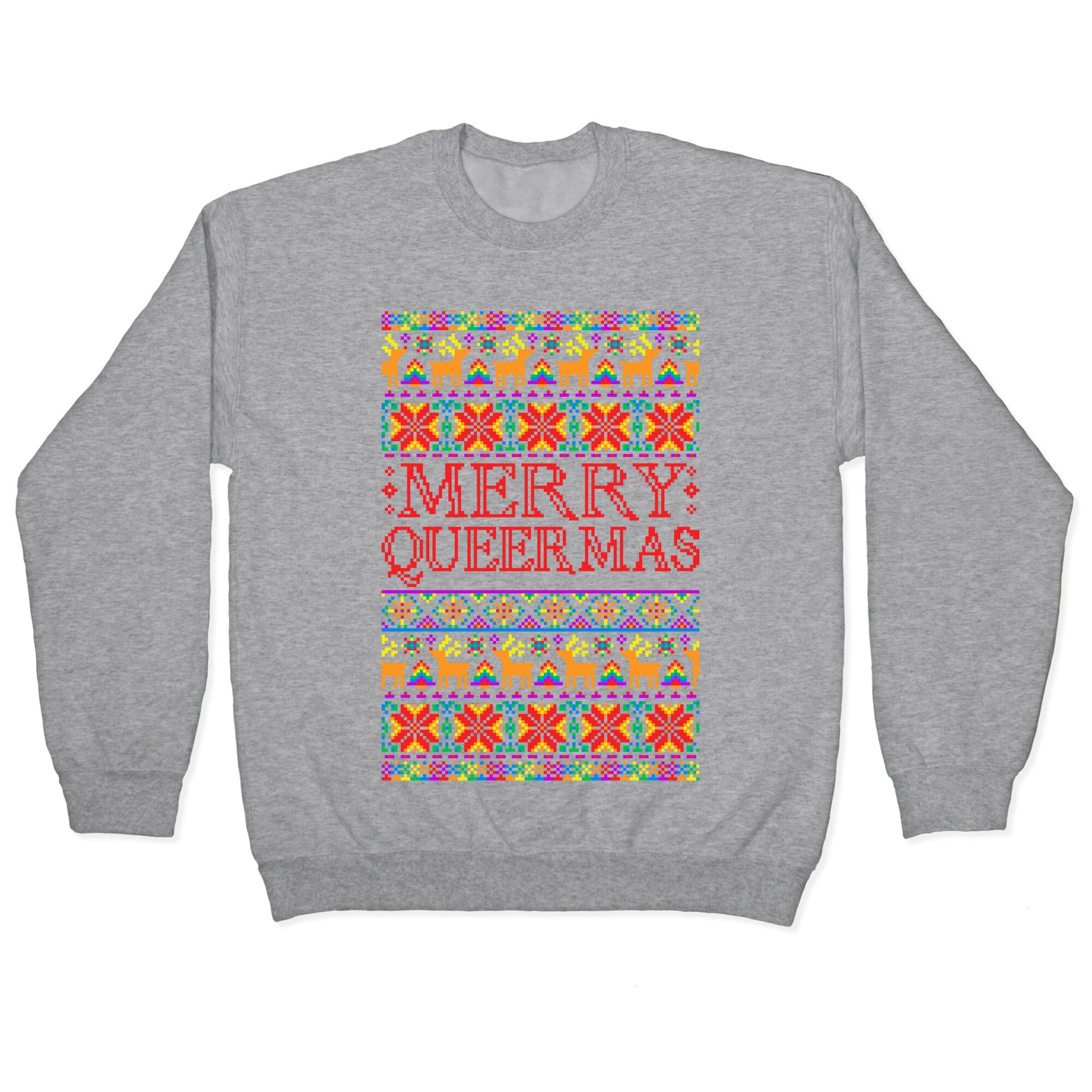 Merry Queermas! Happy Holi-gays! This 'ugly christmas sweater' parody is perfect for showing your pride and sense of humor this holiday season!!Our Unisex Crewneck Sweatshirt is made from a soft 8-ounce fabric, and they feature a crew neck, with sleeve and bottom hems for durability. Great for layering. Preshrunk for your convenience! Printed in the USA. Made with 50% Cotton and 50% Polyester.
