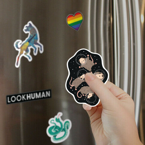 Searchin' for that sweet space junk! Explore outer space with these cute space opossums. Perfect for loving space, science, animals, and trash! Switch it up! Our vibrant precision die-cut magnets are the perfect accessory to any refrigerator, car, locker, and more. Features a 15mm thick flexible magnet material, and a 3-4 inch design size. Printed in the USA.
