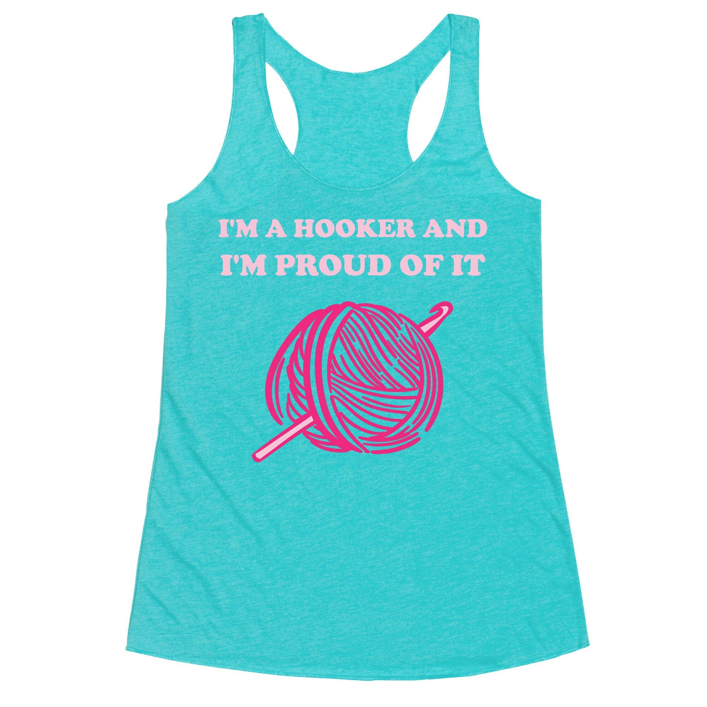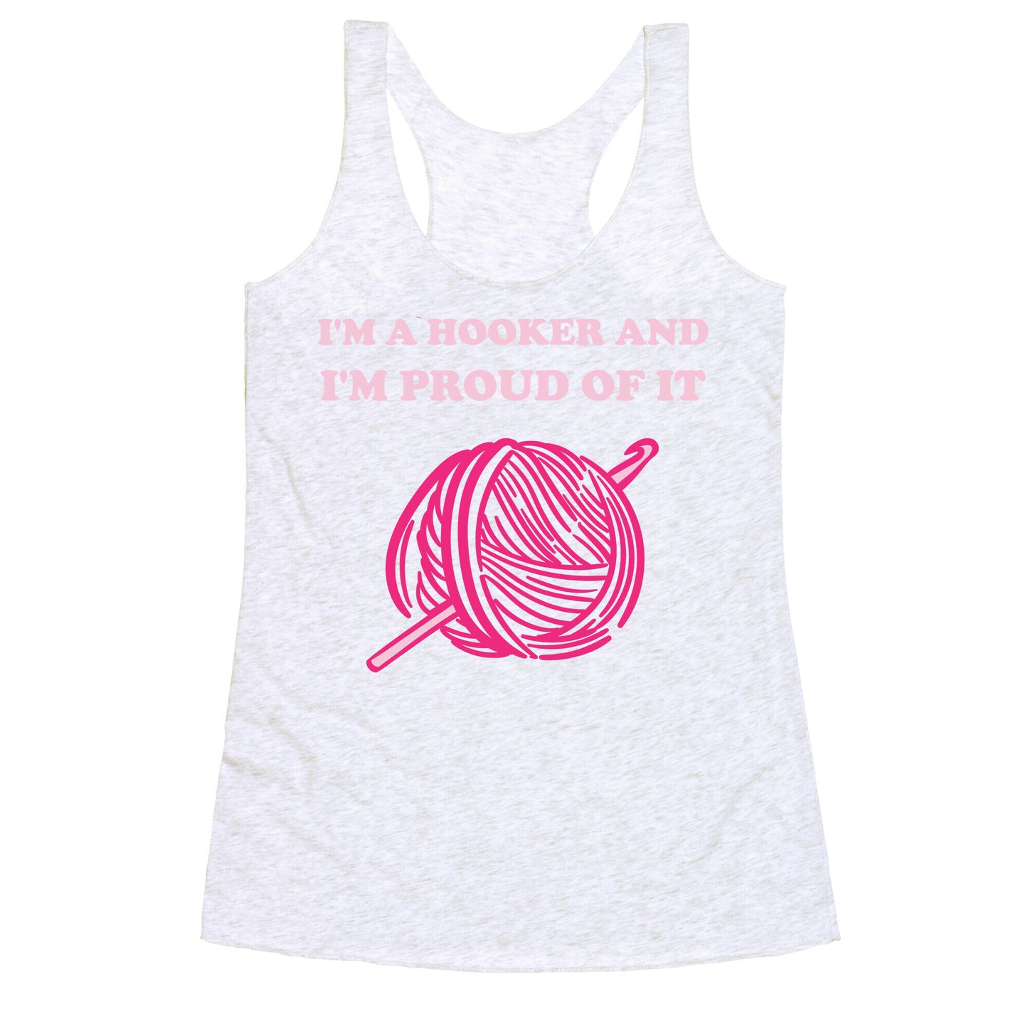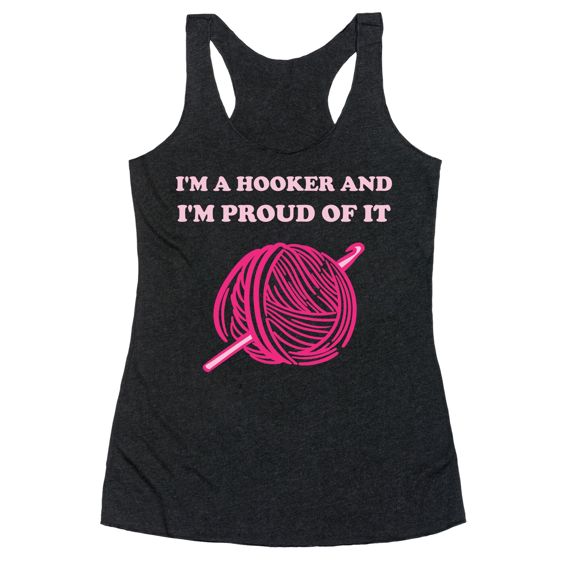 Show of your sex-positive ideologies and your love for the craft of crochet with this "I'm A Hooker And I'm Proud Of It" t-shirt. Perfect for those who love making things out of yarn, and having a sassy side!Our super comfortable Women’s Raw Edge Racerback features a soft tri-blend, unhemmed fabric, with a fashionable bell-like shape for the bottom. Preshrunk for your convenience! Printed in the USA. Made with 50% Polyester 25% Ring Spun Cotton, and 25% Rayon.