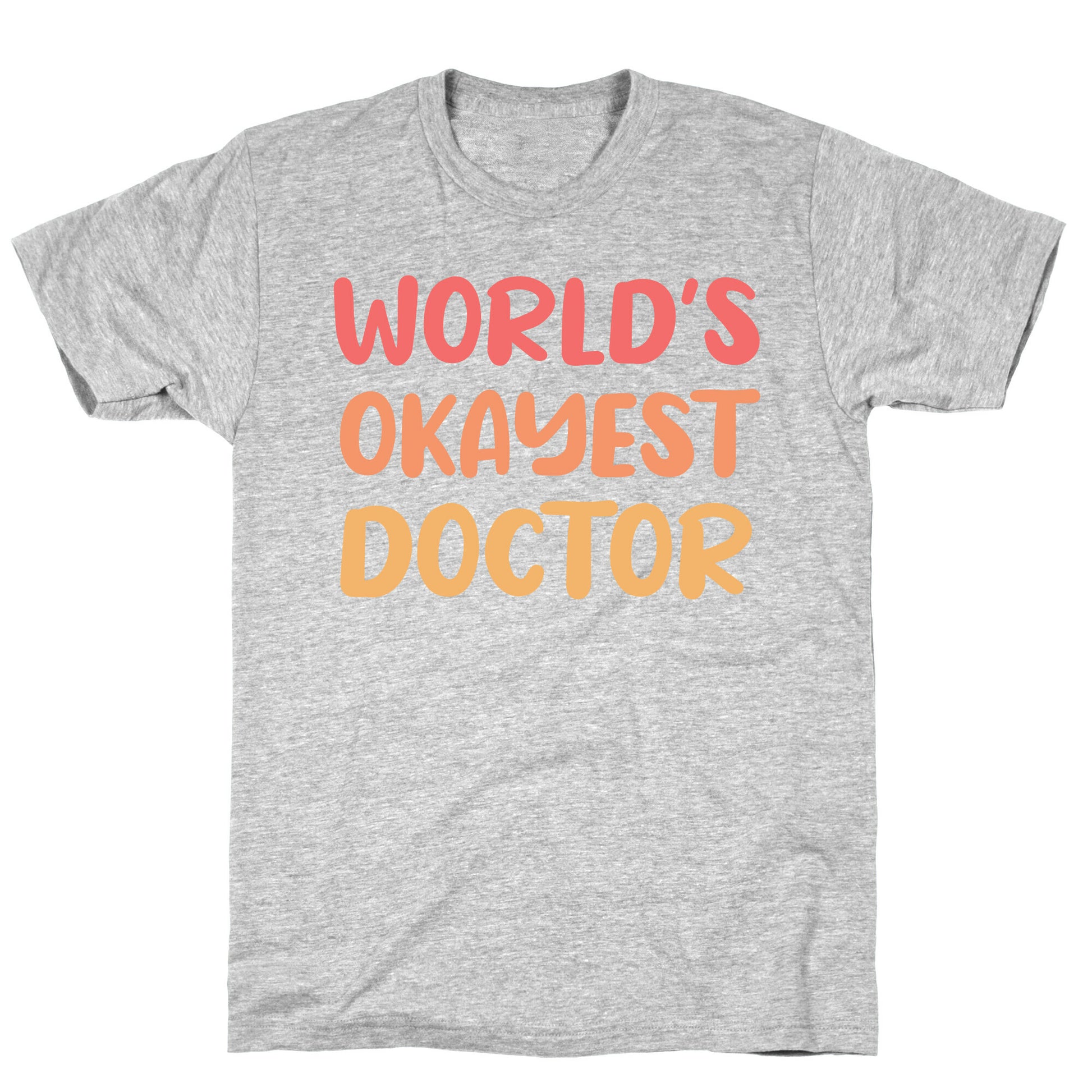Introducing our "World's Okayest Doctor" t-shirt, a hilarious and tongue-in-cheek way to celebrate the medical professionals who always give it their best shot, no matter what! This tee combines humor and appreciation to create a statement piece that sparks laughter and nods of recognition from both doctors and their patients. Designed with a classic yet contemporary style, it is the perfect gift for the doctor in your life who doesn't take themselves too seriously. Emblazoned proudly across the chest, the "World's Okayest Doctor" message is a lighthearted acknowledgement of the tireless efforts and hard work put in by doctors everywhere. Whether they triumph over challenging diagnoses or have a knack for making patients feel at ease, this t-shirt acknowledges that it's okay not to be perfect – because the journey to being an extraordinary doctor is paved with learning and growth. Made to bring smiles and foster camaraderie among medical professionals, this t-shirt is a must-have addition to any doctor's wardrobe, highlighting the importance of both dedication and a good sense of humor in the field of medicine. Our fitted Unisex Cotton tee is made from an exceedingly soft 100% ring spun cotton. It features a crew neckline with hemmed sleeves and bottom for durability. Preshrunk for your convenience! Printed in the USA. Made with 100% Ring Spun Cotton. Athletic Gray is made up of 90% cotton and 10% polyester. Other heathered colors are made of 52% cotton and 48% polyester.