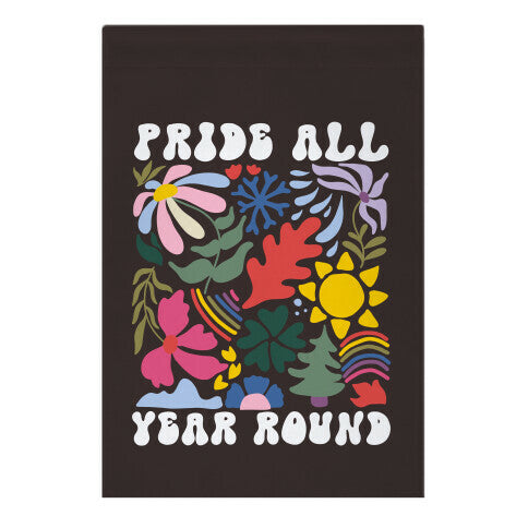 Embrace pride all year round with our design featuring an abstract retro floral illustration and the message "Pride All Year Round." This subtle yet stylish design is perfect for showing your pride and support beyond Pride Month. Add a touch of personality to your outdoor spaces with our unique, weather-resistant garden flags! Stay up with seasonal trends \(or the latest meme!\) and share your passions by switching out your flag for every occasion and mood. Our yard flags are great for the front of your home, a garden space, backyard, or flower planter. Flag stand not included. Printed in the USA.