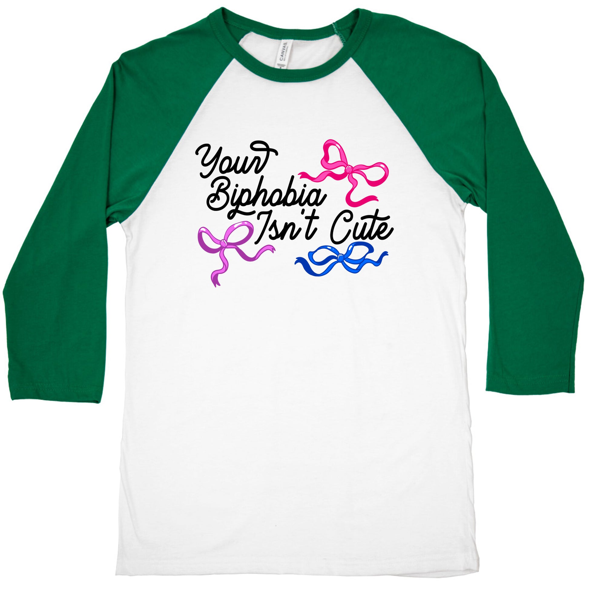 " Your Biphobia Isnt Cute" adorned with coquette bows in vibrant bi pride colors, this apparel sends a powerful message of inclusivity and support for the bisexual community. Whether you identify as bisexual yourself or as an ally, wearing this design showcases your commitment to standing up against discrimination. Let your clothing speak volumes and contribute to creating a more inclusive and accepting world for everyone. Our exceedingly soft and relaxed fit Tri-Blend Baseball Tee features a three-quarter length sleeve, crew neck, fun contrasting color sleeves and neck trim. Preshrunk for your convenience! Printed in the USA. Made with 50% Polyester, 25% Cotton and 25% Rayon