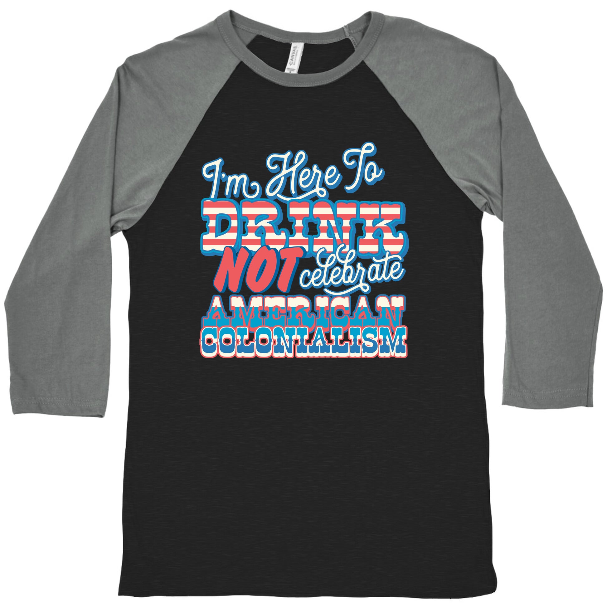 Celebrate the Fourth of July with a twist! Our "Im Here To Drink Not Celebrate American Colonialism" shirt is perfect for those who want to enjoy the festivities without promoting American exceptionalism or the colonization of indigenous peoples. Show your patriotic spirit in a more mindful way with this unique and statement-making design. Our exceedingly soft and relaxed fit Tri-Blend Baseball Tee features a three-quarter length sleeve, crew neck, fun contrasting color sleeves and neck trim. Preshrunk for your convenience! Printed in the USA. Made with 50% Polyester, 25% Cotton and 25% Rayon