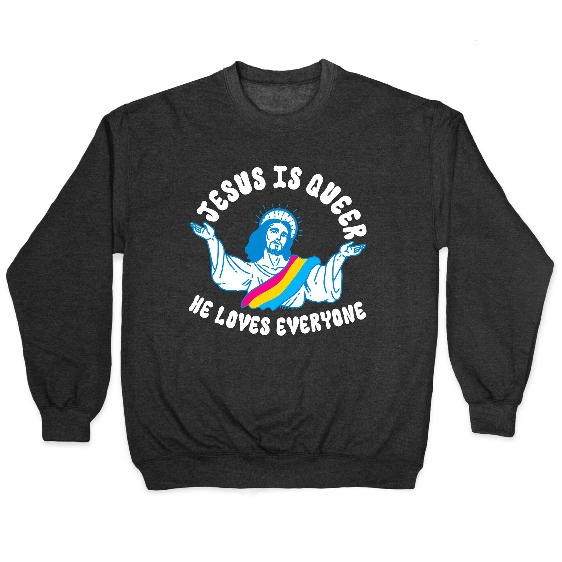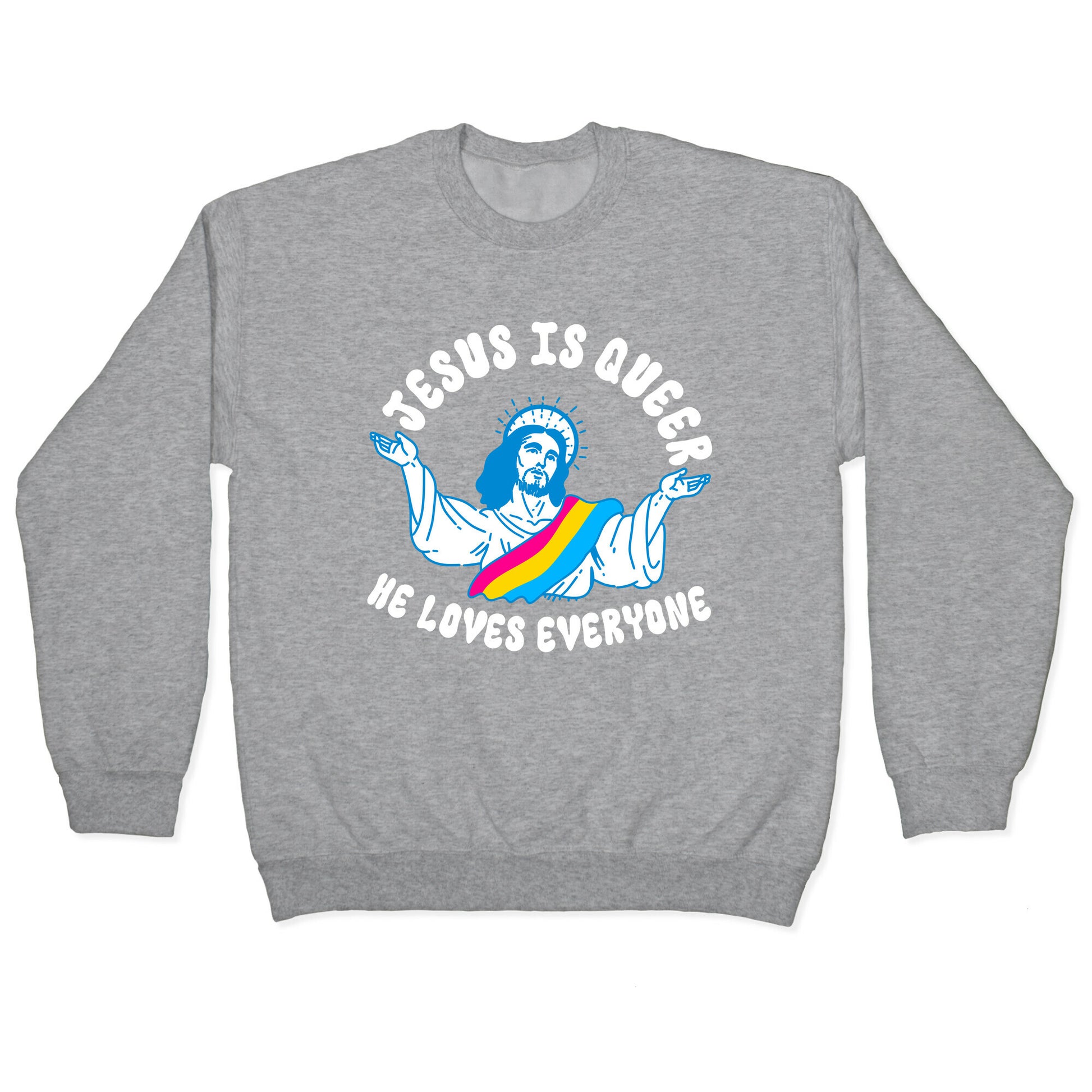 Celebrate inclusivity with our "Jesus Is Queer, He Loves Everyone" design, featuring Jesus adorned with a pan pride sash. This design spreads a powerful message of love and acceptance, emphasizing that Jesus love knows no boundaries. Perfect for those who want to showcase their faith and support for the LGBTQ+ community in a meaningful and stylish way. Our Unisex Crewneck Sweatshirt is made from a soft 8-ounce fabric, and they feature a crew neck, with sleeve and bottom hems for durability. Great for layering. Preshrunk for your convenience! Printed in the USA. Made with 50% Cotton and 50% Polyester. \