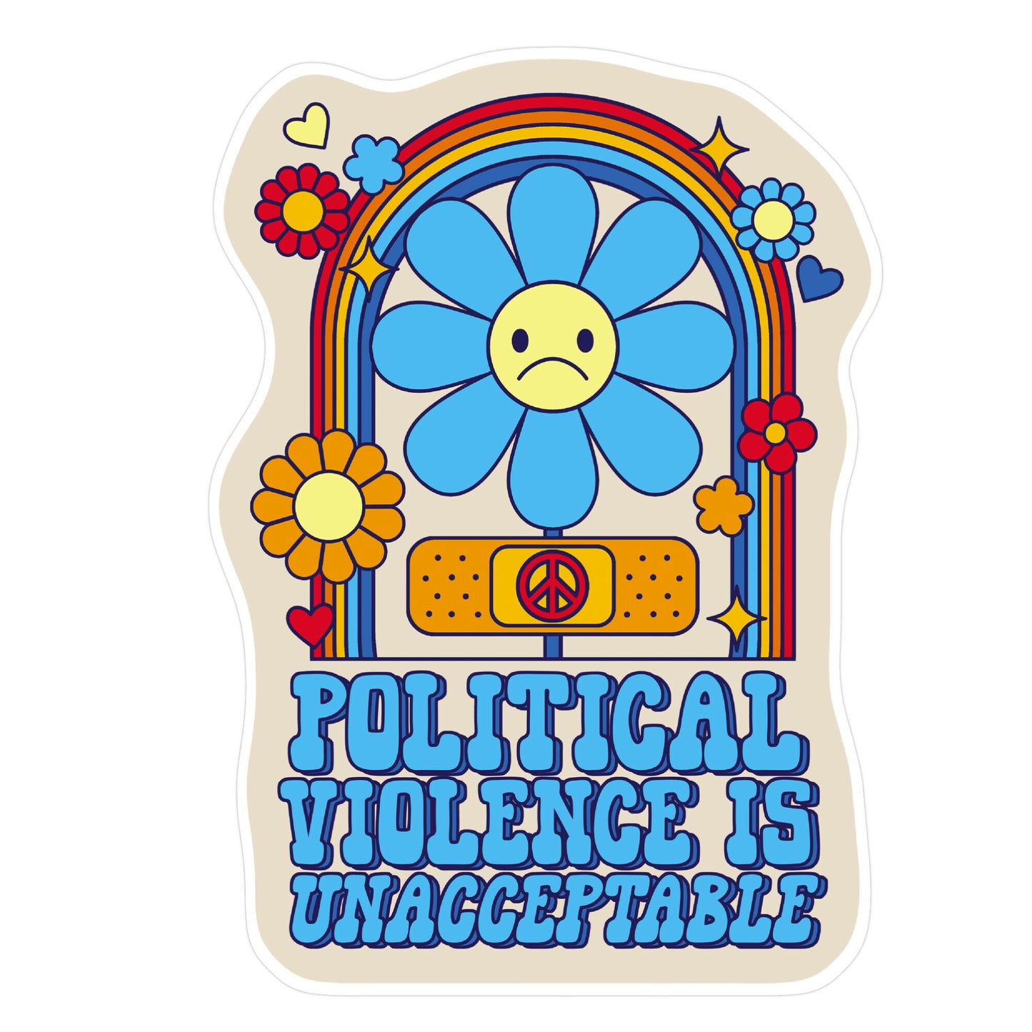 Make a powerful statement with this design featuring "Political Violence is Unacceptable" accompanied by a retro-style illustration of a flower with a band-aid. This design reflects the belief that violence is never the solution and promotes peace and understanding. Perfect for those who stand against political violence and advocate for constructive dialogue, this design combines a meaningful message with a charming, nostalgic aesthetic. Stick your personality just about anywhere with our vibrant die cut stickers! Theres no place where your passions cant shine, thats why we created our stickers to be placed on your favorite items such as: laptops, water bottles, notebooks, car bumpers, skateboards, and much more. The options are truly endless, but your interests dont have to be. Available in multiple sizes.
