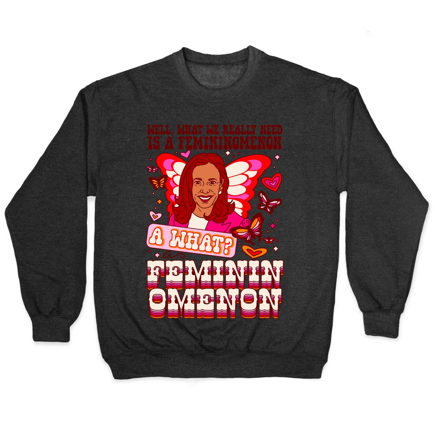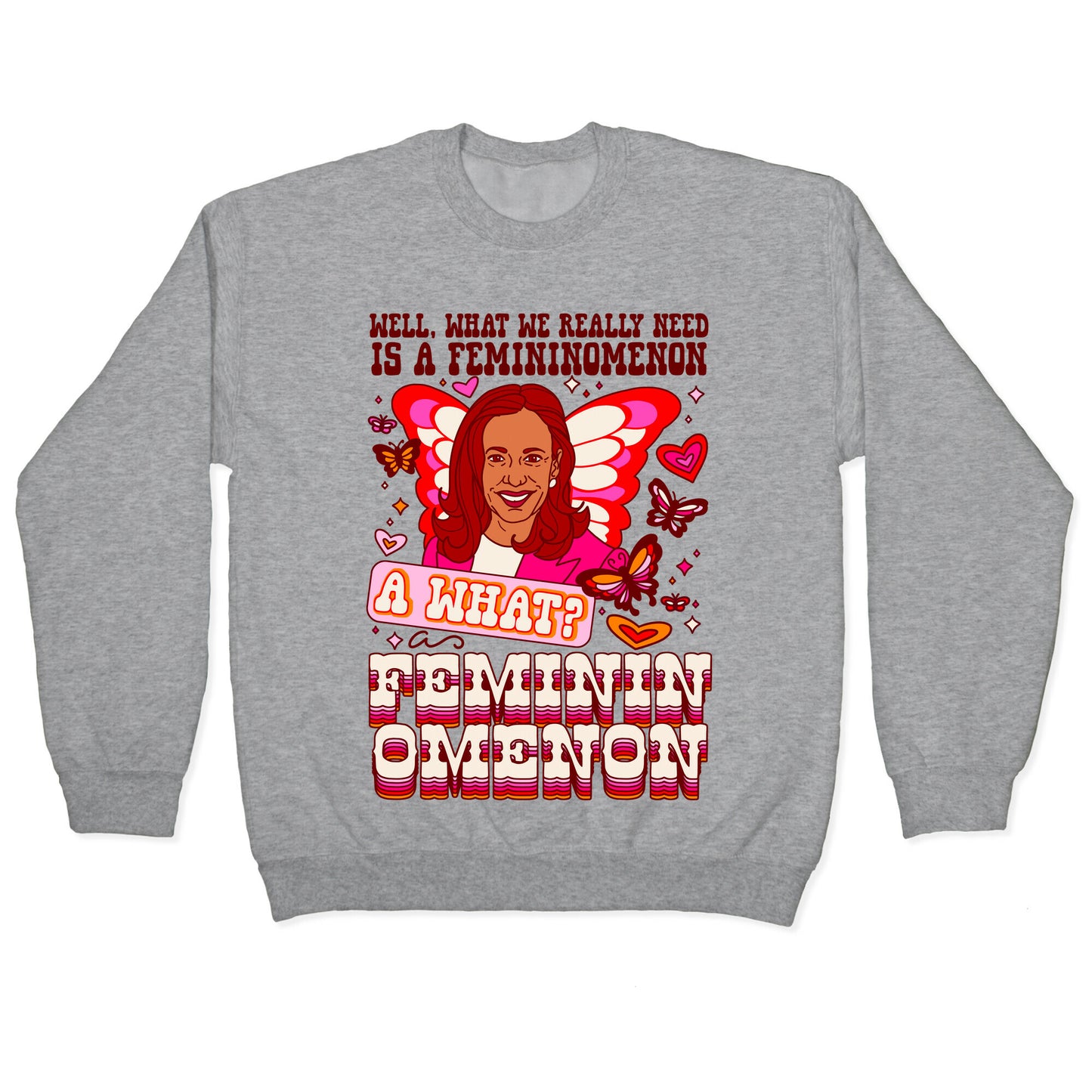 This lively and captivating illustration showcases Vice President Kamala Harris surrounded by disco cowgirl hearts and butterflies, inspired by the vibrant aesthetic of Chappell Roan. The design features the catchy lyrics from the trending viral song, "Well, what we really need is a femininomenon \(A what?\) A femininomenon." Embracing the whimsical and empowering vibe of the song, this artwork celebrates Kamala Harris as a true femininomenon. Its a fun and stylish way to show support for Kamala and the power of femininity. Our Unisex Crewneck Sweatshirt is made from a soft 8-ounce fabric, and they feature a crew neck, with sleeve and bottom hems for durability. Great for layering. Preshrunk for your convenience! Printed in the USA. Made with 50% Cotton and 50% Polyester.
