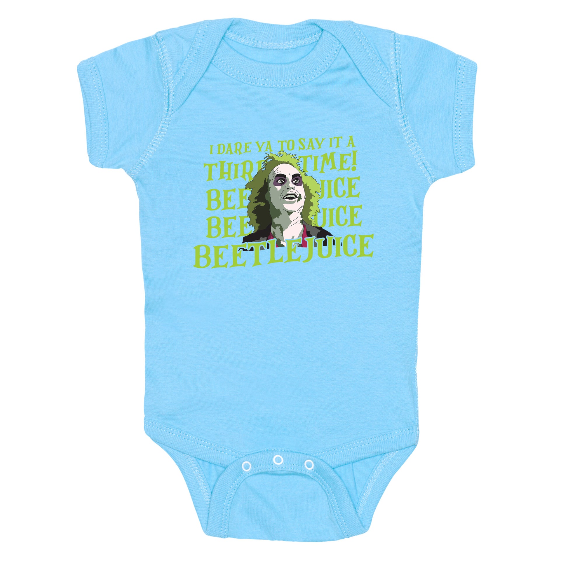 Unleash your inner mischief with this exclusive Beetlejuice shirt featuring the iconic bio-exorcist himself in all his quirky, chaotic glory! Perfect for fans of Tim Burtons dark comedy classic, this design captures Beetlejuices unforgettable look and unpredictable energy, bringing a touch of the supernatural to your wardrobe. Whether youre heading to a spooky event or just want to showcase your love for the ghost with the most, this shirt is sure to turn heads and spark conversations. Say his name three times and watch your style come to life! Our Baby One Piece is made from exceedingly soft 100% ring spun cotton. They are featured with hemmed seams and a reinforced 3 snap bottom closure for easy diaper changes. Preshrunk for your convenience! Printed in the USA. Made with 100% Ring Spun Cotton.