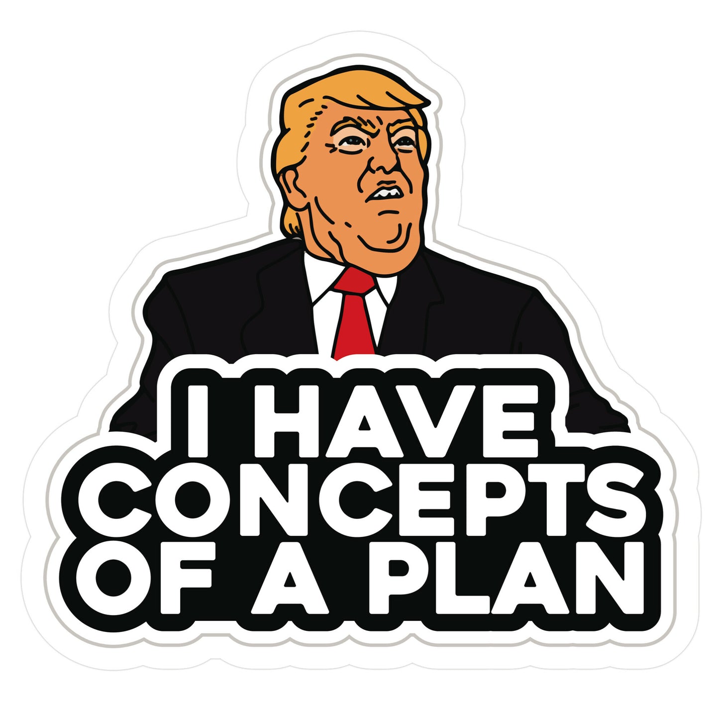 Add a touch of humor and political satire to your belongings with the "I Have Concepts of a Plan" sticker, featuring a caricature of Trump that brings a playful twist to his famously bold persona. Perfect for laptops, notebooks, or any surface that could use a little personality, this sticker is a fun way to showcase your witty side. Whether youre making a statement or just adding some light-hearted flair, this sticker is bound to spark conversations and smiles wherever it goes. Stick your personality just about anywhere with our vibrant die cut stickers! Theres no place where your passions cant shine, thats why we created our stickers to be placed on your favorite items such as: laptops, water bottles, notebooks, car bumpers, skateboards, and much more. The options are truly endless, but your interests dont have to be. Available in multiple sizes.
