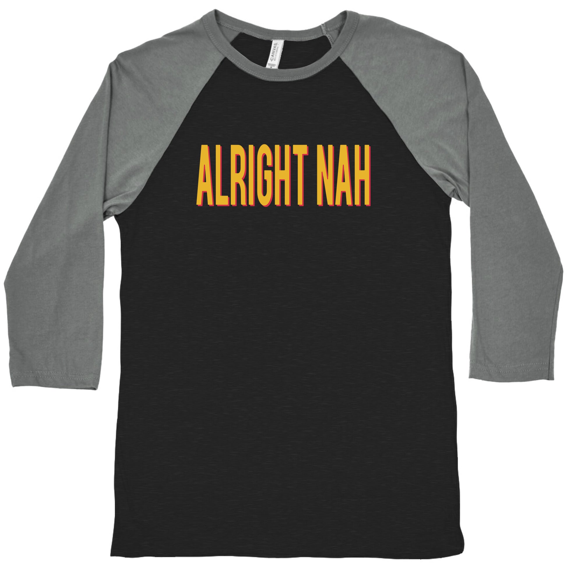 Get ready to rep your favorite tight end in style with this bold and energetic "Alright Nah" shirt, inspired by Travis Kelces signature catchphrase. Perfect for die-hard fans, this design captures the fun, confidence, and unstoppable spirit that Kelce brings to the field and beyond. Whether youre tailgating or catching the game with friends, this shirt is a playful nod to Kelces larger-than-life personality, making it a must-have for anyone who loves football, flair, and a good catchphrase. Our exceedingly soft and relaxed fit Tri-Blend Baseball Tee features a three-quarter length sleeve, crew neck, fun contrasting color sleeves and neck trim. Preshrunk for your convenience! Printed in the USA. Made with 50% Polyester, 25% Cotton and 25% Rayon