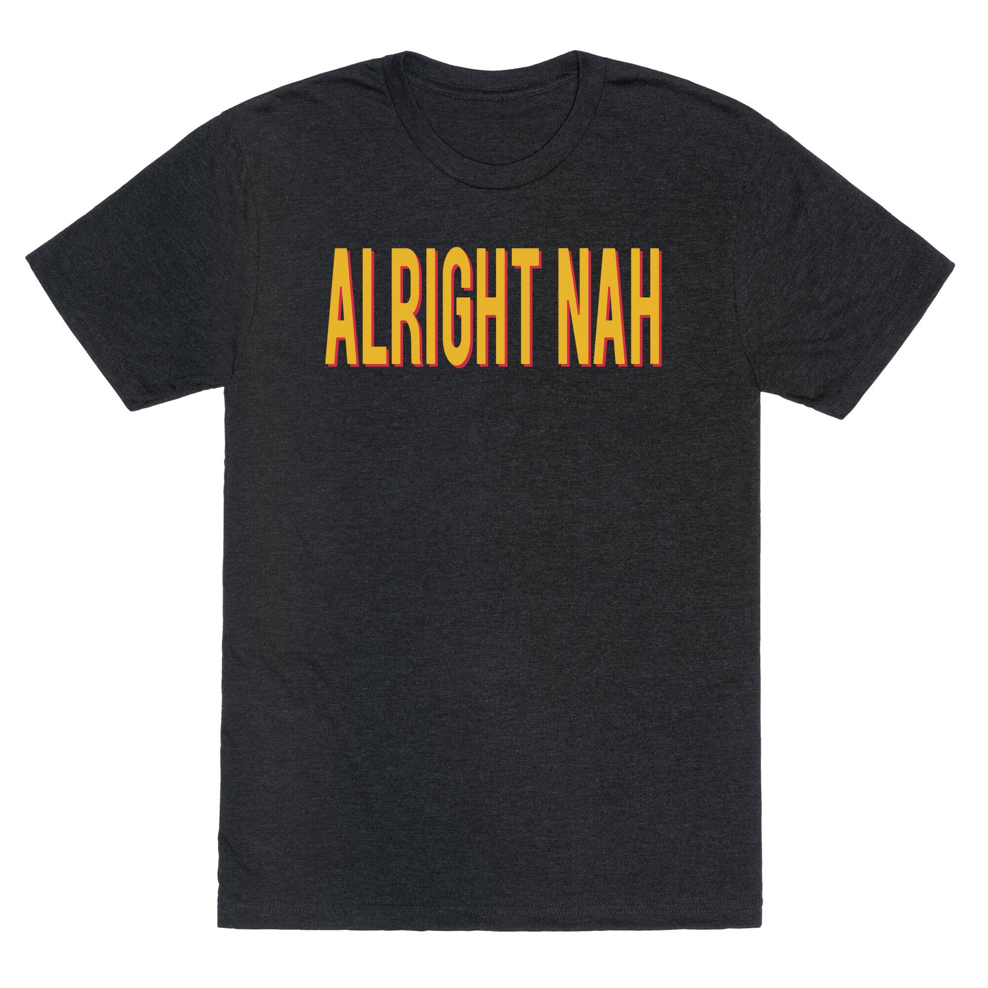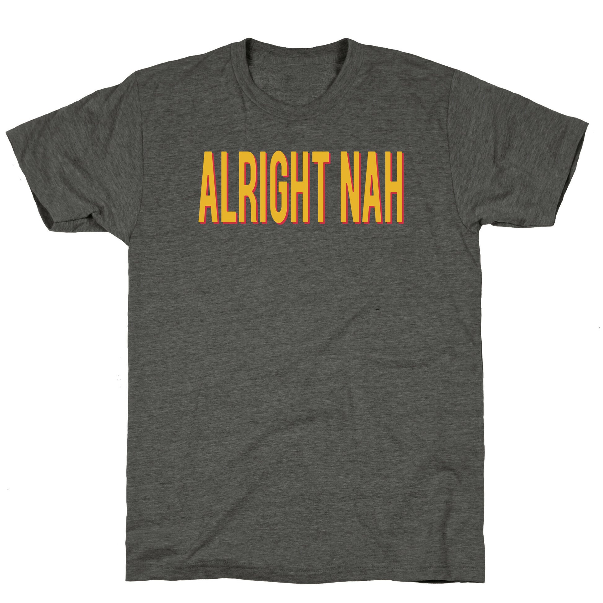 Get ready to rep your favorite tight end in style with this bold and energetic "Alright Nah" shirt, inspired by Travis Kelces signature catchphrase. Perfect for die-hard fans, this design captures the fun, confidence, and unstoppable spirit that Kelce brings to the field and beyond. Whether youre tailgating or catching the game with friends, this shirt is a playful nod to Kelces larger-than-life personality, making it a must-have for anyone who loves football, flair, and a good catchphrase. Our fitted Unisex Tri-Blend Tees are made with a soft tri-blend fabric. Featuring a crew neckline with sleeve and bottom hems for durability, these Tees look and feel great. Preshrunk for your convenience! Printed in the USA. Made with 50% Polyester, 25% Ring Spun Cotton, and 25% Rayon.