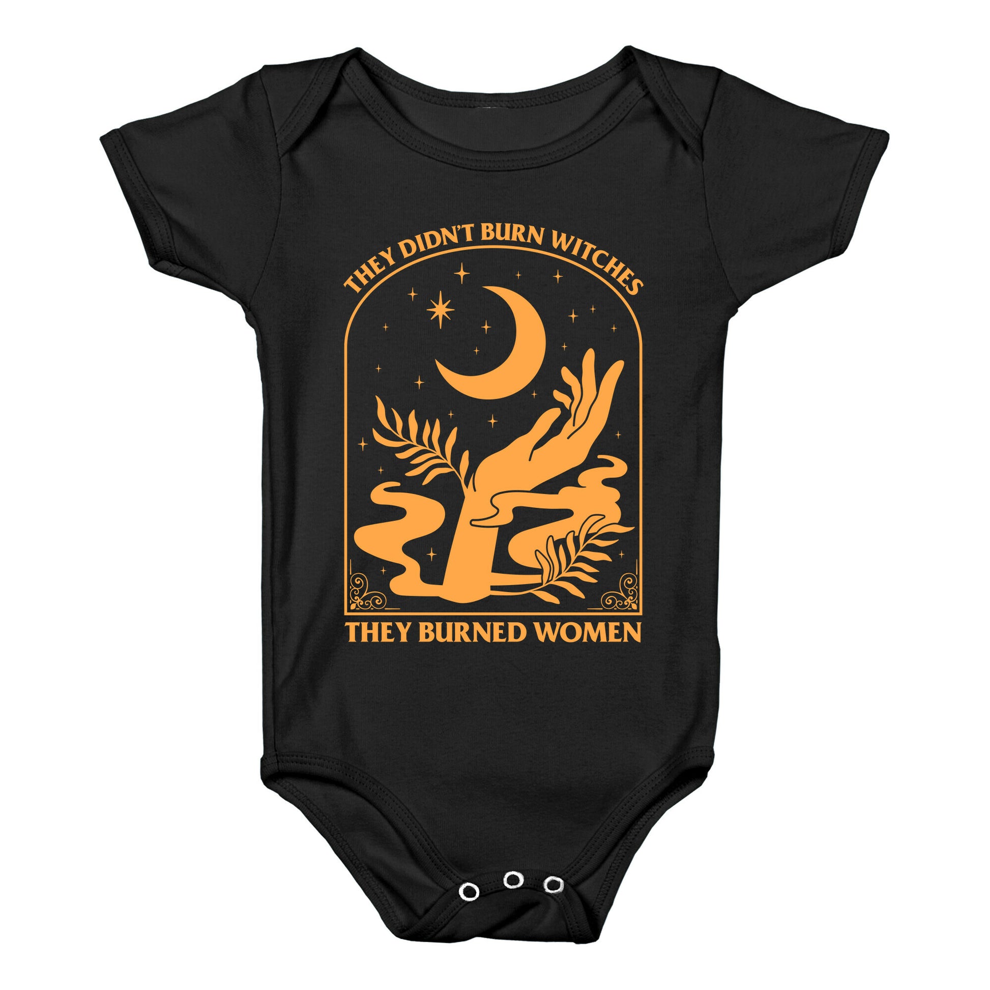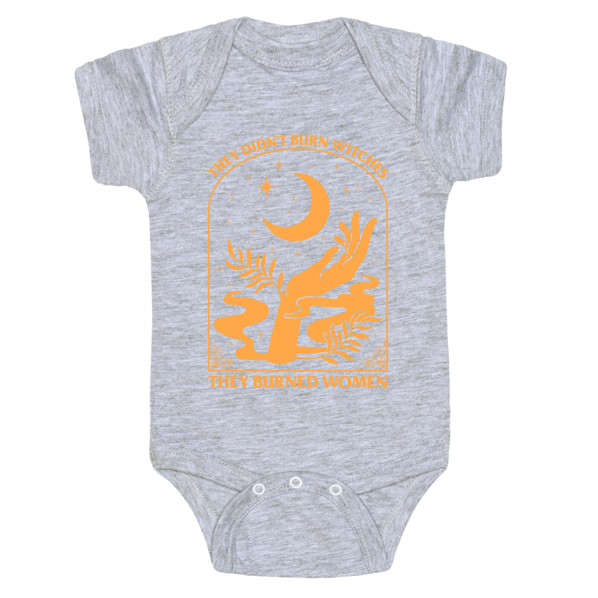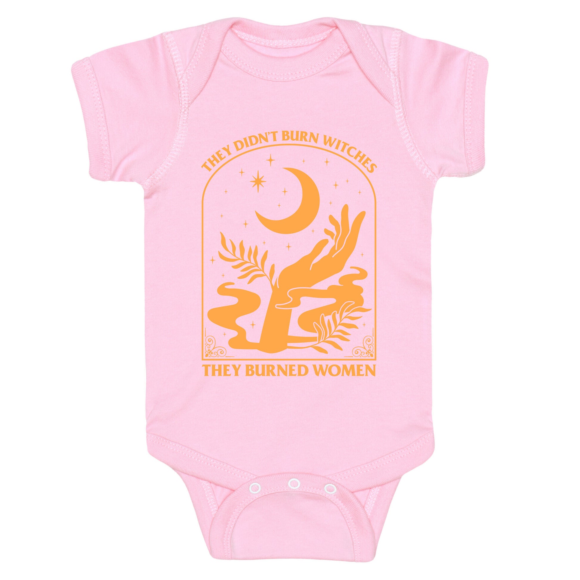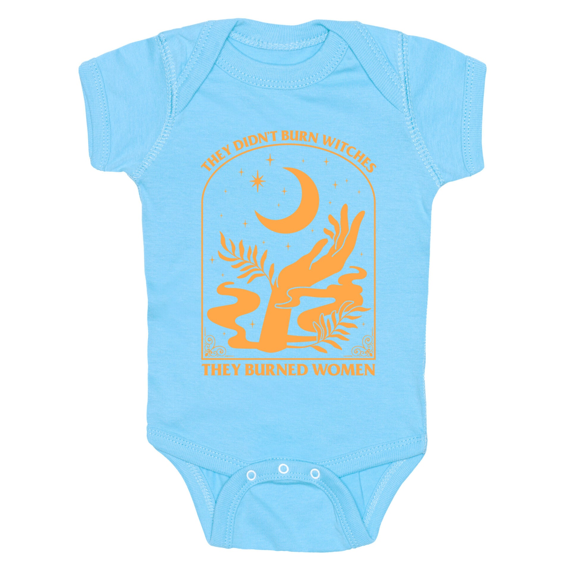 Make a bold statement with this thought-provoking design: "They Didnt Burn Witches, They Burned Women." This shirt challenges historical narratives, sparking conversations about injustice, power, and the strength of women through the ages. Whether youre passionate about history, womens rights, or advocating for truth, this shirt serves as a powerful reminder to rethink the past and inspire change for the future. Wear it to raise awareness and champion the voices that have been silenced. Our Baby One Piece is made from exceedingly soft 100% ring spun cotton. They are featured with hemmed seams and a reinforced 3 snap bottom closure for easy diaper changes. Preshrunk for your convenience! Printed in the USA. Made with 100% Ring Spun Cotton.