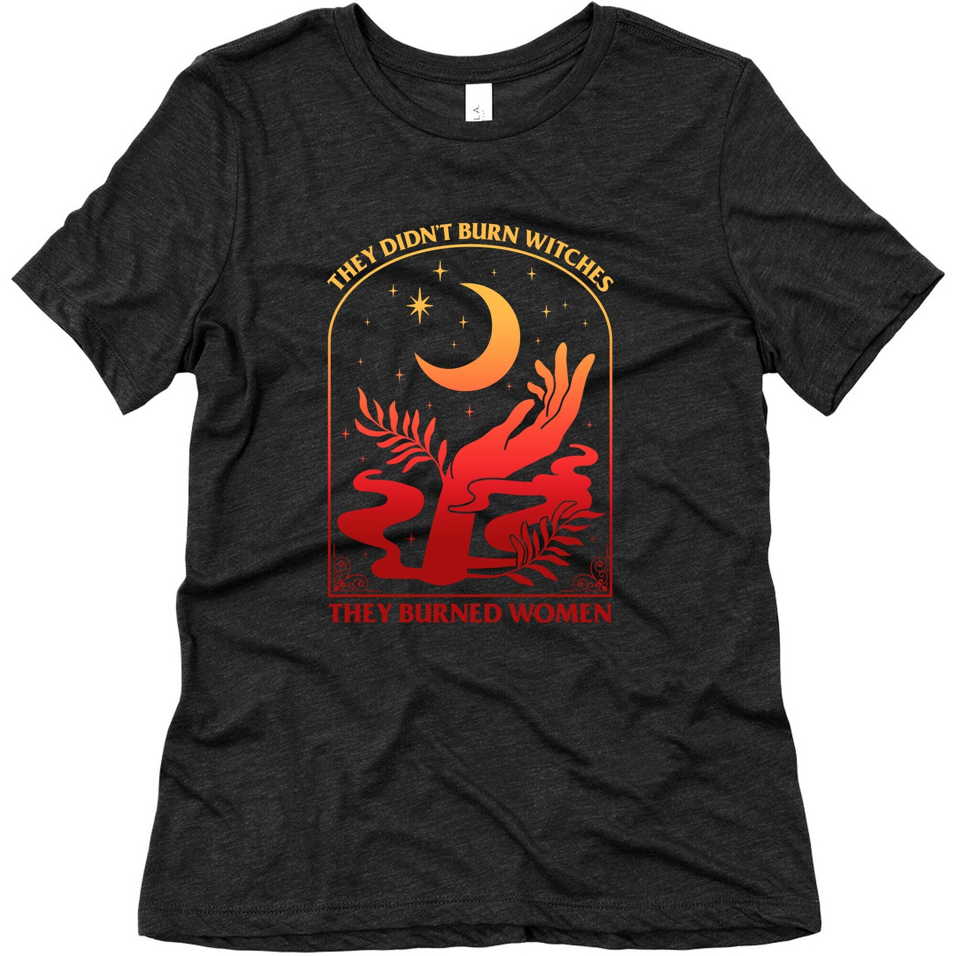 Make a bold statement with this thought-provoking design: "They Didnt Burn Witches, They Burned Women." This shirt challenges historical narratives, sparking conversations about injustice, power, and the strength of women through the ages. Whether youre passionate about history, womens rights, or advocating for truth, this shirt serves as a powerful reminder to rethink the past and inspire change for the future. Wear it to raise awareness and champion the voices that have been silenced. Our slim fit Women’s Tri-Blend Tees feature a soft tri-blend fabric, relaxed neckline with sleeve and bottom hems for durability. Preshrunk for your convenience! Printed in the USA. Made with 50% Polyester, 25% Ring Spun Cotton, and 25% Rayon.