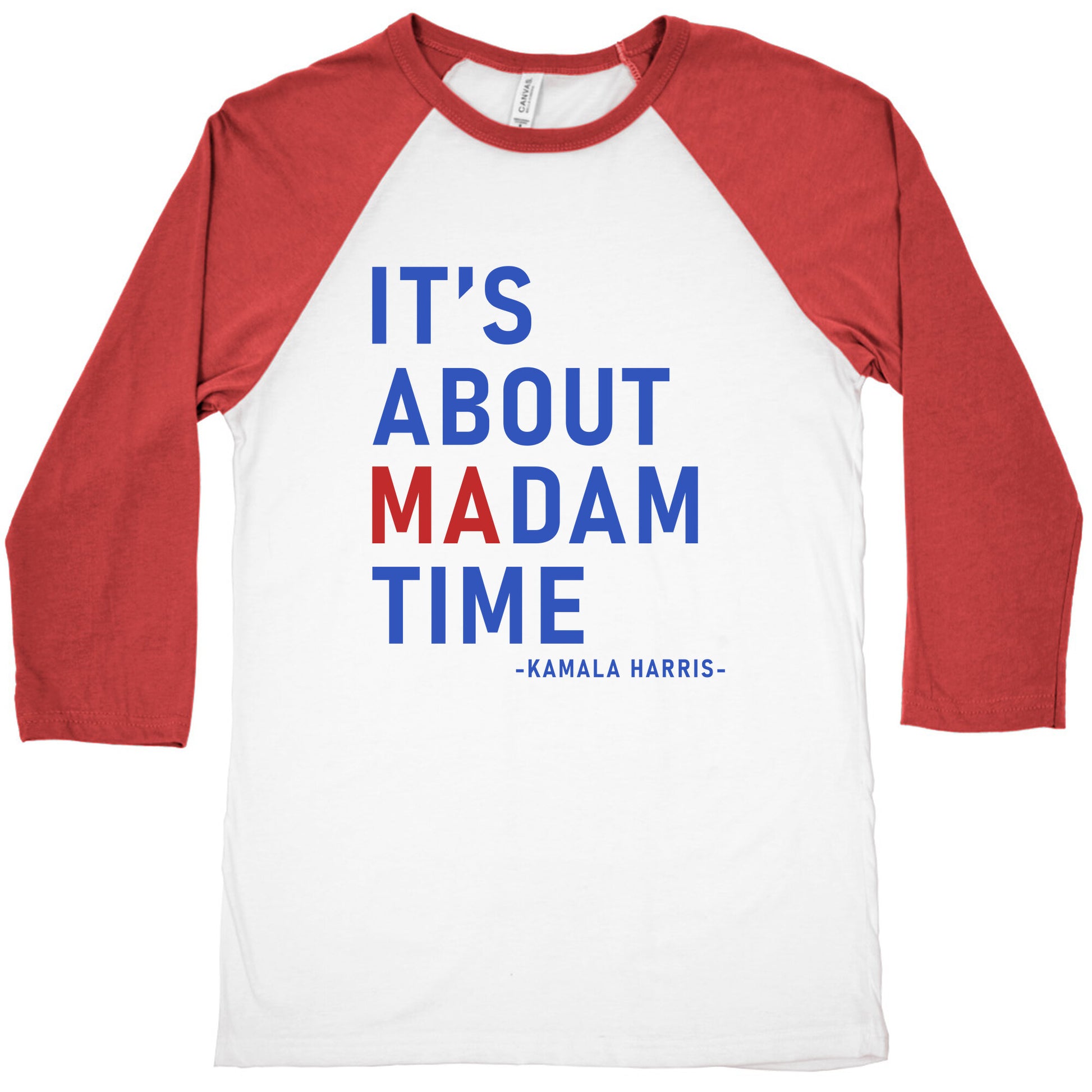 Make a bold statement with our "Its About Madam Time - Kamala Harris" shirt, celebrating the historic moment when Kamala Harris broke barriers and made history. This empowering design serves as a tribute to resilience, leadership, and the unstoppable force of women rising to the highest ranks. Perfect for those who believe in progress and equality, this shirt is not just apparel—its a reminder that the time for change is now, and the future is female. Wear it proudly to show your support for trailblazing women everywhere! Our exceedingly soft and relaxed fit Tri-Blend Baseball Tee features a three-quarter length sleeve, crew neck, fun contrasting color sleeves and neck trim. Preshrunk for your convenience! Printed in the USA. Made with 50% Polyester, 25% Cotton and 25% Rayon