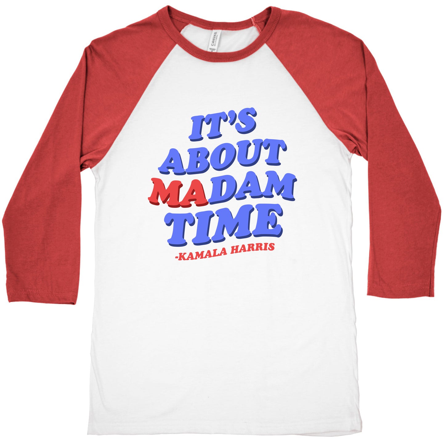Make a bold statement with our "Its About Madam Time - Kamala Harris" shirt, celebrating the historic moment when Kamala Harris broke barriers and made history. This empowering design serves as a tribute to resilience, leadership, and the unstoppable force of women rising to the highest ranks. Perfect for those who believe in progress and equality, this shirt is not just apparel—its a reminder that the time for change is now, and the future is female. Wear it proudly to show your support for trailblazing women everywhere! Our exceedingly soft and relaxed fit Tri-Blend Baseball Tee features a three-quarter length sleeve, crew neck, fun contrasting color sleeves and neck trim. Preshrunk for your convenience! Printed in the USA. Made with 50% Polyester, 25% Cotton and 25% Rayon