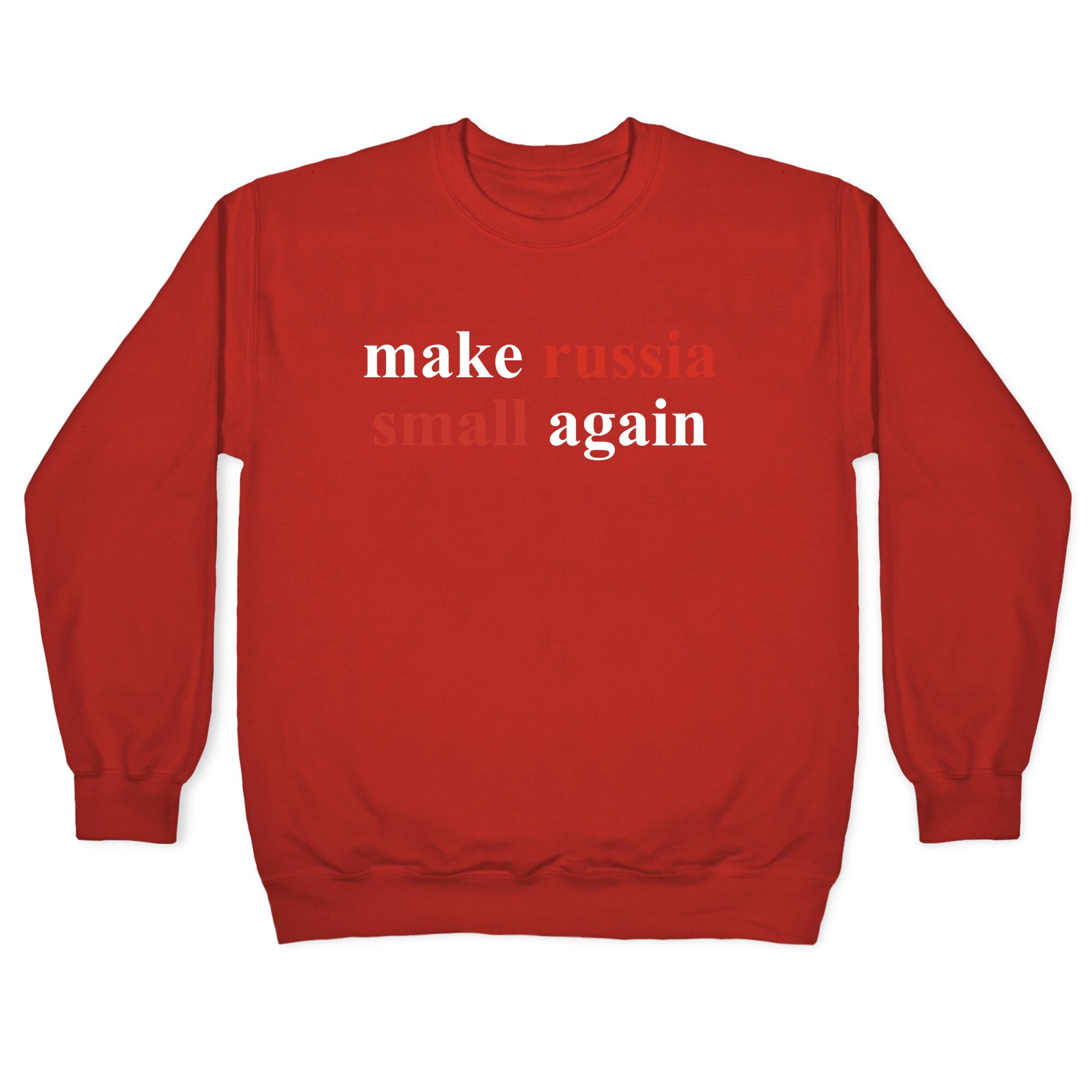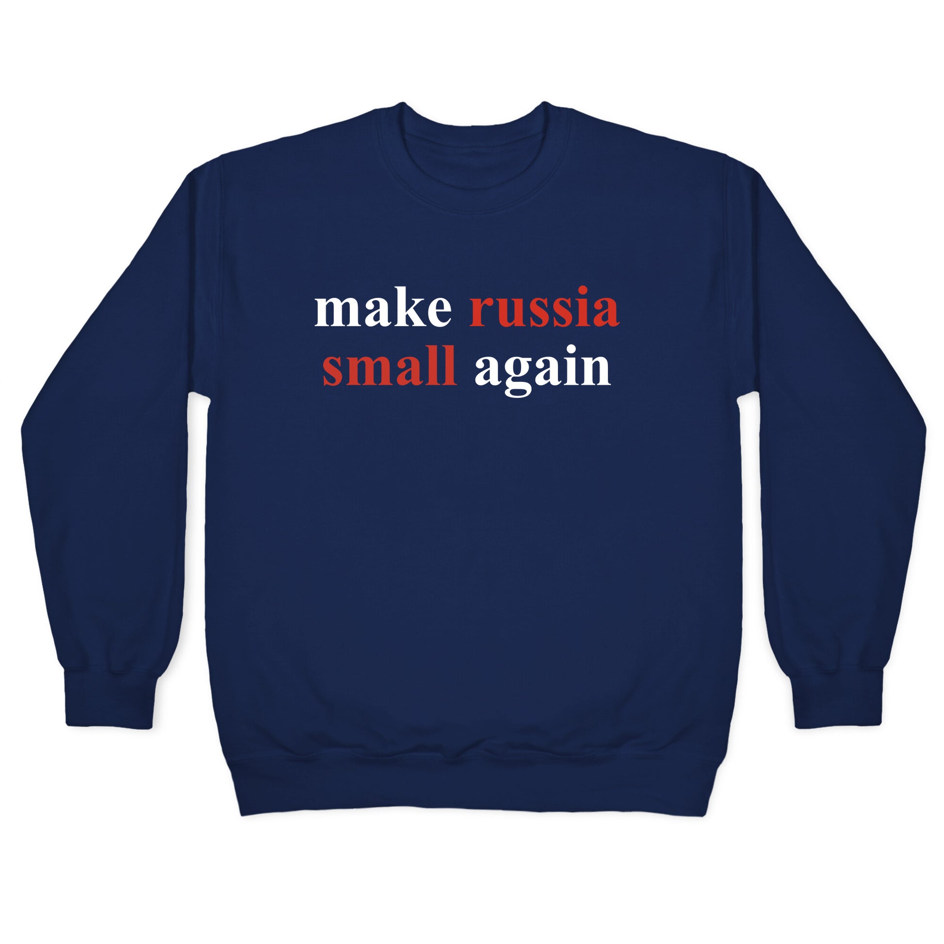 Turn heads and make a statement with the "Make Russia Small Again" design – inspired by President Zelensky himself! This bold design is perfect for those who stand with Ukraine, support democracy, and arent afraid to call out the big bullies on the world stage. Whether youre joining the movement or simply showing solidarity, this shirt will spark conversations and let your values shine. Our Unisex Crewneck Sweatshirt is made from a soft 8-ounce fabric, and they feature a crew neck, with sleeve and bottom hems for durability. Great for layering. Preshrunk for your convenience! Printed in the USA. Made with 50% Cotton and 50% Polyester.