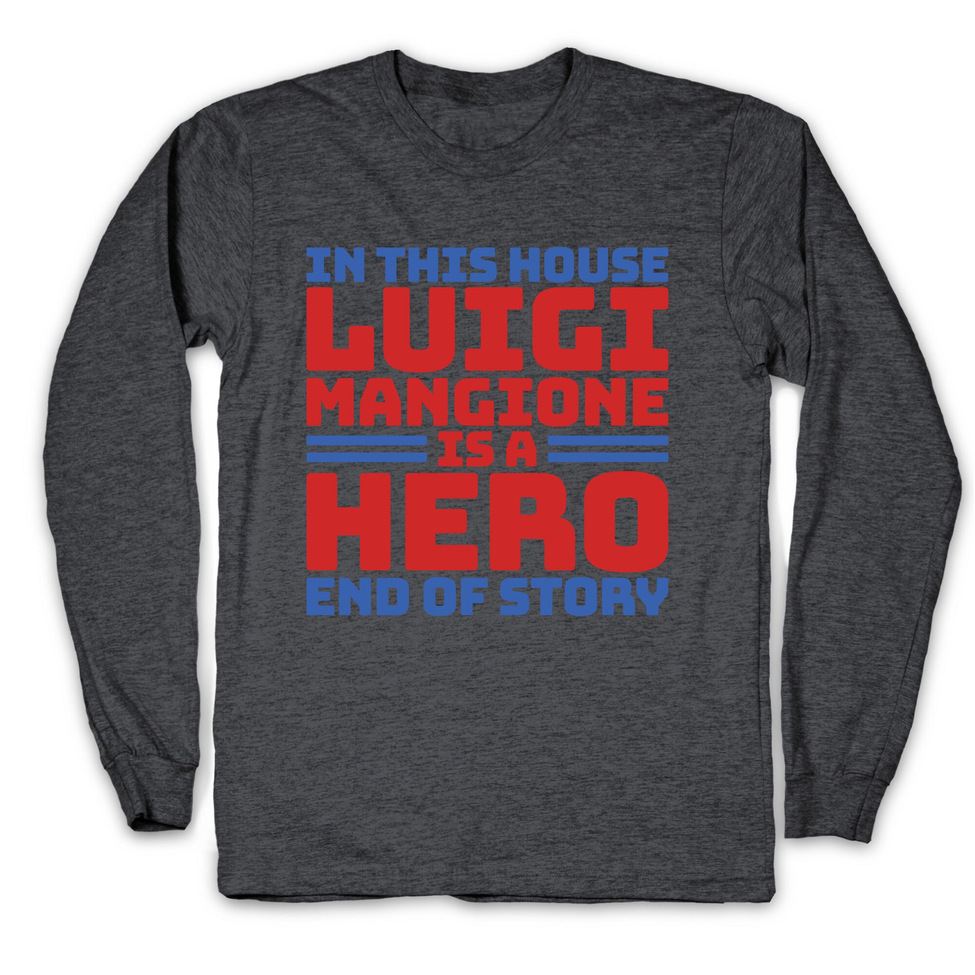Show your support for Luigi Mangione and stand boldly against a broken healthcare system with this empowering statement piece. Wear it as a symbol of resilience and a call for change, championing fairness and integrity for all. Our Unisex Long Sleeve Tee is made from a soft 100% cotton jersey knit. It features a crew neckline with ribbed cuffs and hemmed bottom for durability. Preshrunk for your convenience! Printed in the USA. Athletic Gray is made up of 90% cotton and 10% polyester.