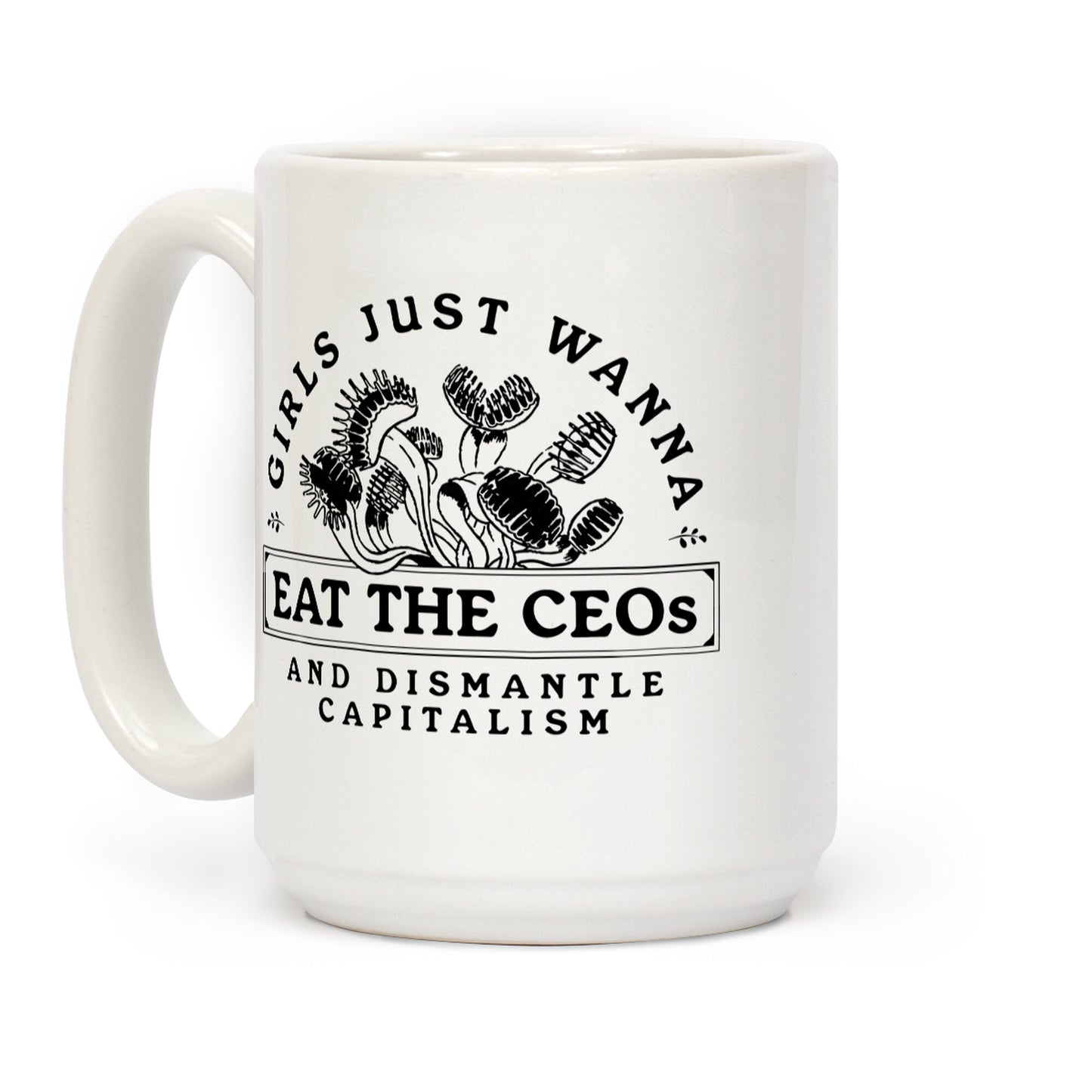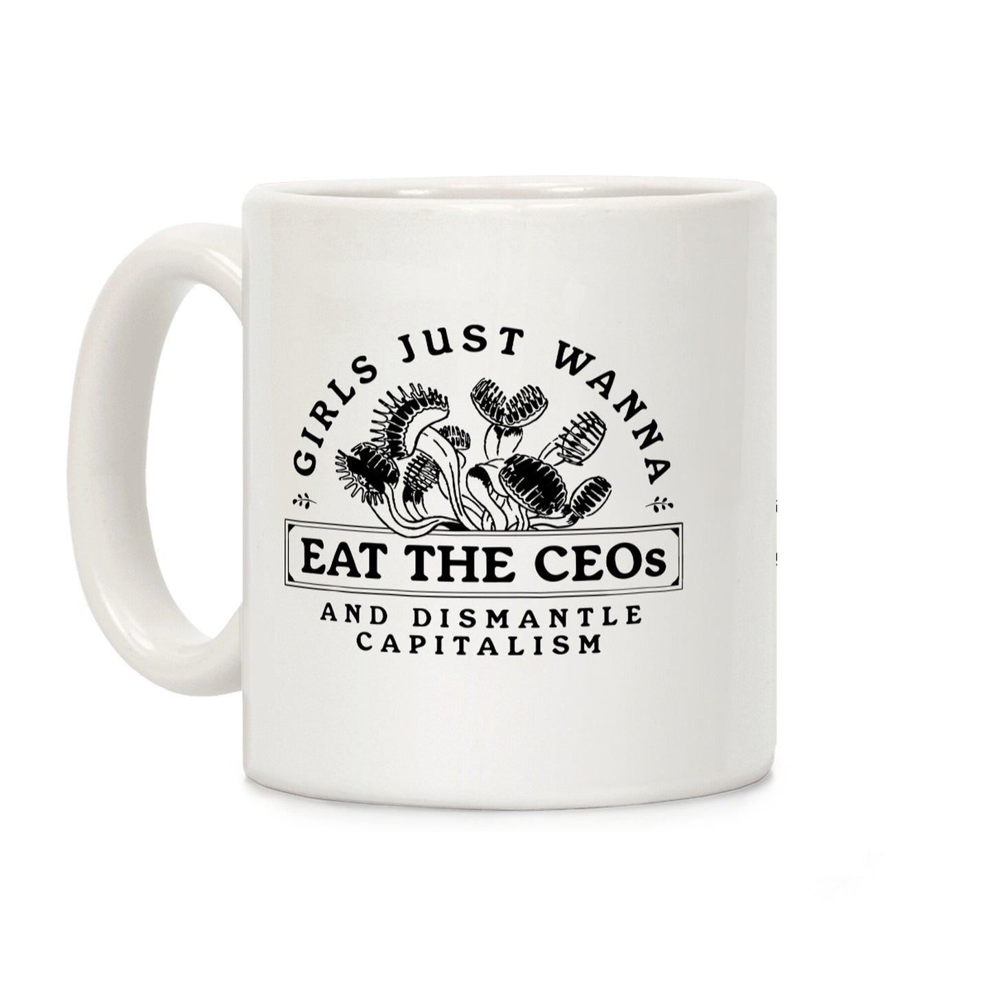 Sip your morning coffee with a side of wit and rebellion with this "Girls Just Wanna Eat The CEOs" design. Perfect for sparking conversations and serving up a dose of humor with every brew. Our 11-ounce Mug features large handles for easy gripping and a wrap-around print. These heavy-duty Mugs are both dishwasher and microwave safe. Printed in the USA.