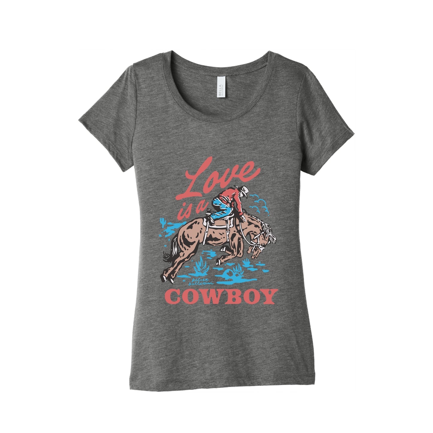 Embrace the heartfelt essence of country romance with this exclusive Love Is A Cowboy design inspired by Kelsea Ballerinis soulful storytelling. Perfect for fans who want to carry a piece of her music wherever they go, this shirt captures the spirit of love, freedom, and timeless melodies. Our slim fit Women’s Tri-Blend Tees feature a soft tri-blend fabric, relaxed neckline with sleeve and bottom hems for durability. Preshrunk for your convenience! Printed in the USA. Made with 50% Polyester, 25% Ring Spun Cotton, and 25% Rayon.