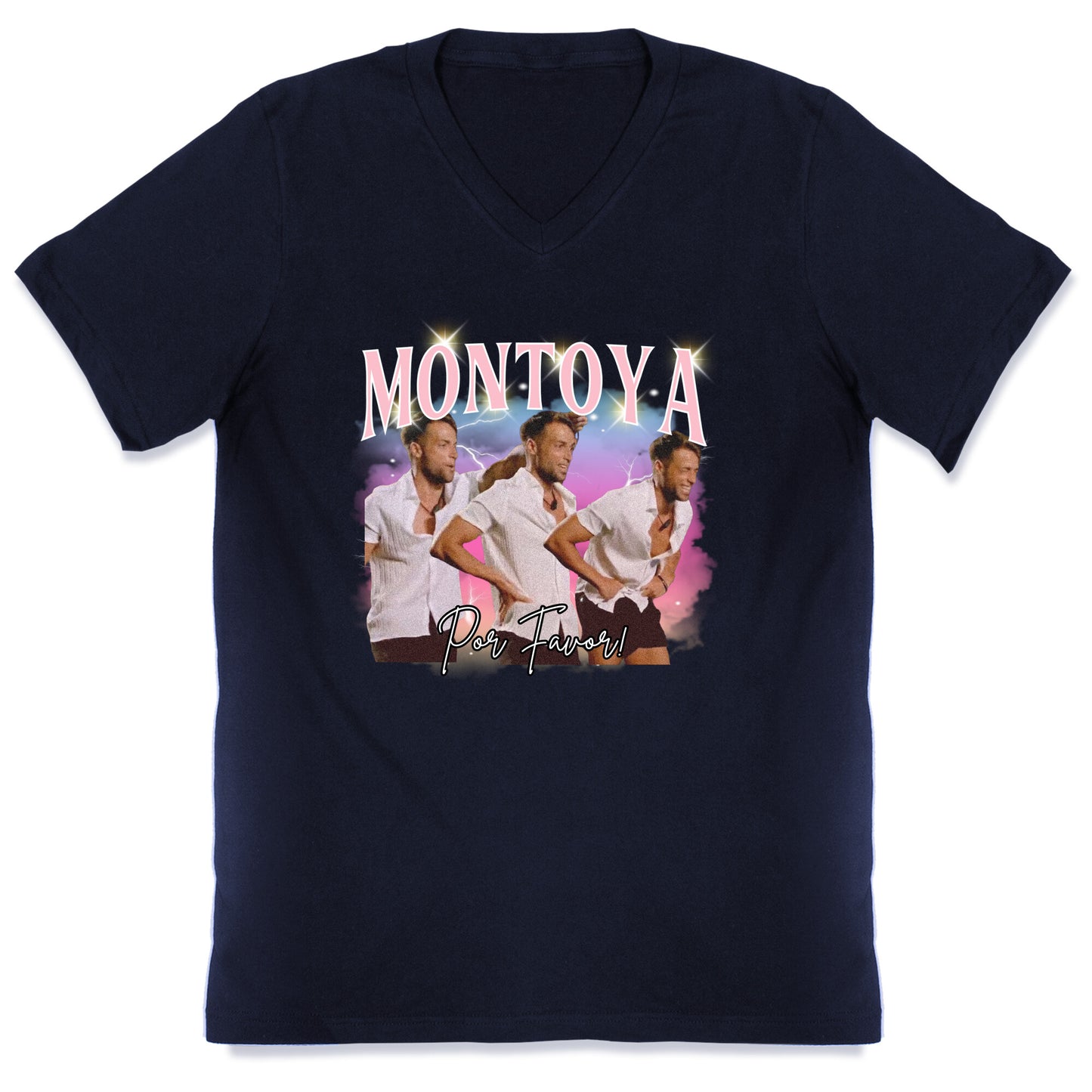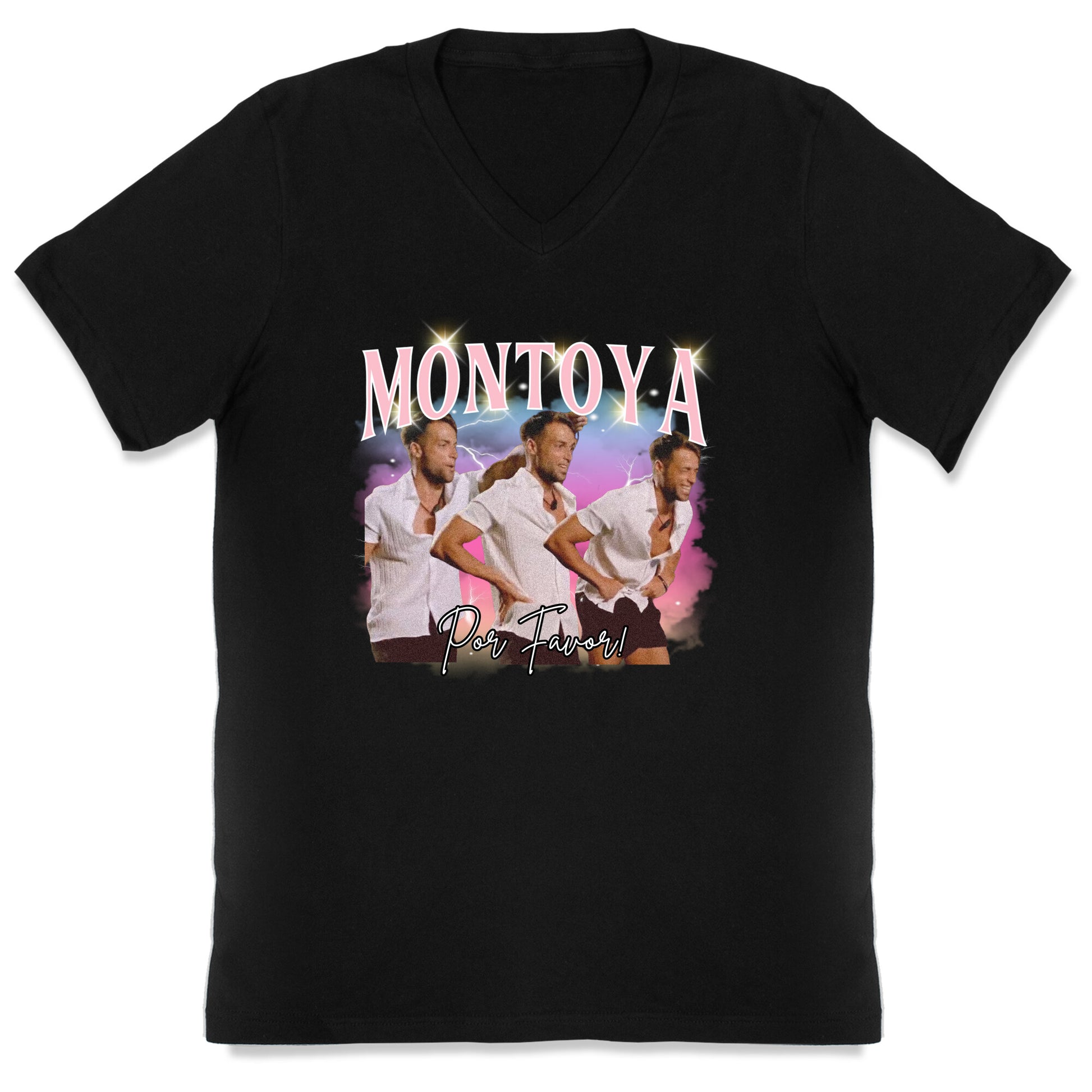 When life gets way too dramatic, channel the chaos with this "Montoya, Por Favor" teeperfect for those moments when youre sprinting headfirst into bad decisions. Inspired by the viral reality TV meltdown, this shirt lets everyone know youre embracing the drama with style. Our fitted Mens V-Neck tees are made with a soft jersey fabric. They feature a v-neckline, with sleeve and bottom hems for durability. Preshrunk for your convenience! Printed in the USA. Solid colors made with 100% Cotton and otherwise 90% Cotton and 10% Polyester.