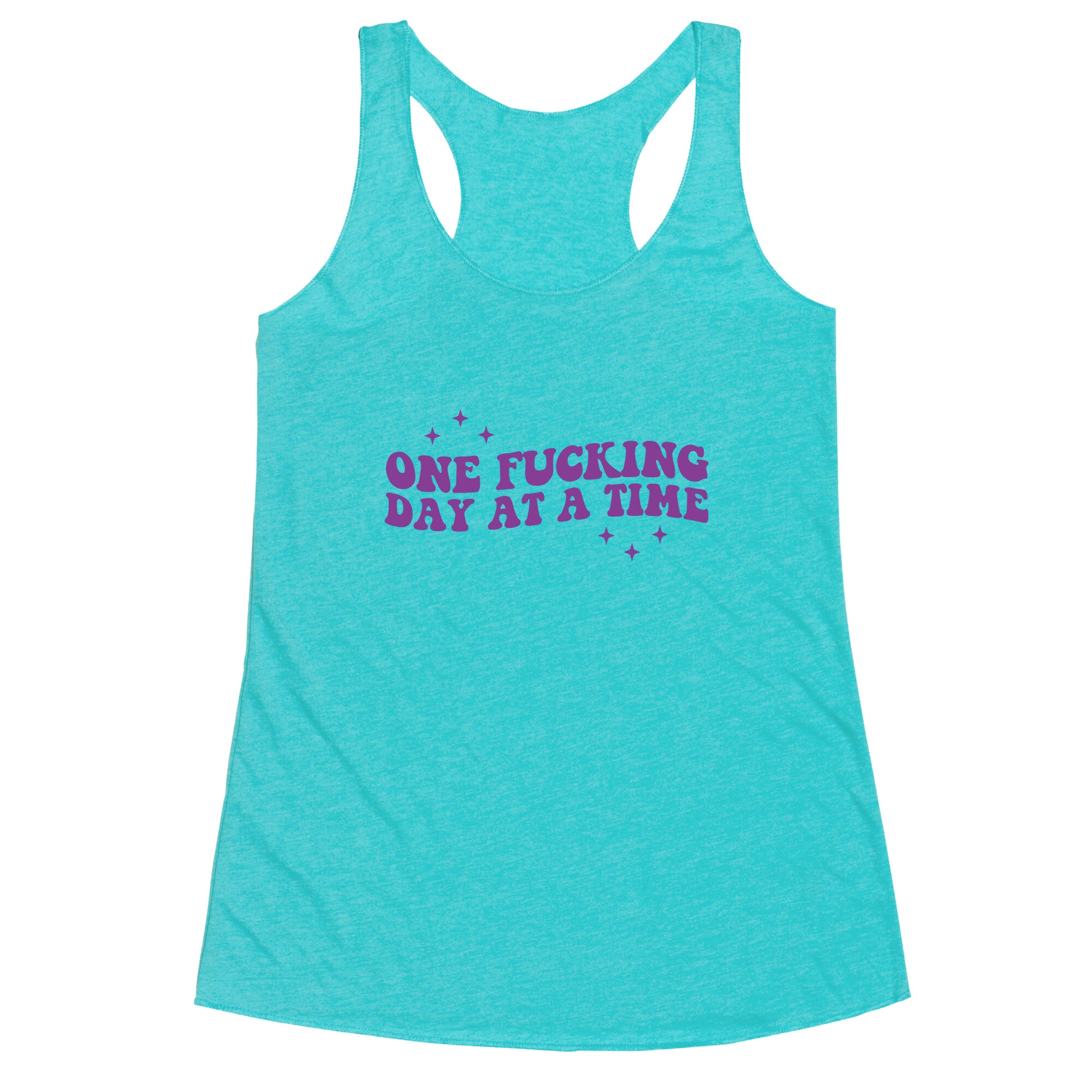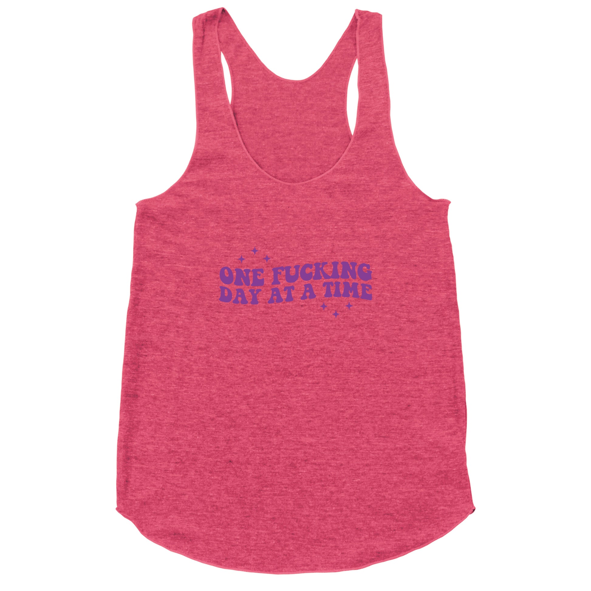 Stay resilient and unapologetic with this bold statement tee, reminding you to tackle life One F\*\*ing Day at a Time\*. Wear it as a daily mantra, a battle cry, or simply a vibebecause some days, thats the only way forward. Our super comfortable Womens Raw Edge Racerback features a soft tri-blend, unhemmed fabric, with a fashionable bell-like shape for the bottom. Preshrunk for your convenience! Printed in the USA. Made with 50% Polyester 25% Ring Spun Cotton, and 25% Rayon.