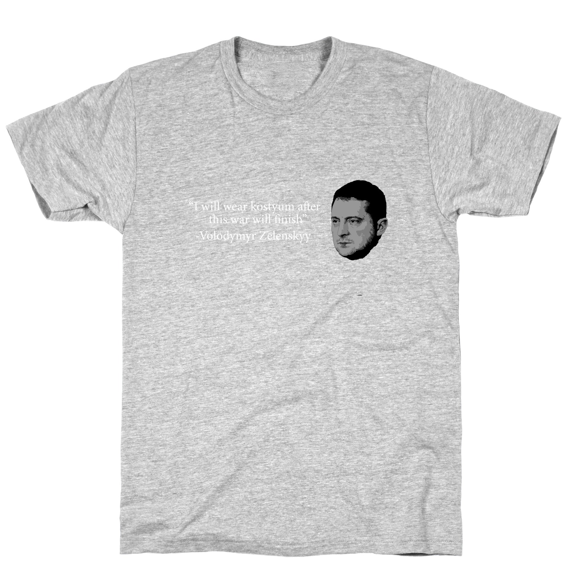Show your support with this bold Zelenskyy-inspired design, capturing the resilience and leadership of a modern hero. A statement piece for those who stand with courage, unity, and unwavering determination. Our fitted Unisex Cotton tee is made from an exceedingly soft 100% ring spun cotton. It features a crew neckline with hemmed sleeves and bottom for durability. Preshrunk for your convenience! Printed in the USA. Made with 100% Ring Spun Cotton. Athletic Gray is made up of 90% cotton and 10% polyester. Other heathered colors are made of 52% cotton and 48% polyester.