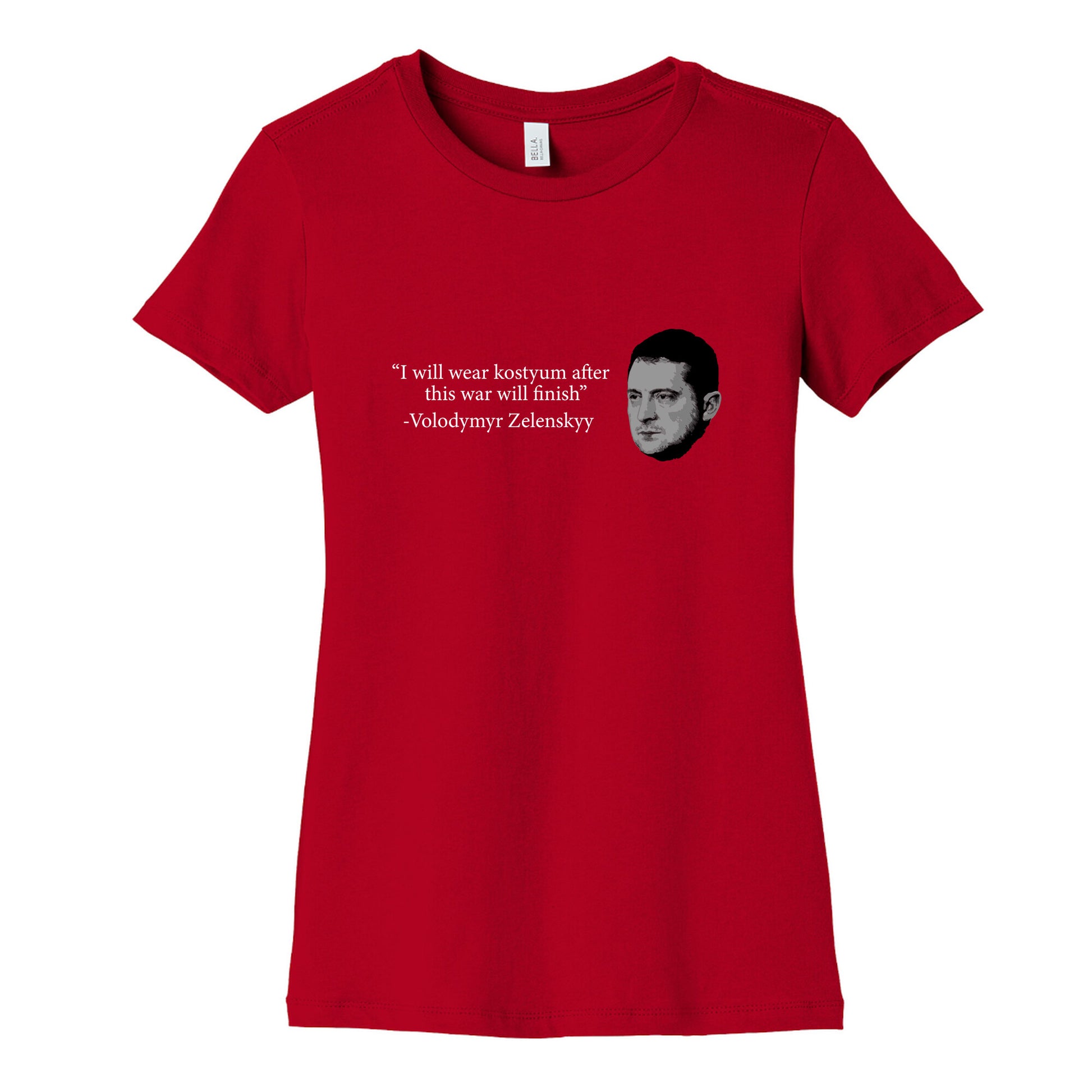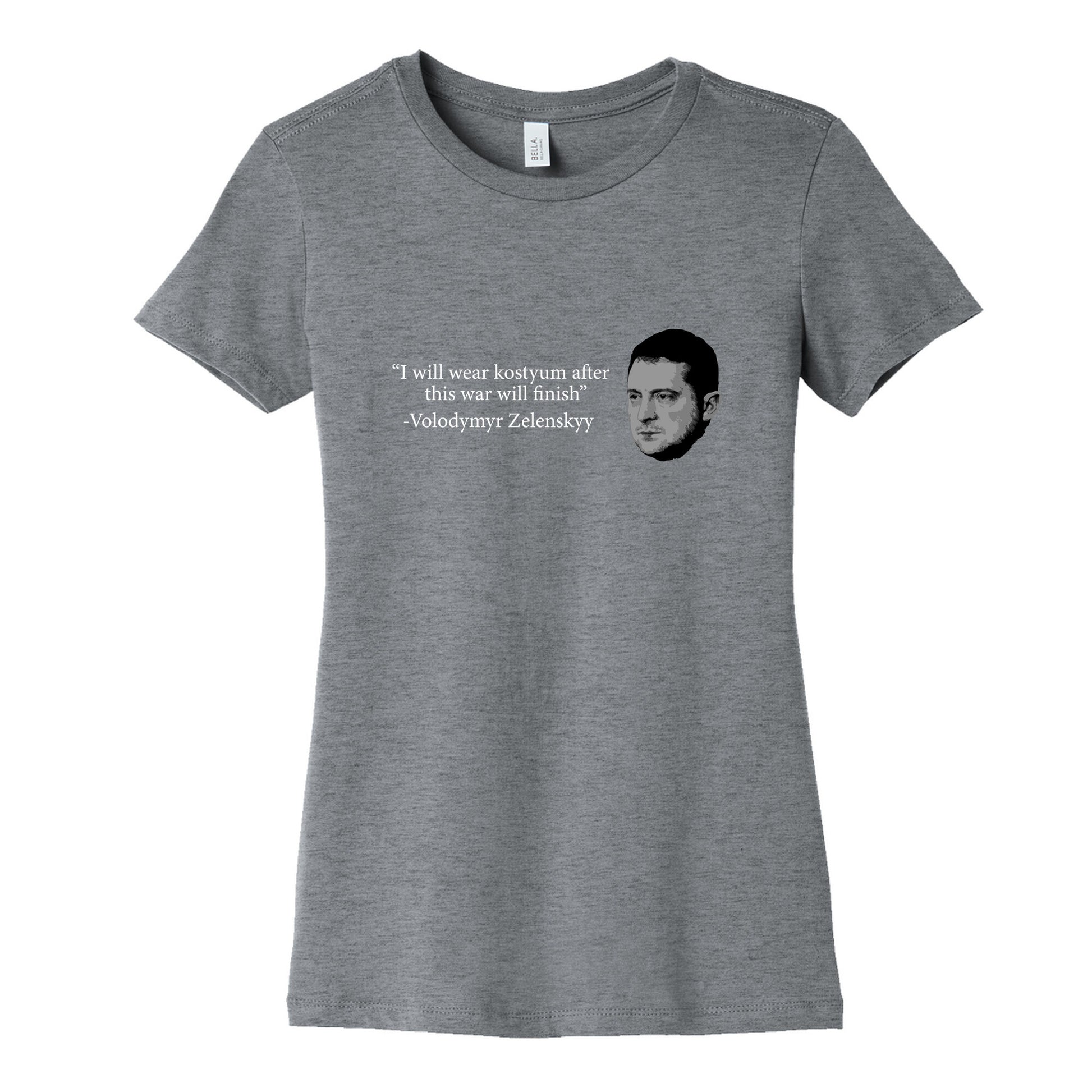 Show your support with this bold Zelenskyy-inspired design, capturing the resilience and leadership of a modern hero. A statement piece for those who stand with courage, unity, and unwavering determination. Our slim fit Womens Cotton Tees, are made with exceedingly soft 100% cotton. They feature a relaxed neckline, and the sleeves and bottom, are hemmed for durability. Preshrunk for your convenience! Printed in the USA. Made with 100% Cotton. Colors such as gray, is made up of 90% cotton and 10% polyester, and deep pink is made up of 50% cotton and 50% polyester.