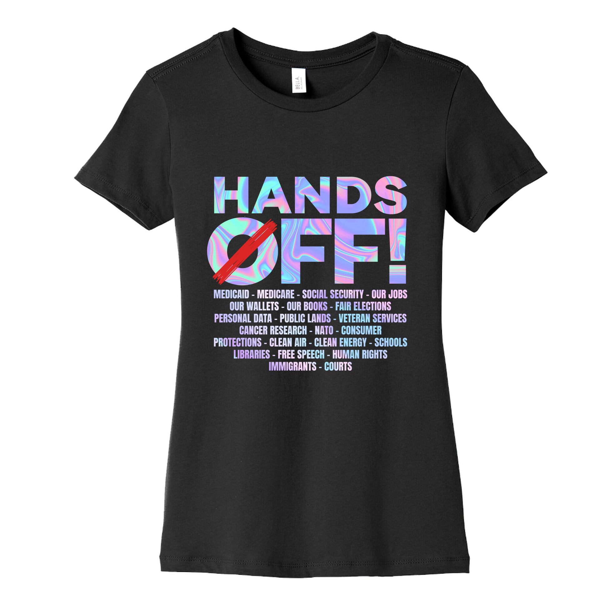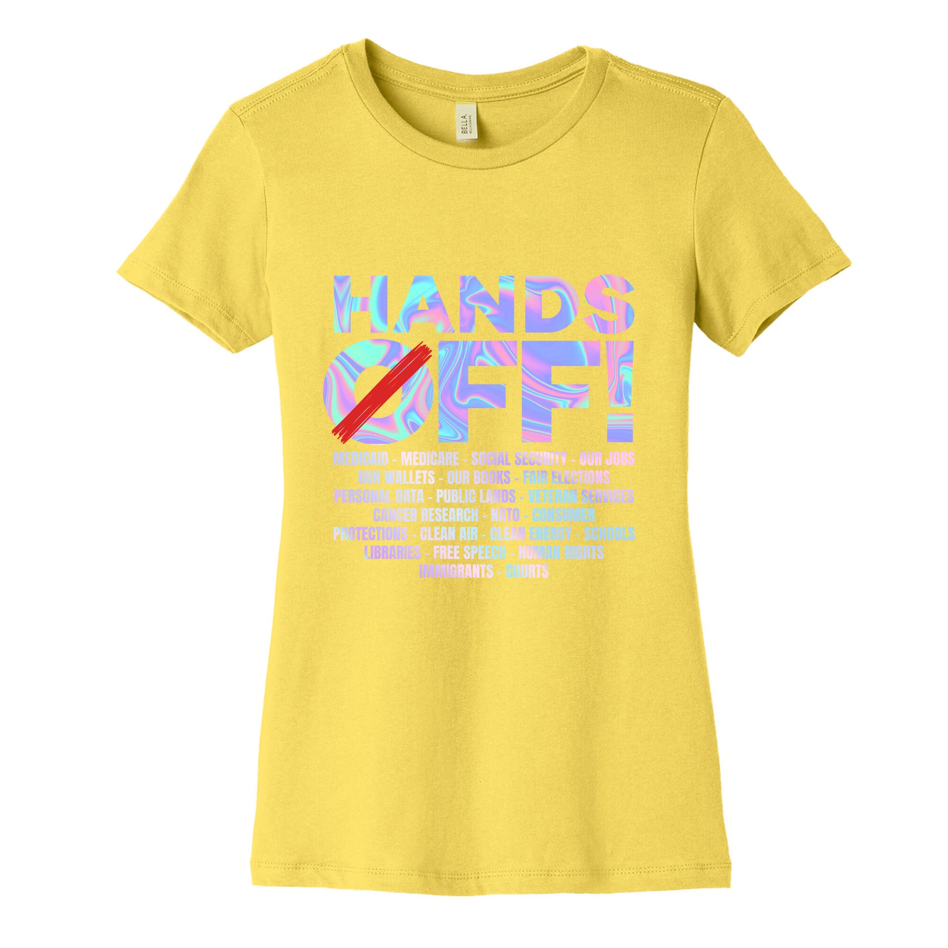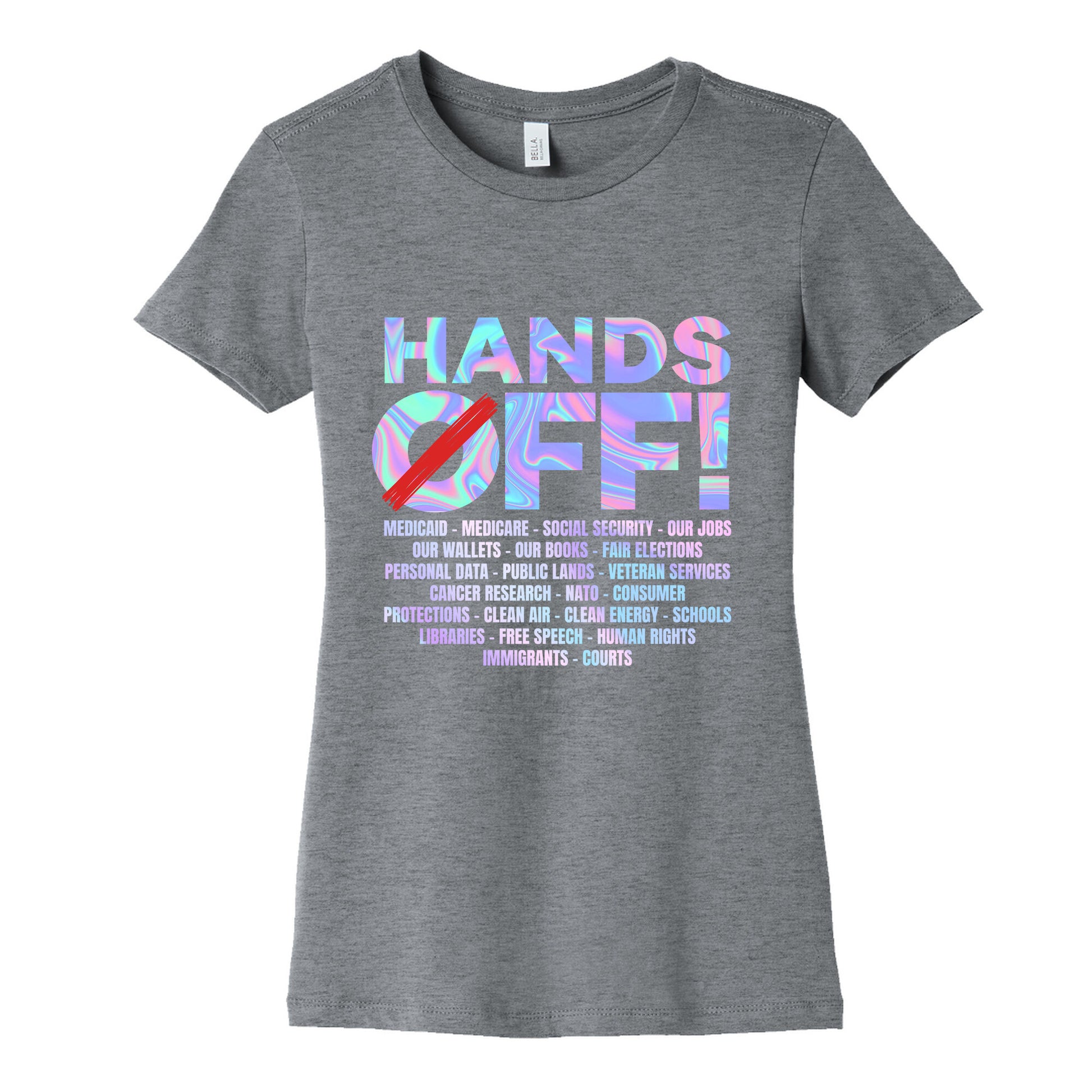 Make a bold statement with our "HANDS OFF!" shirtwhere personal freedom meets unapologetic resistance. Perfect for anyone who believes boundaries arent up for debate. Our slim fit Womens Cotton Tees, are made with exceedingly soft 100% cotton. They feature a relaxed neckline, and the sleeves and bottom, are hemmed for durability. Preshrunk for your convenience! Printed in the USA. Made with 100% Cotton. Colors such as gray, is made up of 90% cotton and 10% polyester, and deep pink is made up of 50% cotton and 50% polyester.