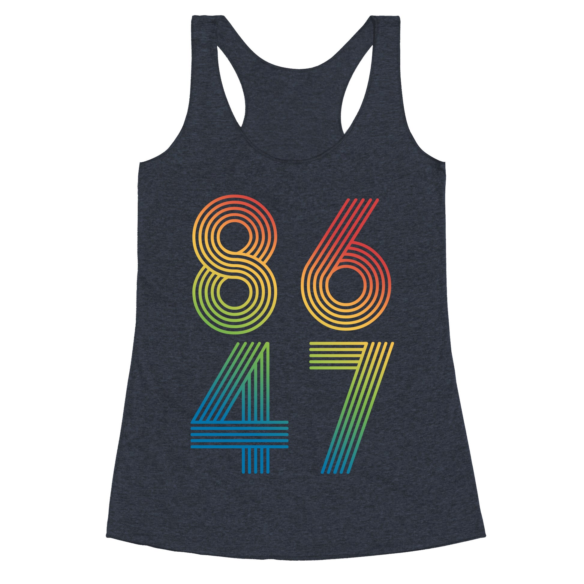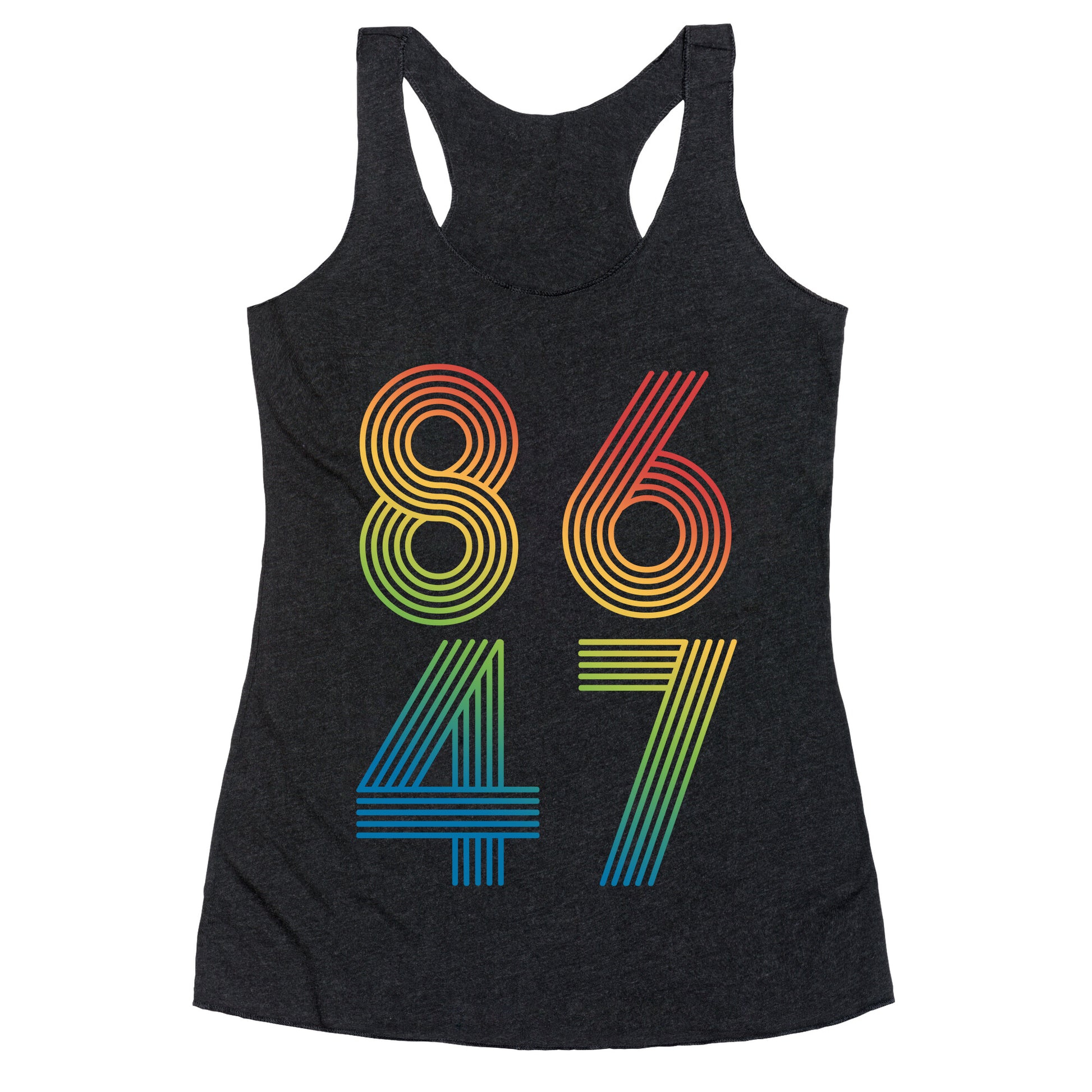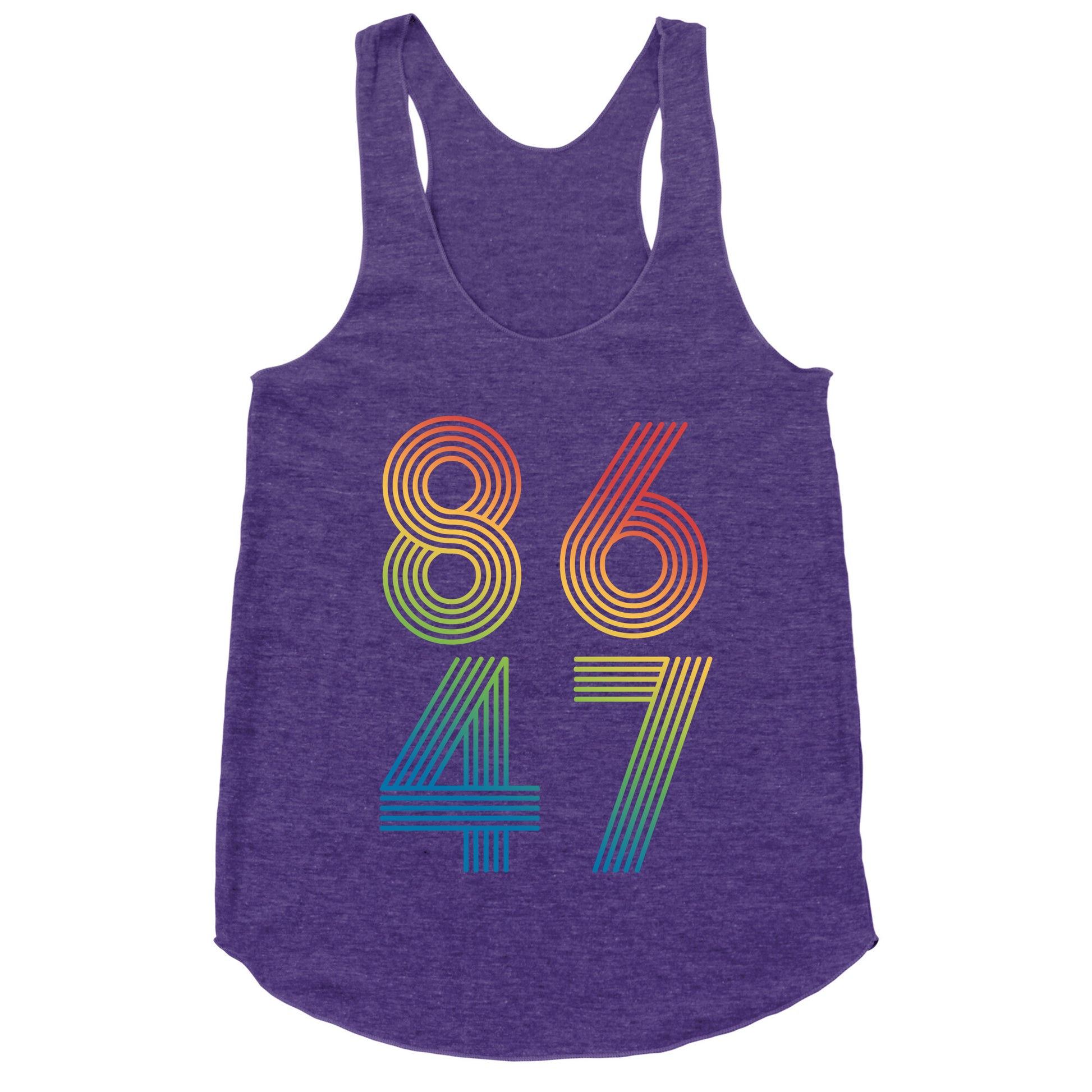 Boldly make your stance known with this unapologetic "8647" designa sharp-witted jab that speaks volumes without saying a word. Perfect for those who believe accountability doesnt come with an expiration date. Our super comfortable Womens Raw Edge Racerback features a soft tri-blend, unhemmed fabric, with a fashionable bell-like shape for the bottom. Preshrunk for your convenience! Printed in the USA. Made with 50% Polyester 25% Ring Spun Cotton, and 25% Rayon.