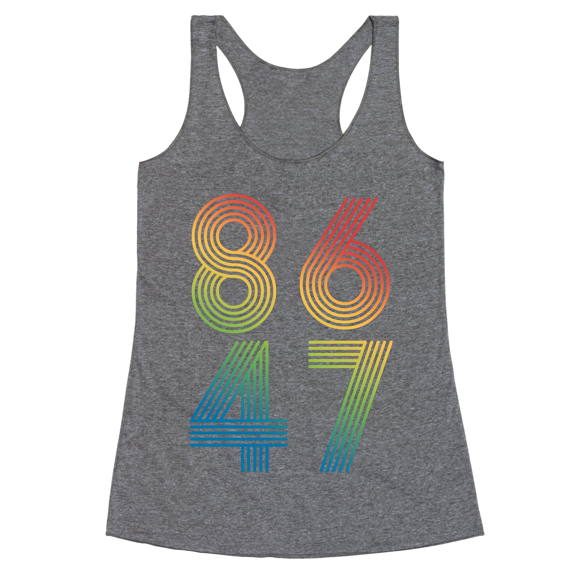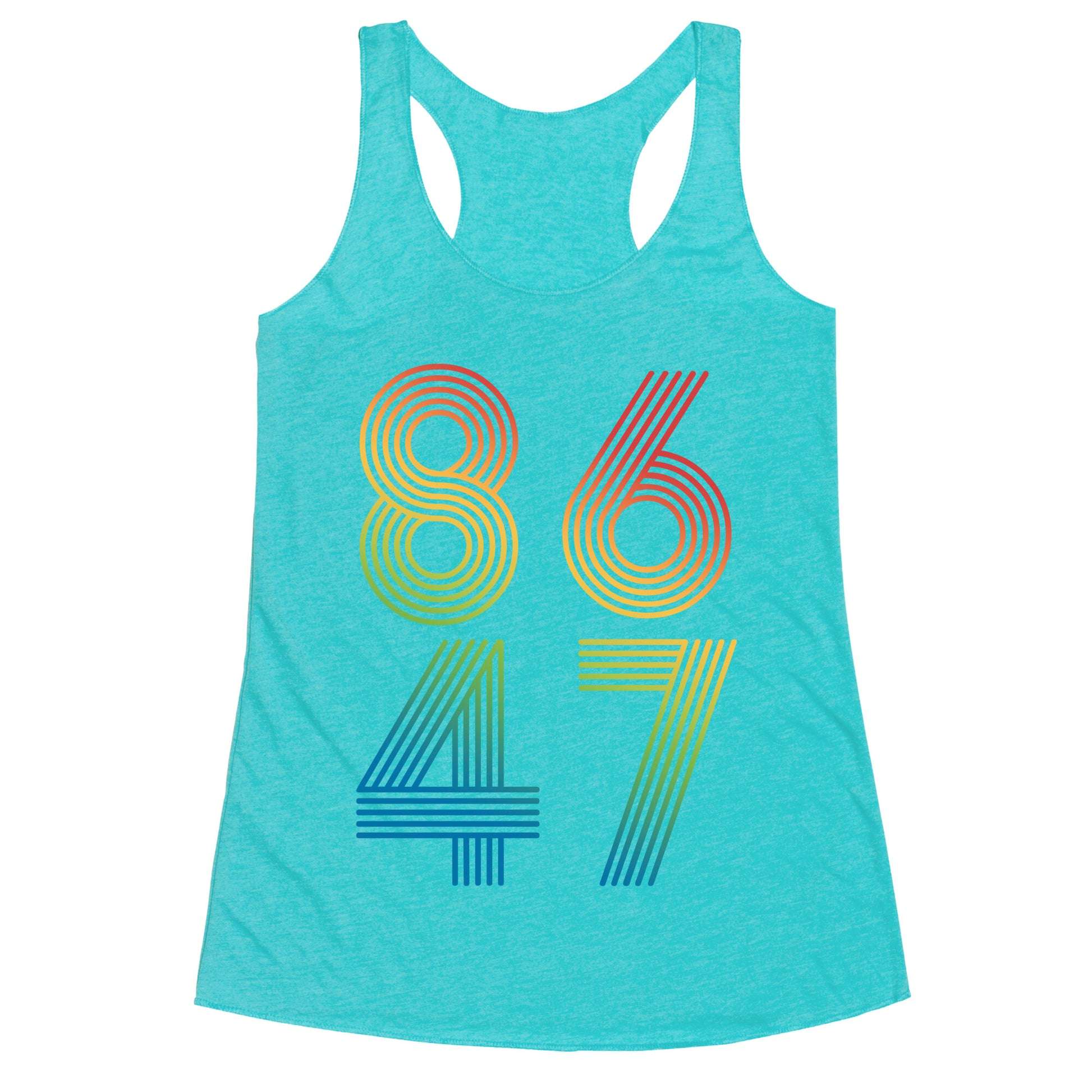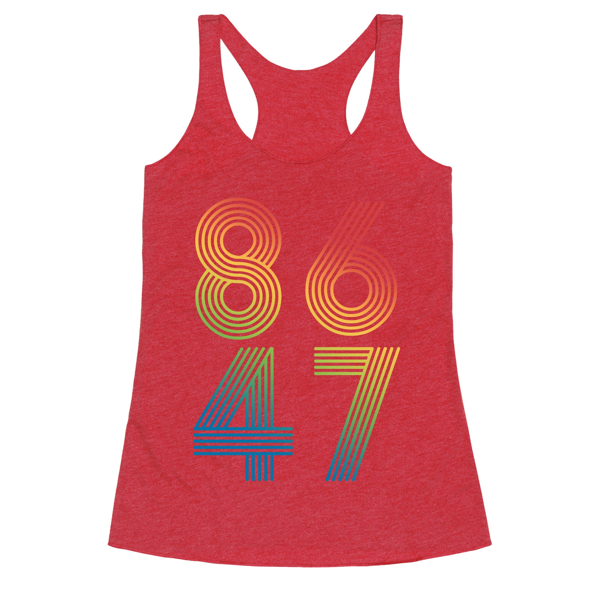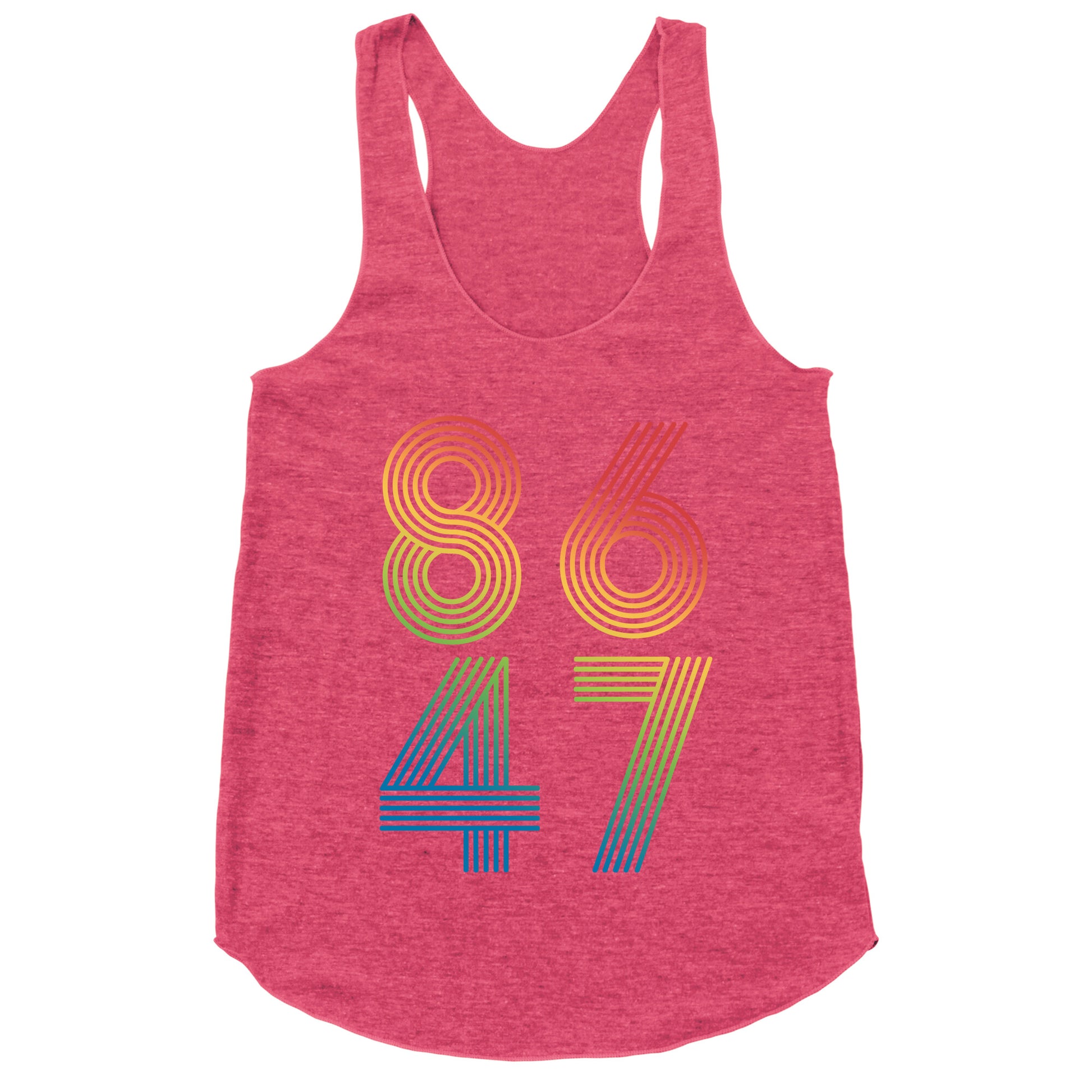 Boldly make your stance known with this unapologetic "8647" designa sharp-witted jab that speaks volumes without saying a word. Perfect for those who believe accountability doesnt come with an expiration date. Our super comfortable Womens Raw Edge Racerback features a soft tri-blend, unhemmed fabric, with a fashionable bell-like shape for the bottom. Preshrunk for your convenience! Printed in the USA. Made with 50% Polyester 25% Ring Spun Cotton, and 25% Rayon.