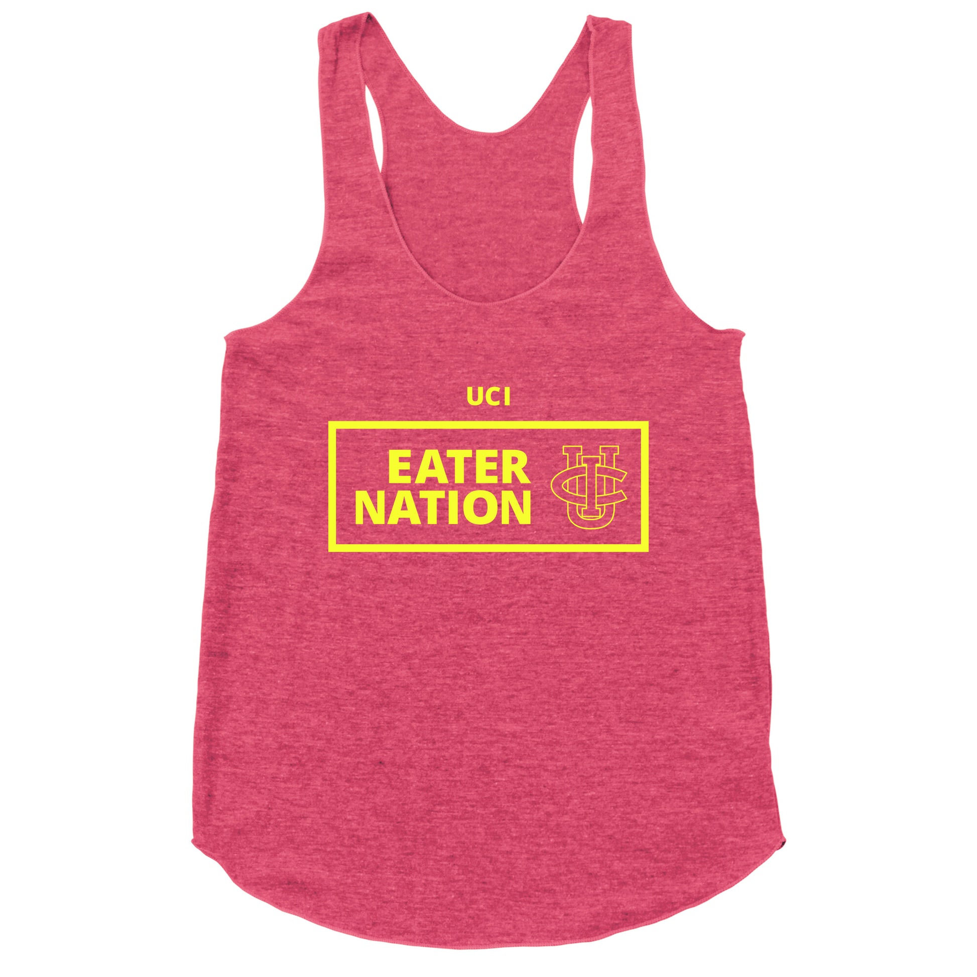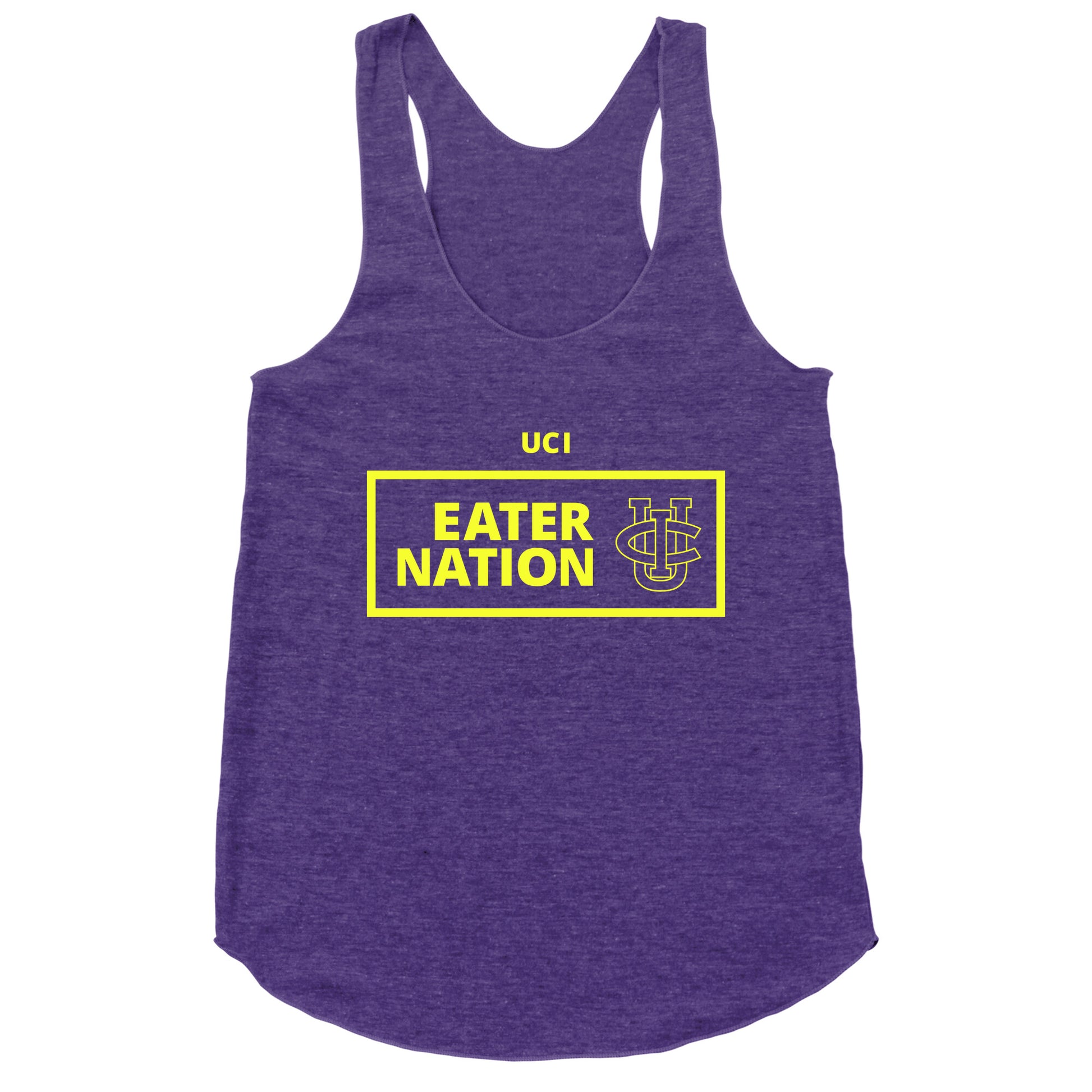 Rep your Anteater pride loud and clear with this bold UC Irvine Eater Nation design that rallies true fans to Zot on with spirit. Whether youre cheering courtside or strolling campus, this tee makes you part of the legend. Our super comfortable Womens Raw Edge Racerback features a soft tri-blend, unhemmed fabric, with a fashionable bell-like shape for the bottom. Preshrunk for your convenience! Printed in the USA. Made with 50% Polyester 25% Ring Spun Cotton, and 25% Rayon.