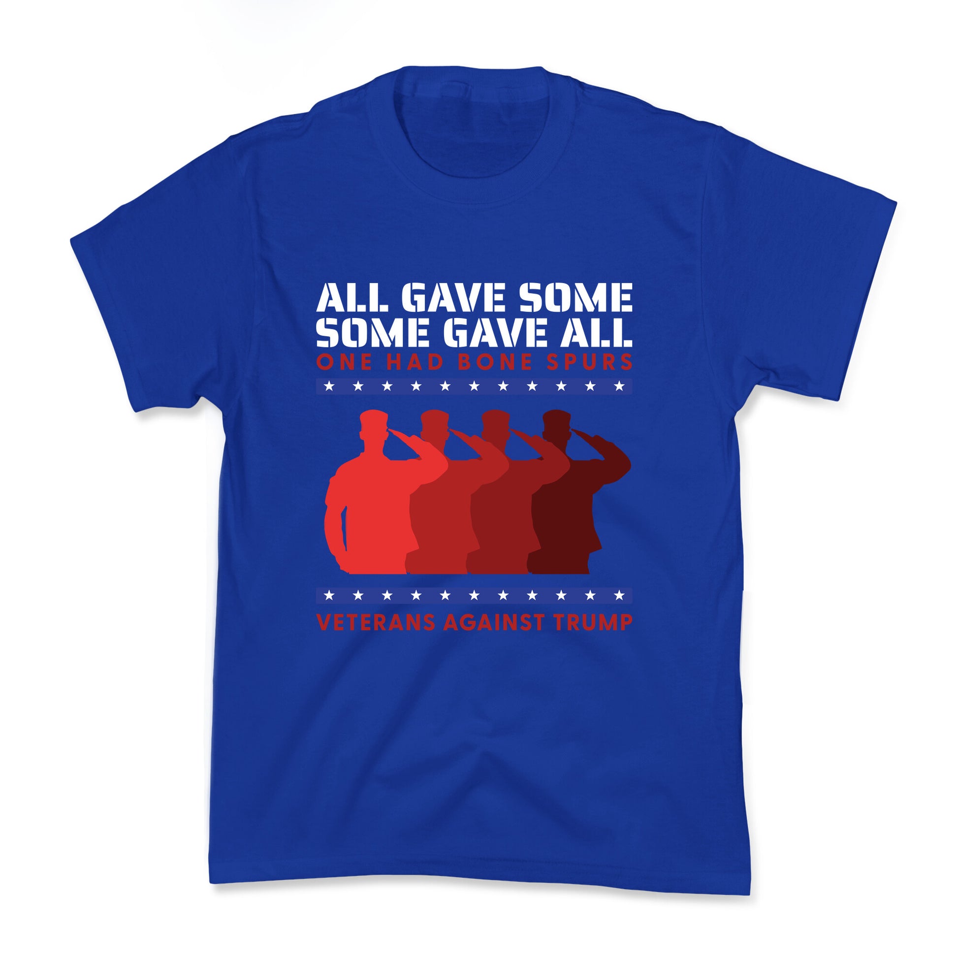 Boldly stand for truth with this unapologetic design that honors real sacrifice while calling out cowardice. "Some Gave All, One Had Bone Spurs Veterans Against Trump" speaks volumes without saying a word. Our cool Kids Tees are made with exceedingly soft 100% ring spun cotton with hemmed sleeves and bottoms for durability. Preshrunk for your convenience! Printed in the USA. Made with 100% Cotton.