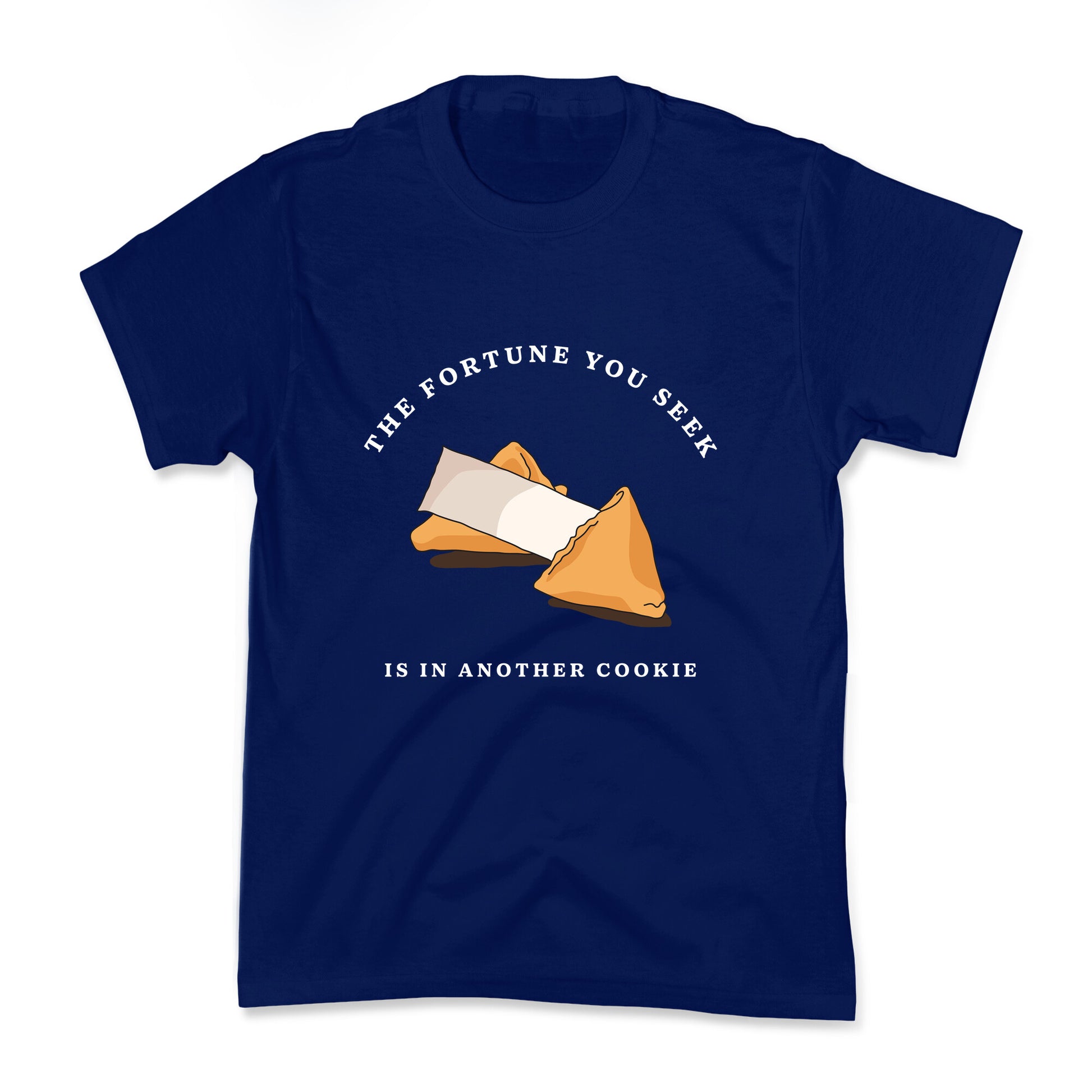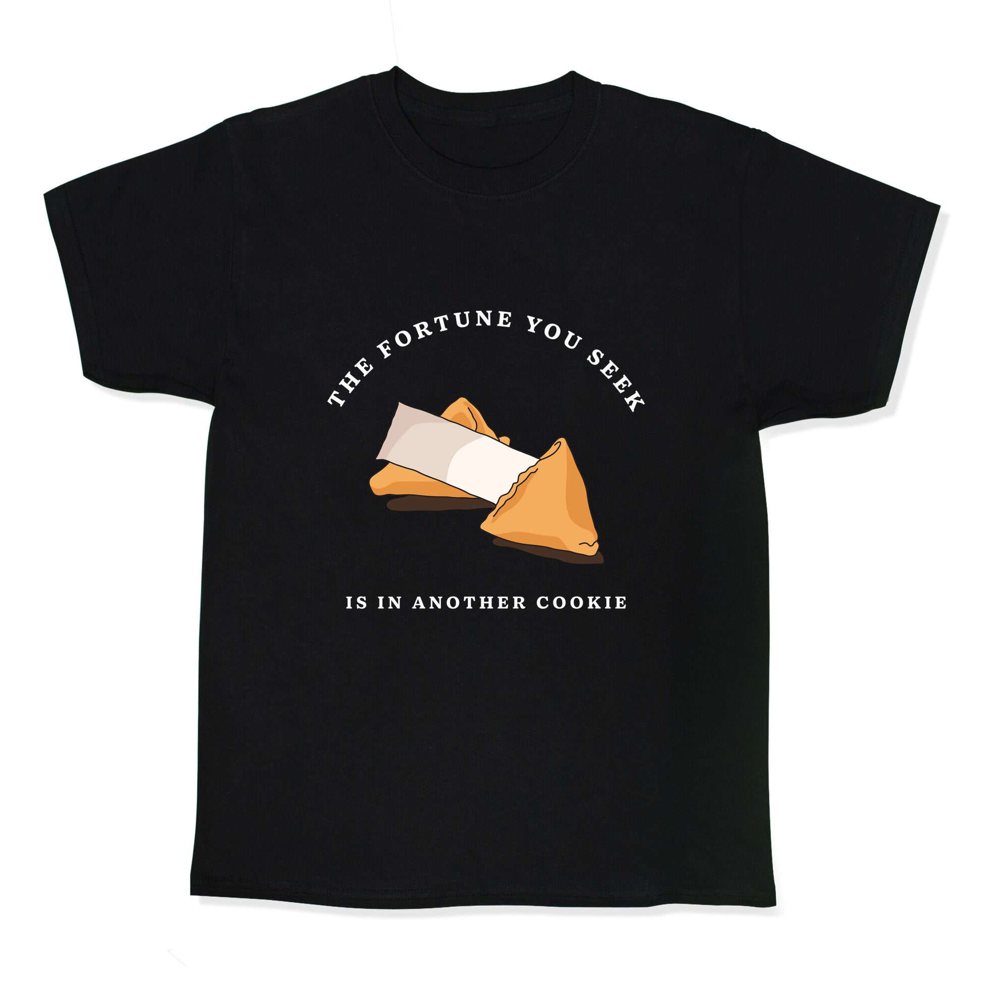 Break free from destinys clichs with this witty twist on ancient wisdom: \"The fortune you seek is in another cookie.\" A perfect pick for those who know that lifes answers dont always come wrapped in tradition. Our cool Kids Tees are made with exceedingly soft 100% ring spun cotton with hemmed sleeves and bottoms for durability. Preshrunk for your convenience! Printed in the USA. Made with 100% Cotton.