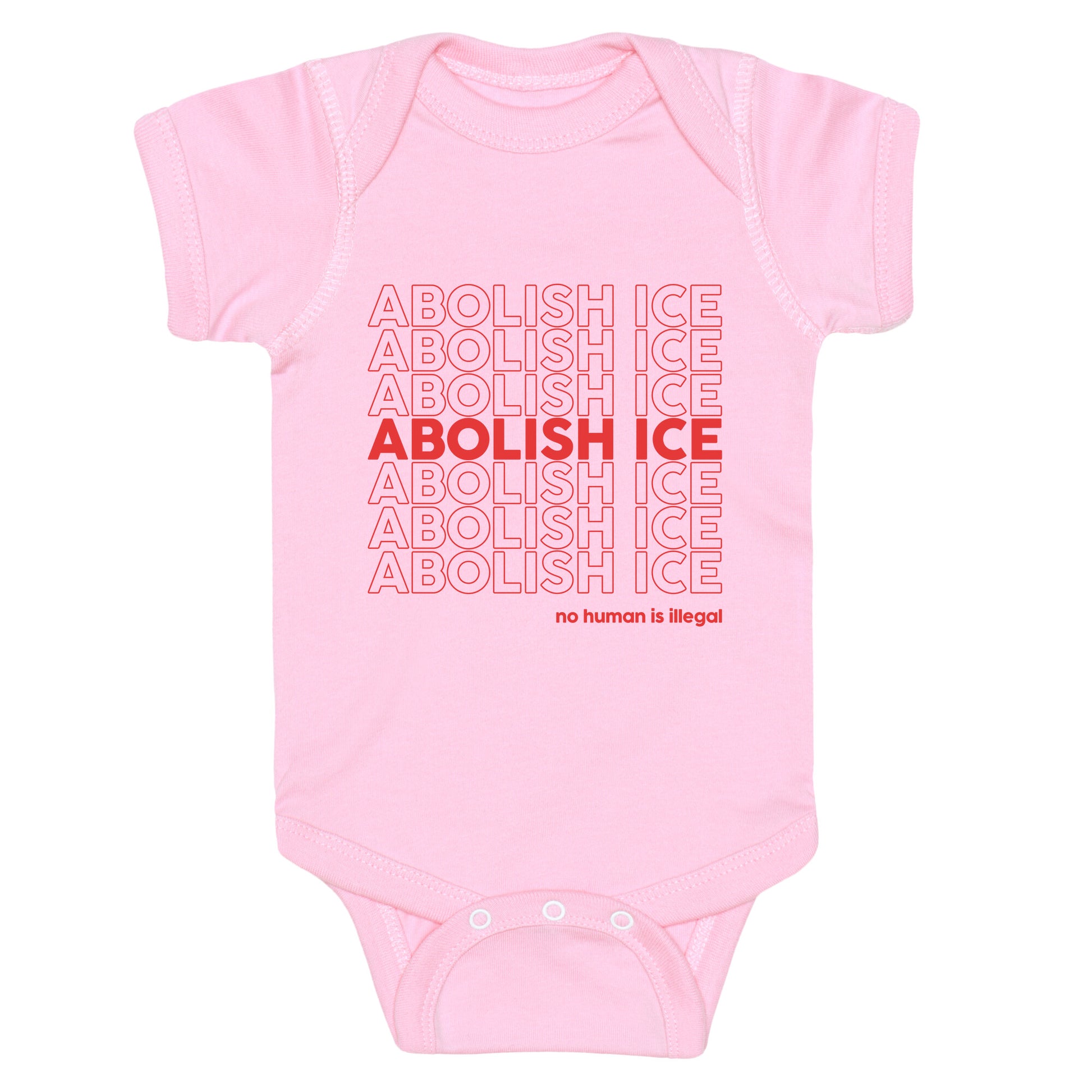 Make a bold statement with this unapologetic design demanding justice and the end of inhumane immigration enforcement. Wear your stance loud: Abolish ICE, no compromise. Our Baby One Piece is made from exceedingly soft 100% ring spun cotton. They are featured with hemmed seams and a reinforced 3 snap bottom closure for easy diaper changes. Preshrunk for your convenience! Printed in the USA. Made with 100% Ring Spun Cotton.