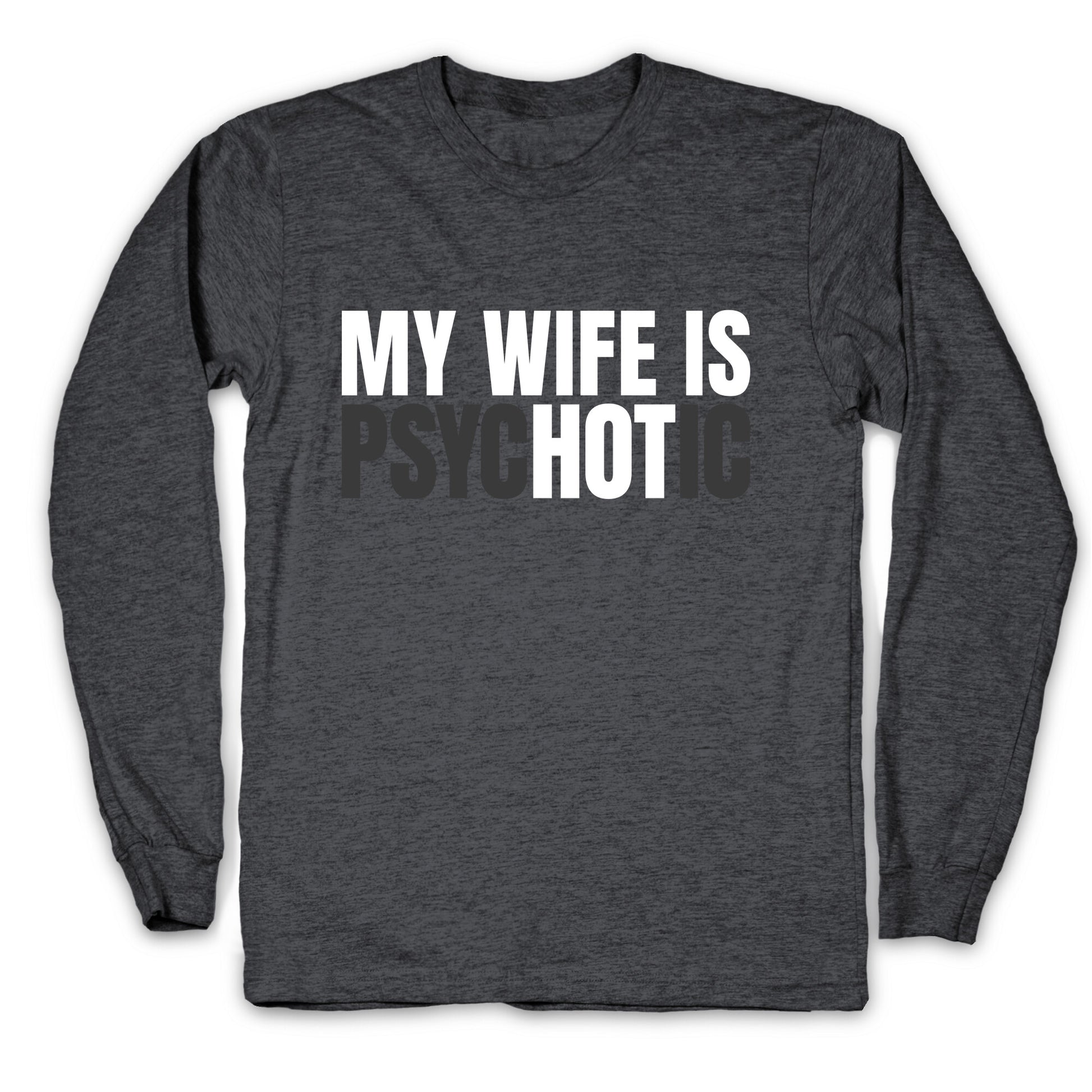This shirt looks innocent until you lift the flap and reveal the truth: My Wife Is Psychoticwear it at your own risk \(and hers\). Perfect for thrill-seekers who enjoy living on the edge of the couch. Our Unisex Long Sleeve Tee is made from a soft 100% cotton jersey knit. It features a crew neckline with ribbed cuffs and hemmed bottom for durability. Preshrunk for your convenience! Printed in the USA. Athletic Gray is made up of 90% cotton and 10% polyester.