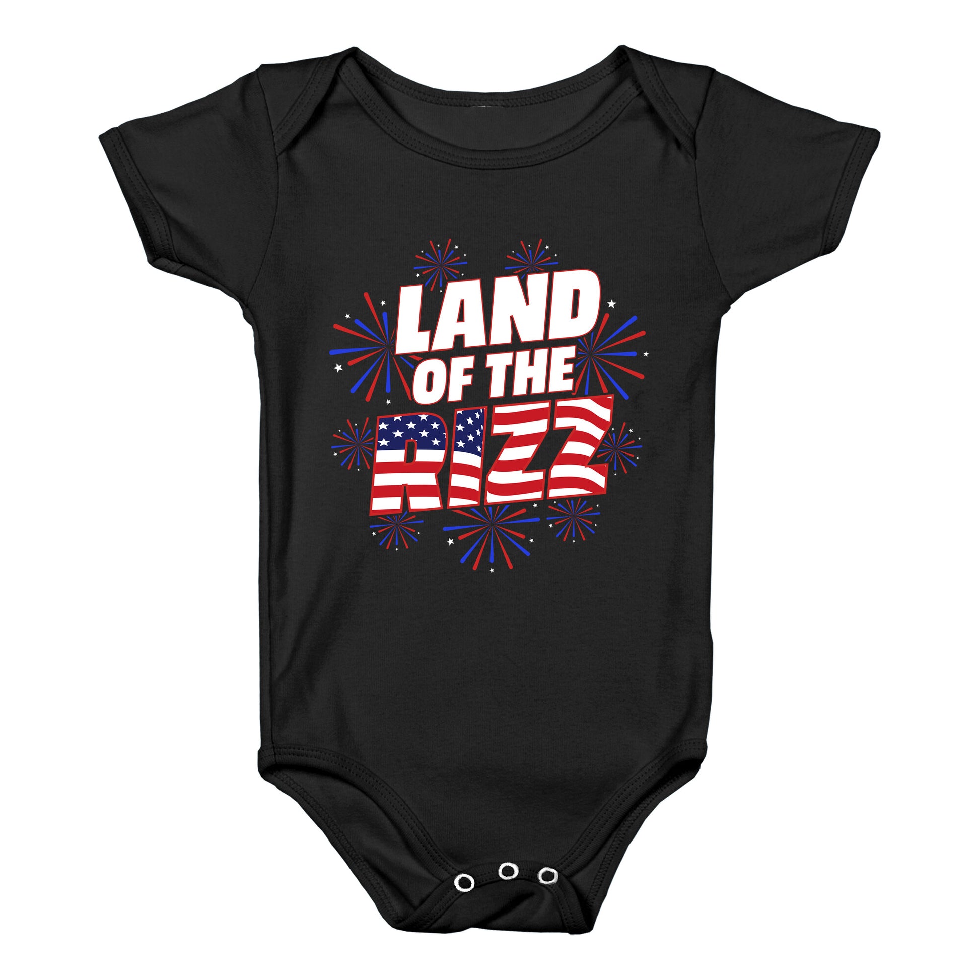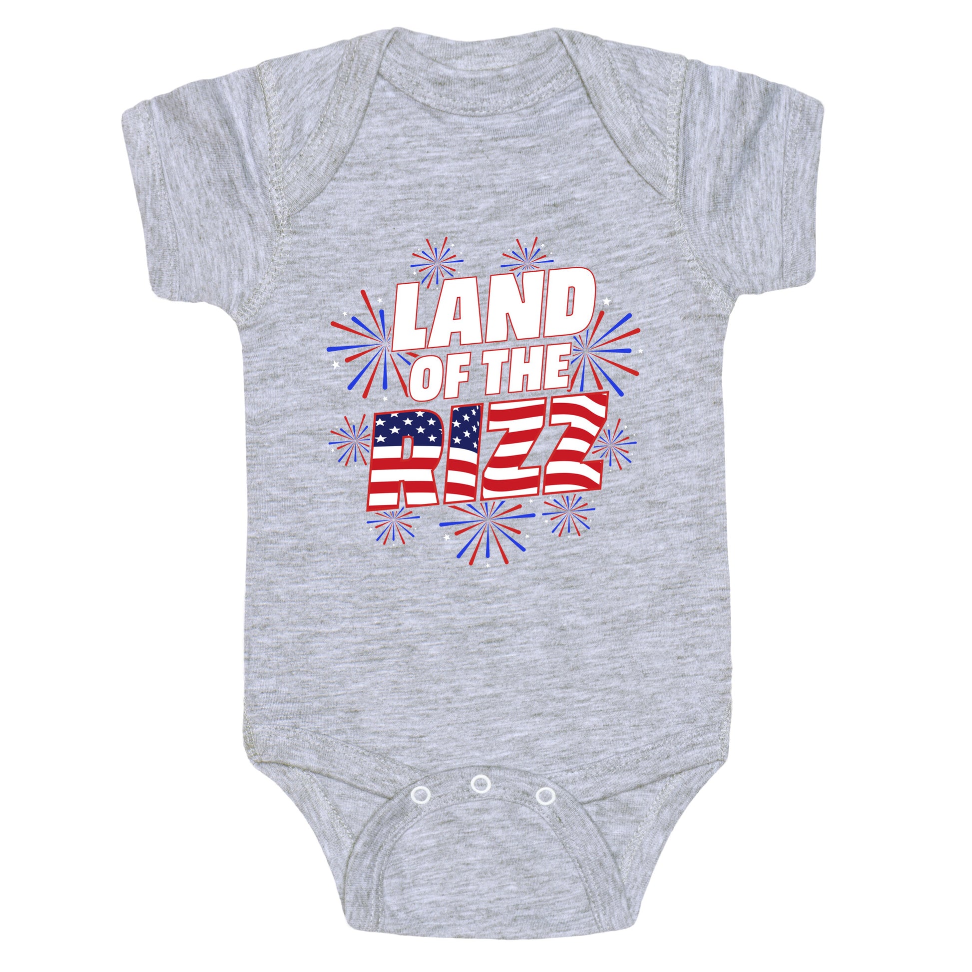 Turn heads this Fourth with our "Land of the Rizz" shirt where smooth talk meets star-spangled swagger. Celebrate freedom, flirtation, and flawless game all in one legendary look. Our Baby One Piece is made from exceedingly soft 100% ring spun cotton. They are featured with hemmed seams and a reinforced 3 snap bottom closure for easy diaper changes. Preshrunk for your convenience! Printed in the USA. Made with 100% Ring Spun Cotton.