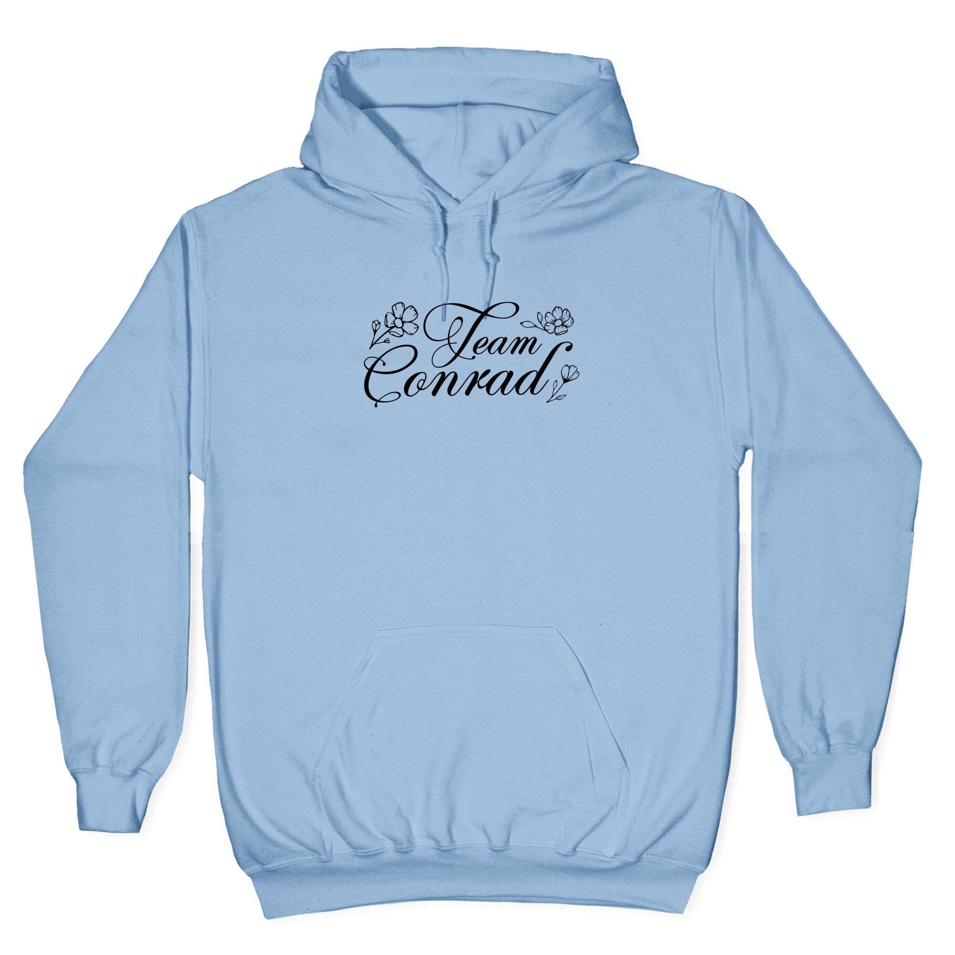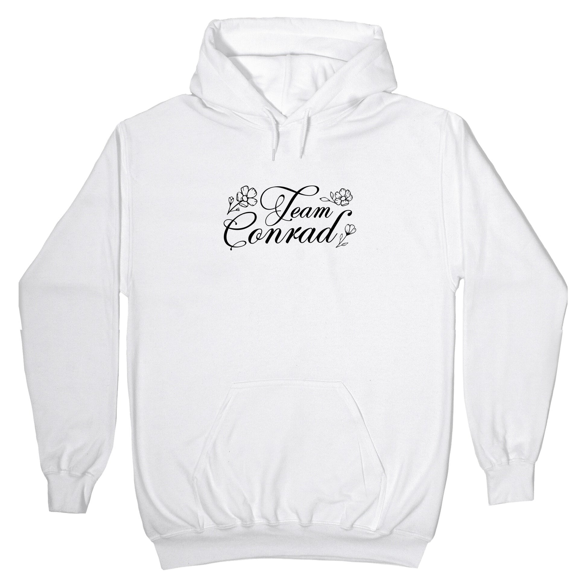 Declare your loyalty with this bold Team Conrad shirt that captures all the angst, charm, and unforgettable summer nights of Cousins Beach. Perfect for fans who believe first love never fades, its a wearable tribute to Bellys most complicated choice. Our Unisex Pullover Hoodie is made from a soft 8-ounce fabric They feature a drawstring hood and front kangaroo pocket. Great for layering! Preshrunk for your convenience! Printed in the USA. Made with 50% Cotton and 50% Polyester.