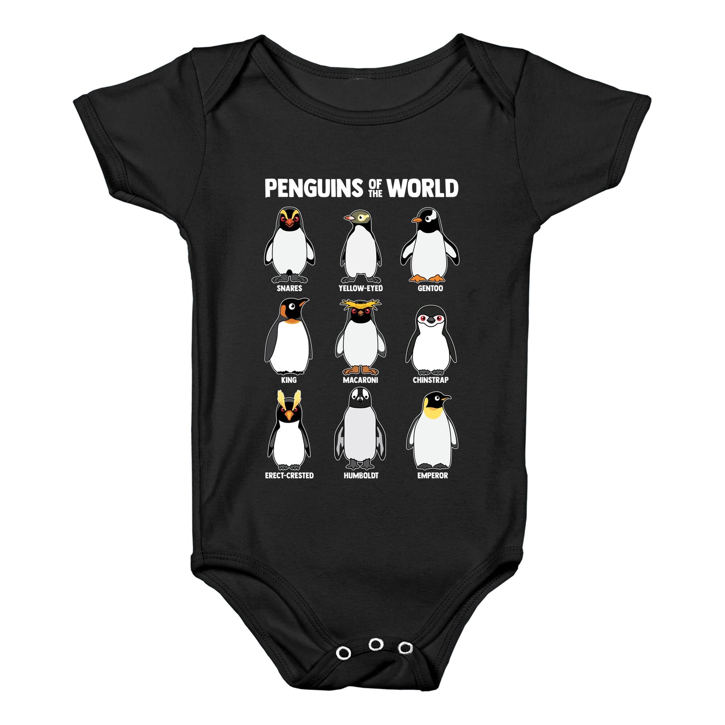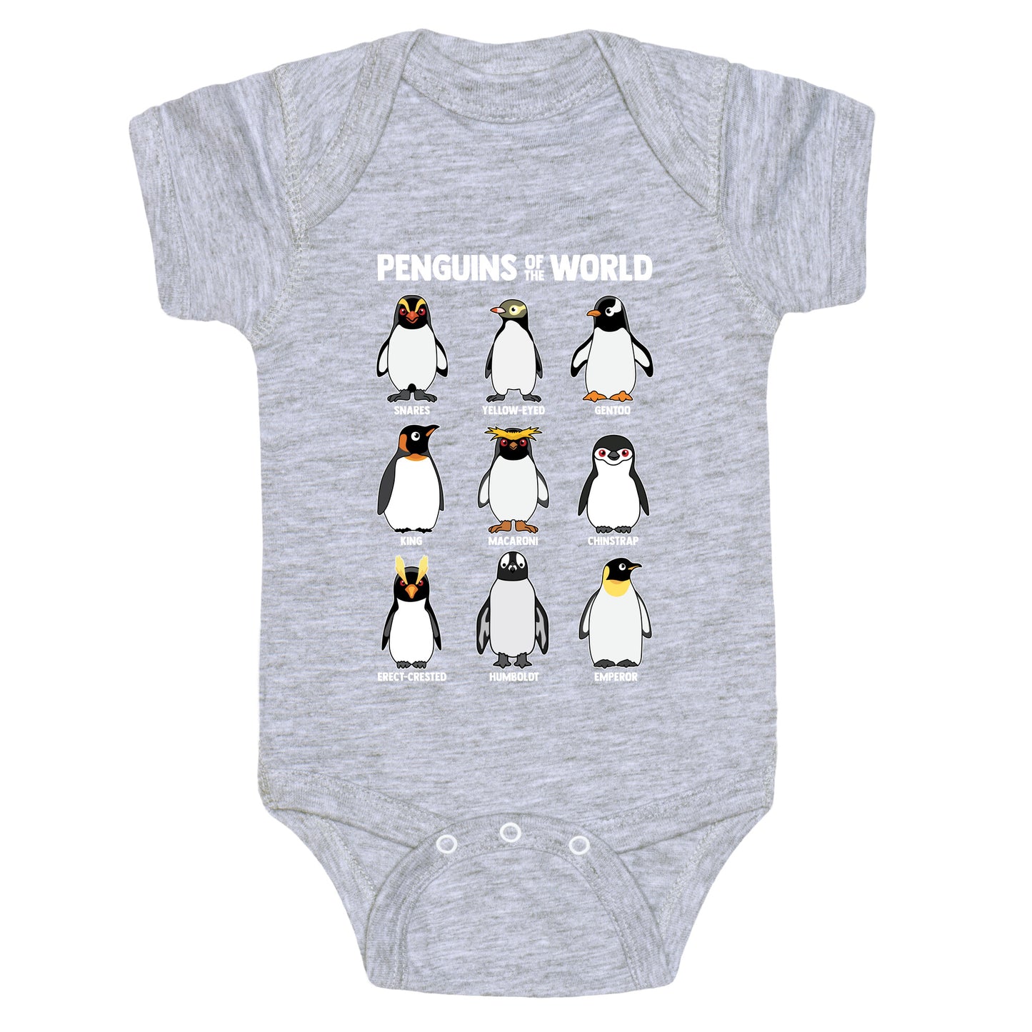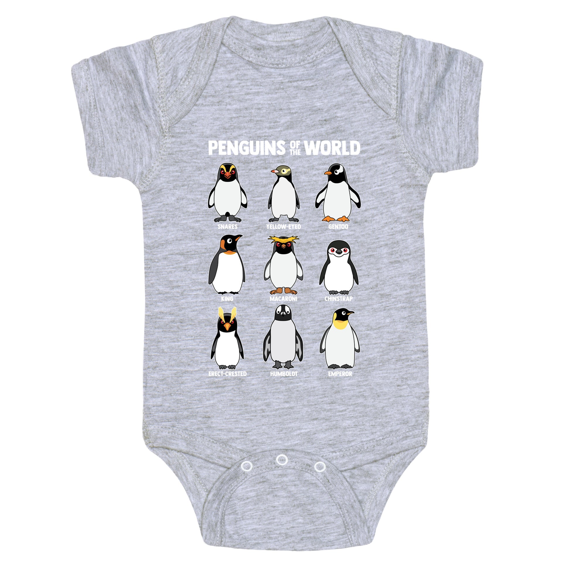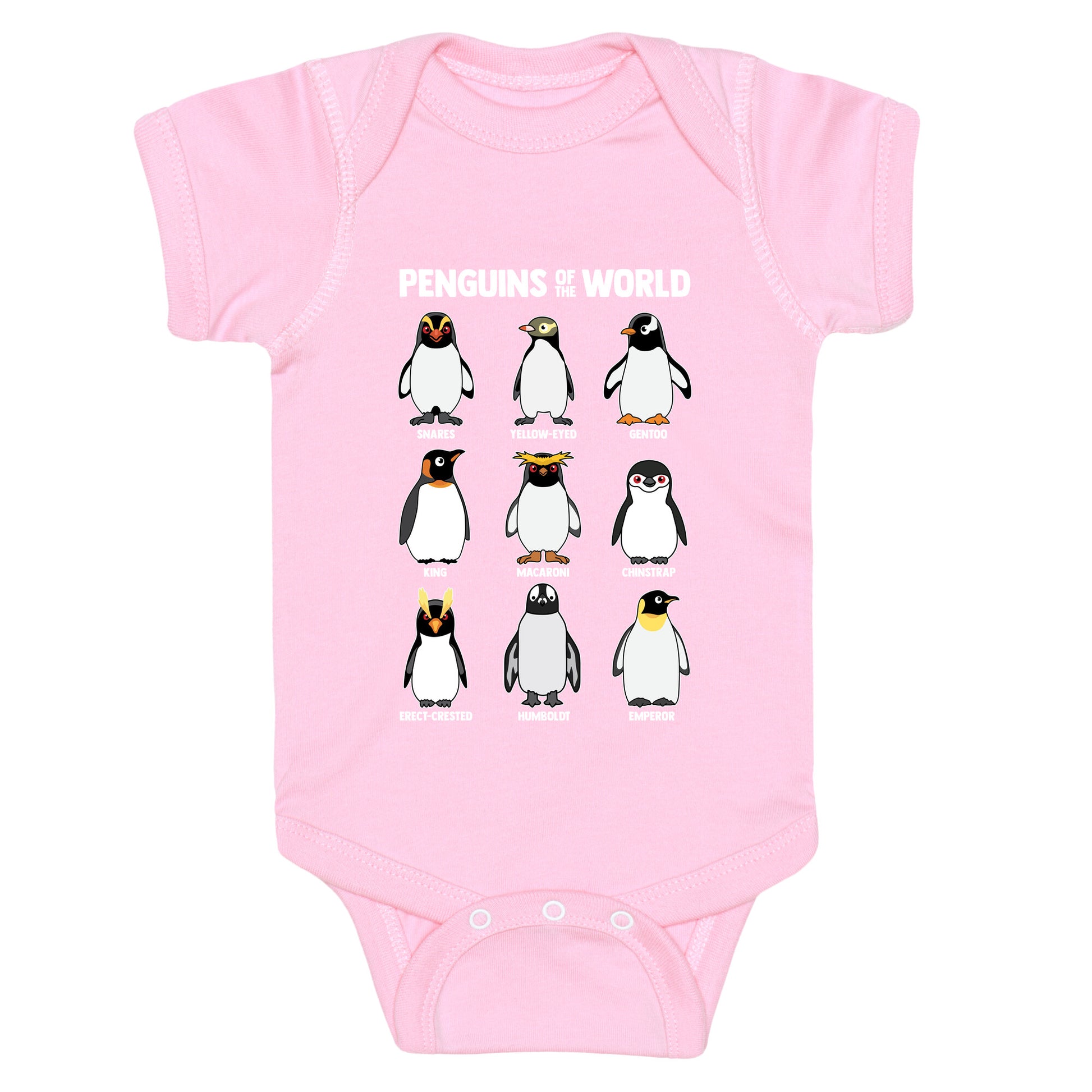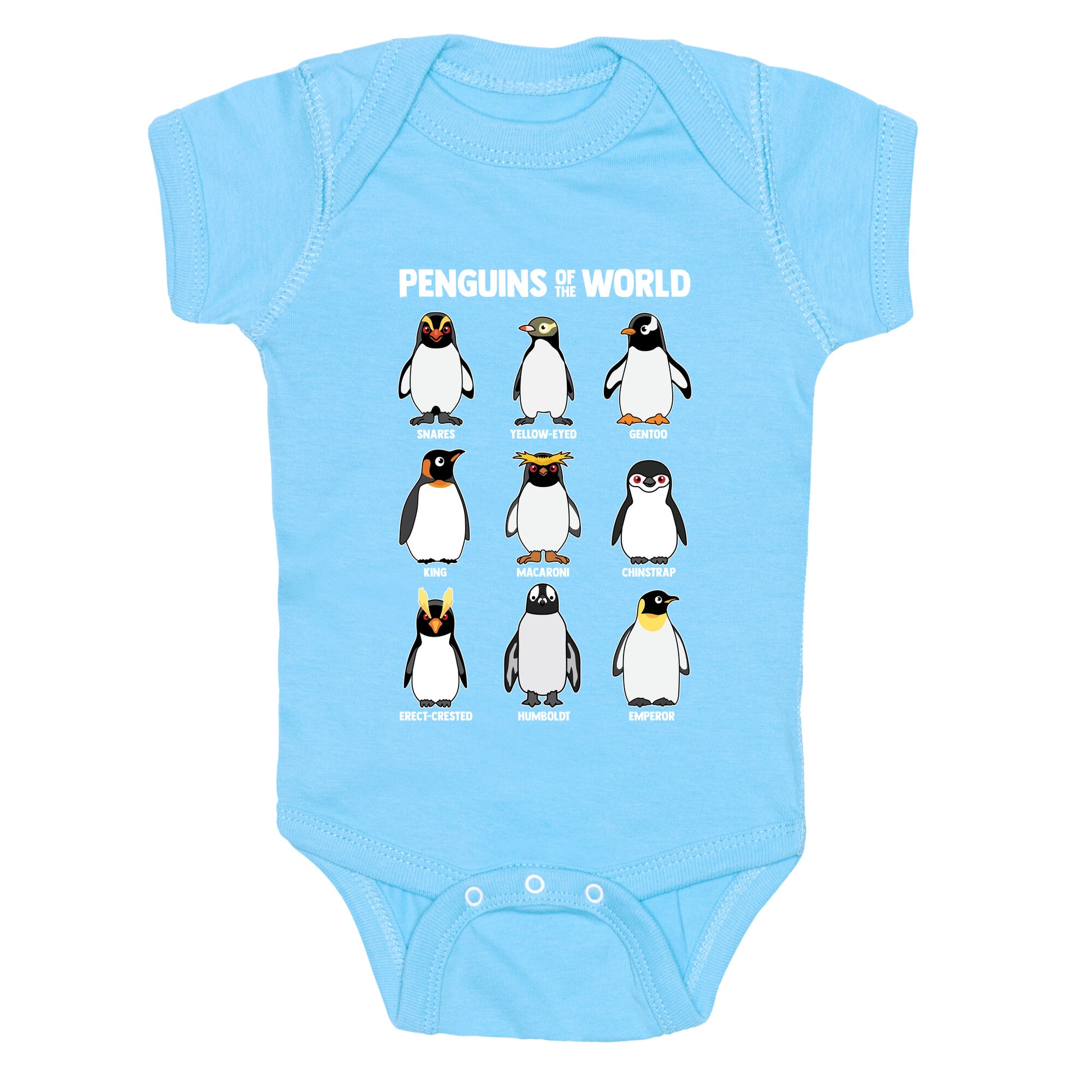 Waddle into the wonderful world of penguins with this adorable shirt featuring all your favorite flippered friends, from the regal Emperor to the playful Humboldt. Its a cheerful celebration of penguin variety thatll have everyone smiling from beak to tail! Our Baby One Piece is made from exceedingly soft 100% ring spun cotton. They are featured with hemmed seams and a reinforced 3 snap bottom closure for easy diaper changes. Preshrunk for your convenience! Printed in the USA. Made with 100% Ring Spun Cotton.