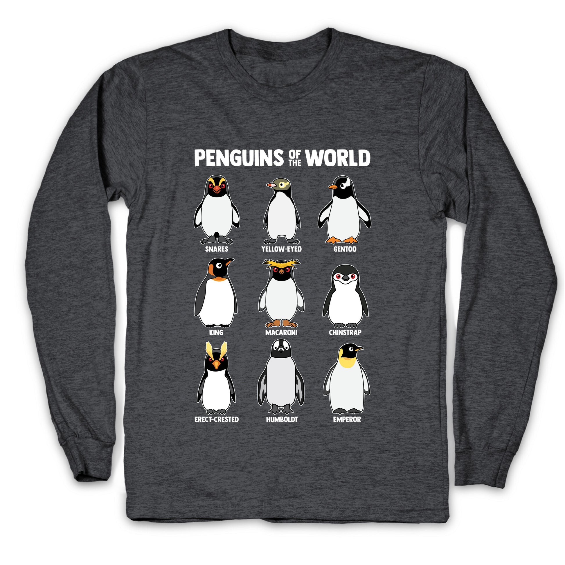 Waddle into the wonderful world of penguins with this adorable shirt featuring all your favorite flippered friends, from the regal Emperor to the playful Humboldt. Its a cheerful celebration of penguin variety thatll have everyone smiling from beak to tail! Our Unisex Long Sleeve Tee is made from a soft 100% cotton jersey knit. It features a crew neckline with ribbed cuffs and hemmed bottom for durability. Preshrunk for your convenience! Printed in the USA. Athletic Gray is made up of 90% cotton and 10% polyester.