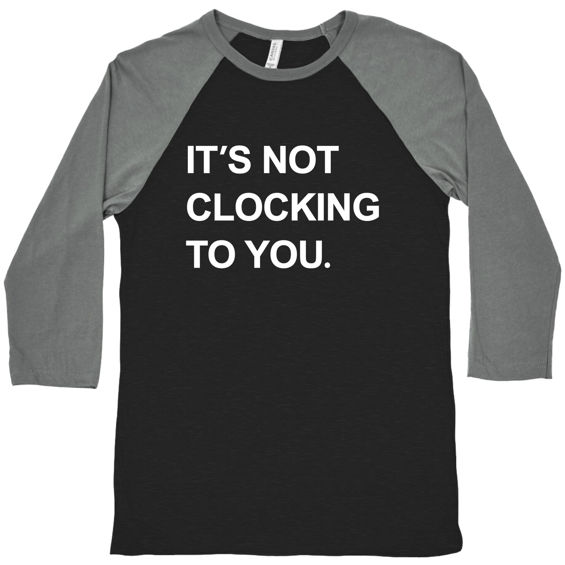 Turn heads with this bold statement piece featuring the iconic phrase "Its Not Clocking To You," just like the one Justin Bieber rocked. Perfect for making your vibe unmistakably confident and unapologetic. Our exceedingly soft and relaxed fit Tri-Blend Baseball Tee features a three-quarter length sleeve, crew neck, fun contrasting color sleeves and neck trim. Preshrunk for your convenience! Printed in the USA. Made with 50% Polyester, 25% Cotton and 25% Rayon