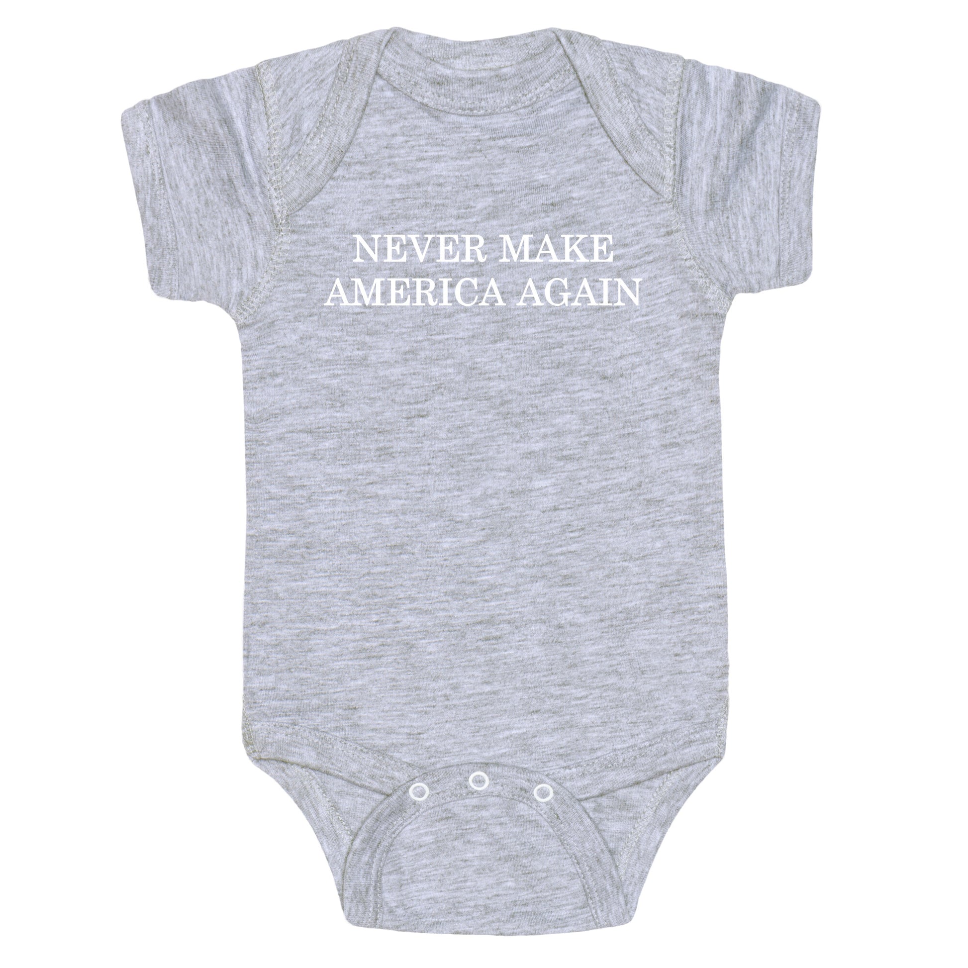 Boldly push back against extremism with this unapologetic "Never Make America Again" design. A sharp, satirical statement for those who reject the MAGA movement and stand for progress over regression. Our Baby One Piece is made from exceedingly soft 100% ring spun cotton. They are featured with hemmed seams and a reinforced 3 snap bottom closure for easy diaper changes. Preshrunk for your convenience! Printed in the USA. Made with 100% Ring Spun Cotton.