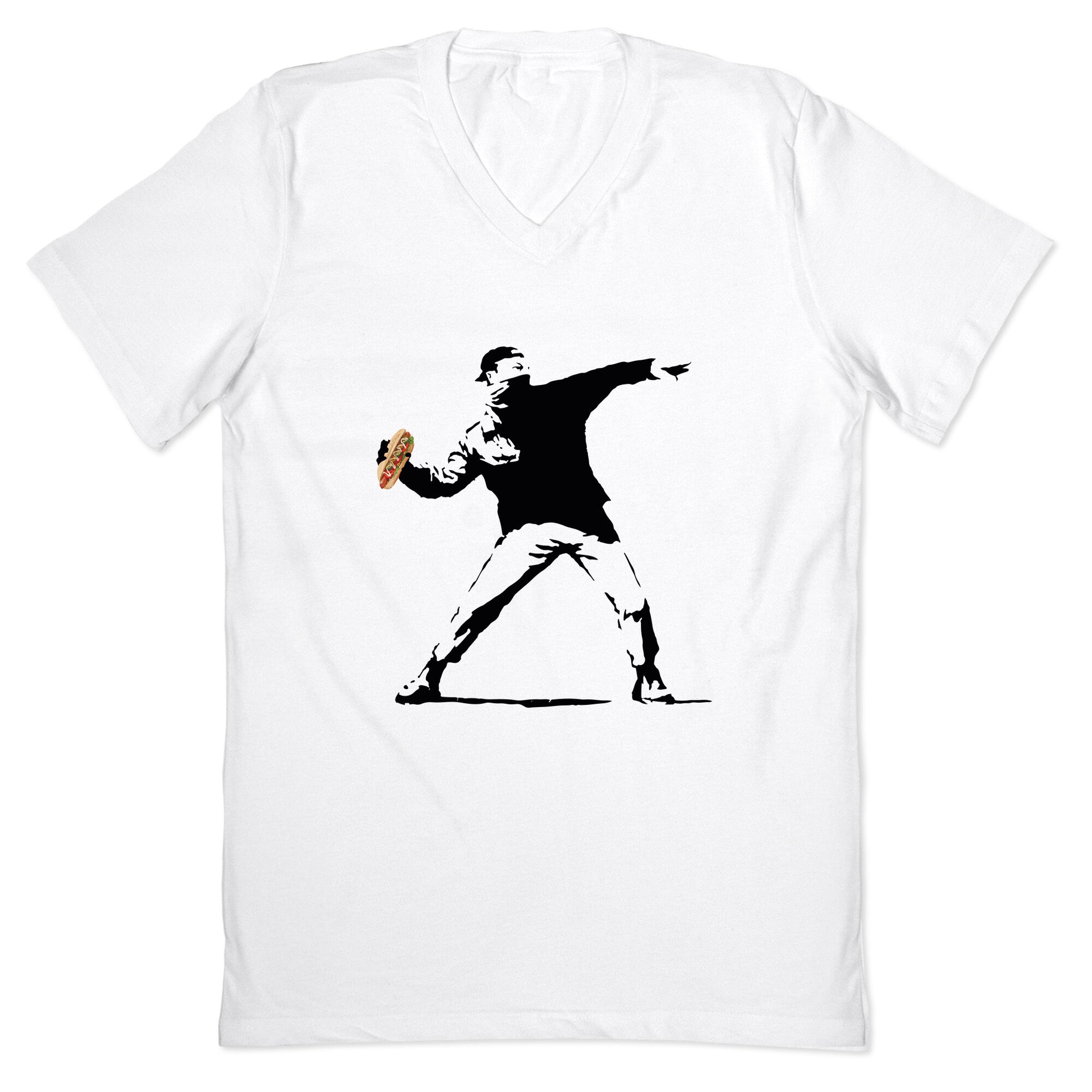 Make a statement with this bold protest tee featuring the iconic sandwich toss that went viral in DC. A perfect blend of humor and resistance, it captures the spirit of standing up and speaking out. Our fitted Mens V-Neck tees are made with a soft jersey fabric. They feature a v-neckline, with sleeve and bottom hems for durability. Preshrunk for your convenience! Printed in the USA. Solid colors made with 100% Cotton and otherwise 90% Cotton and 10% Polyester.