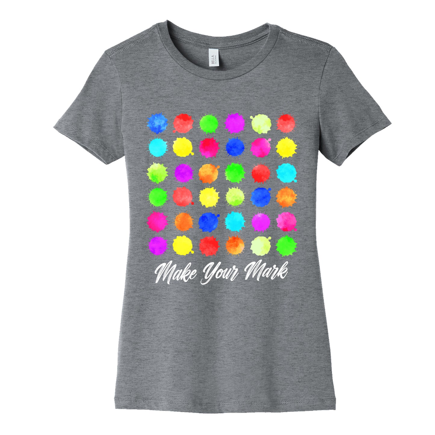 Celebrate creativity with this Dot Day "Make Your Mark" shirt, inspired by the power of self-expression and imagination. A perfect way to showcase your unique voice and inspire others to leave their mark on the world. Our slim fit Womens Cotton Tees, are made with exceedingly soft 100% cotton. They feature a relaxed neckline, and the sleeves and bottom, are hemmed for durability. Preshrunk for your convenience! Printed in the USA. Made with 100% Cotton. Colors such as gray, is made up of 90% cotton and 10% polyester, and deep pink is made up of 50% cotton and 50% polyester.
