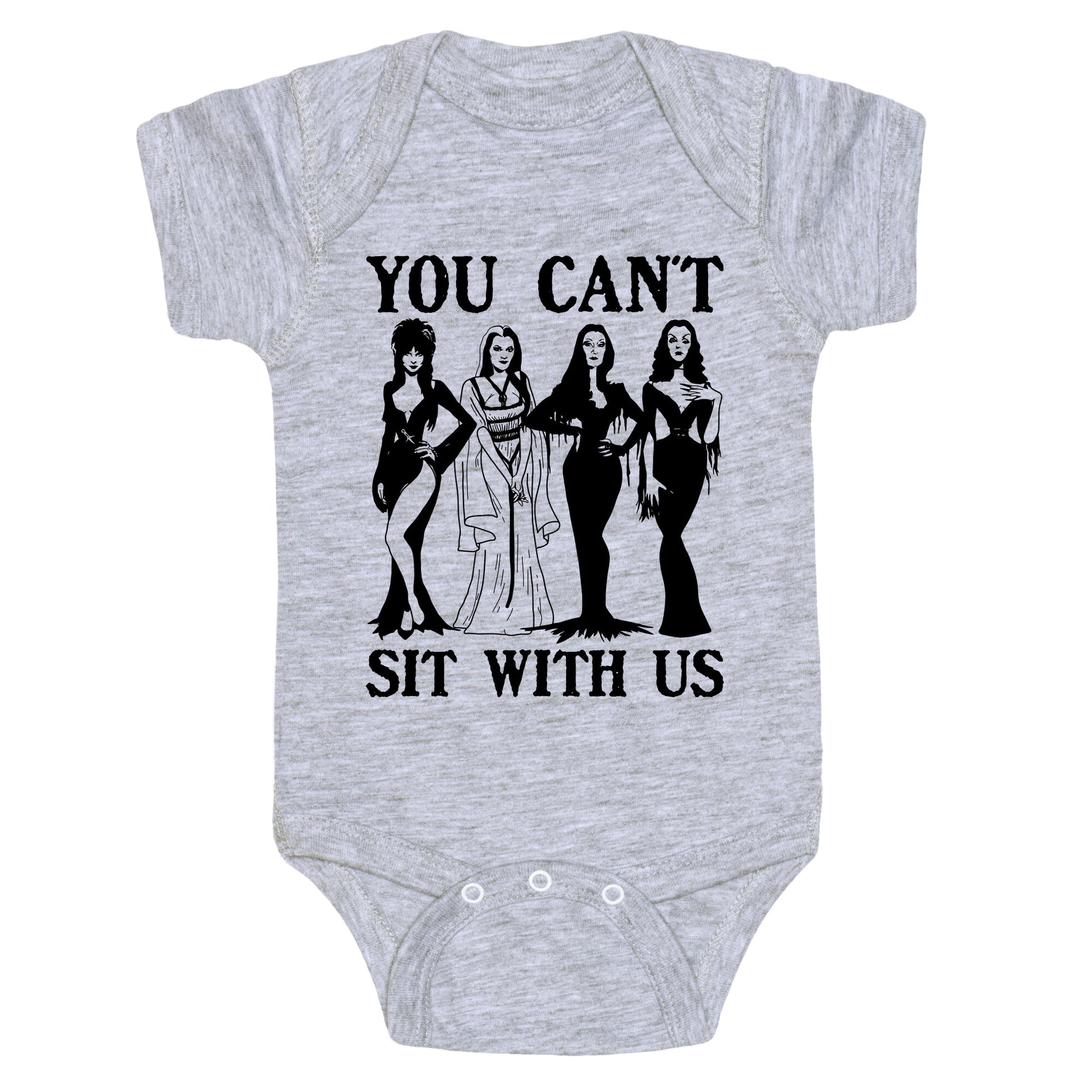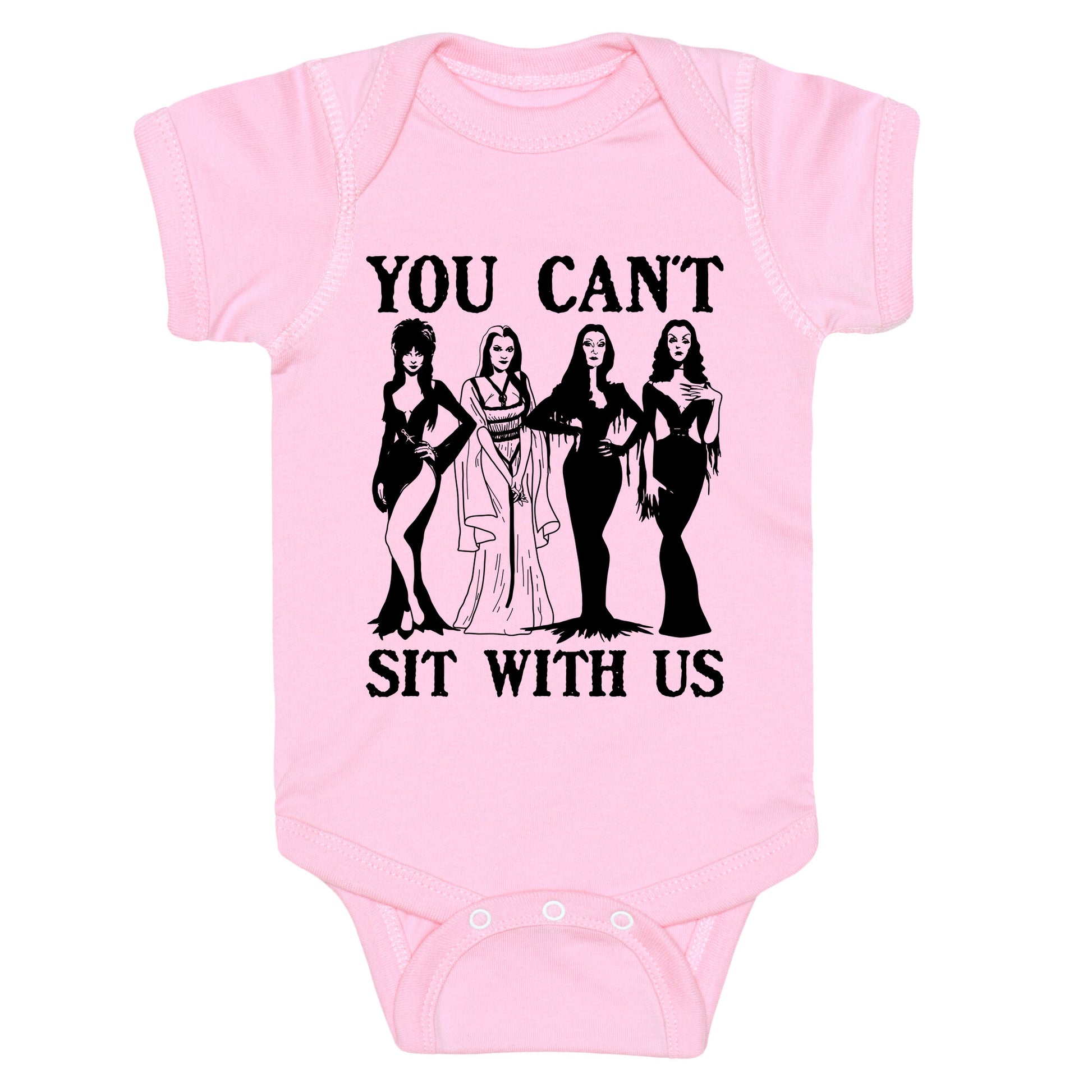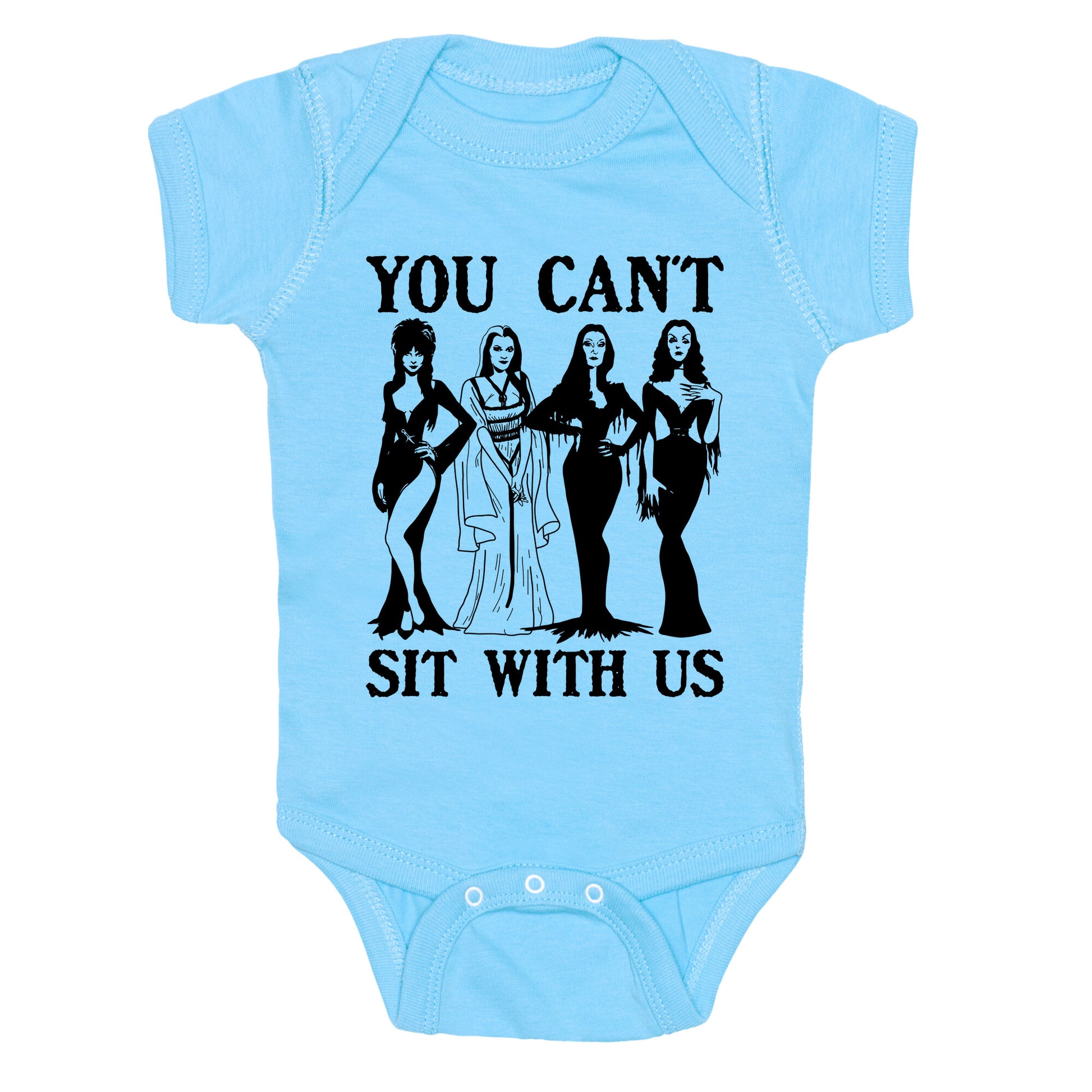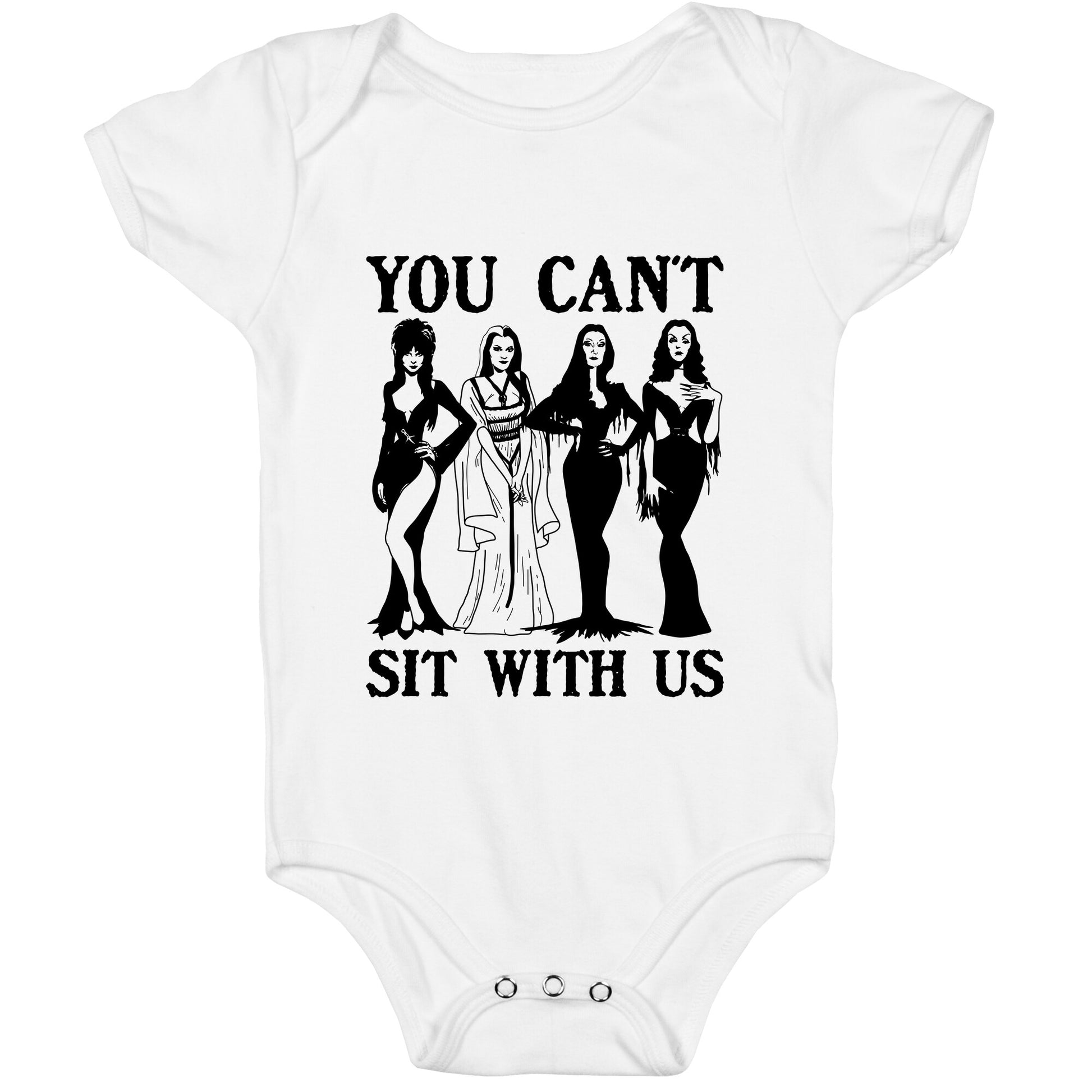 This Halloween, channel your inner queen bee with a spooky twist on the iconic "You Cant Sit With Us" moment. Perfect for anyone who loves mixing sass with scares, its a playful nod to Mean Girls with a festive edge. Our Baby One Piece is made from exceedingly soft 100% ring spun cotton. They are featured with hemmed seams and a reinforced 3 snap bottom closure for easy diaper changes. Preshrunk for your convenience! Printed in the USA. Made with 100% Ring Spun Cotton.