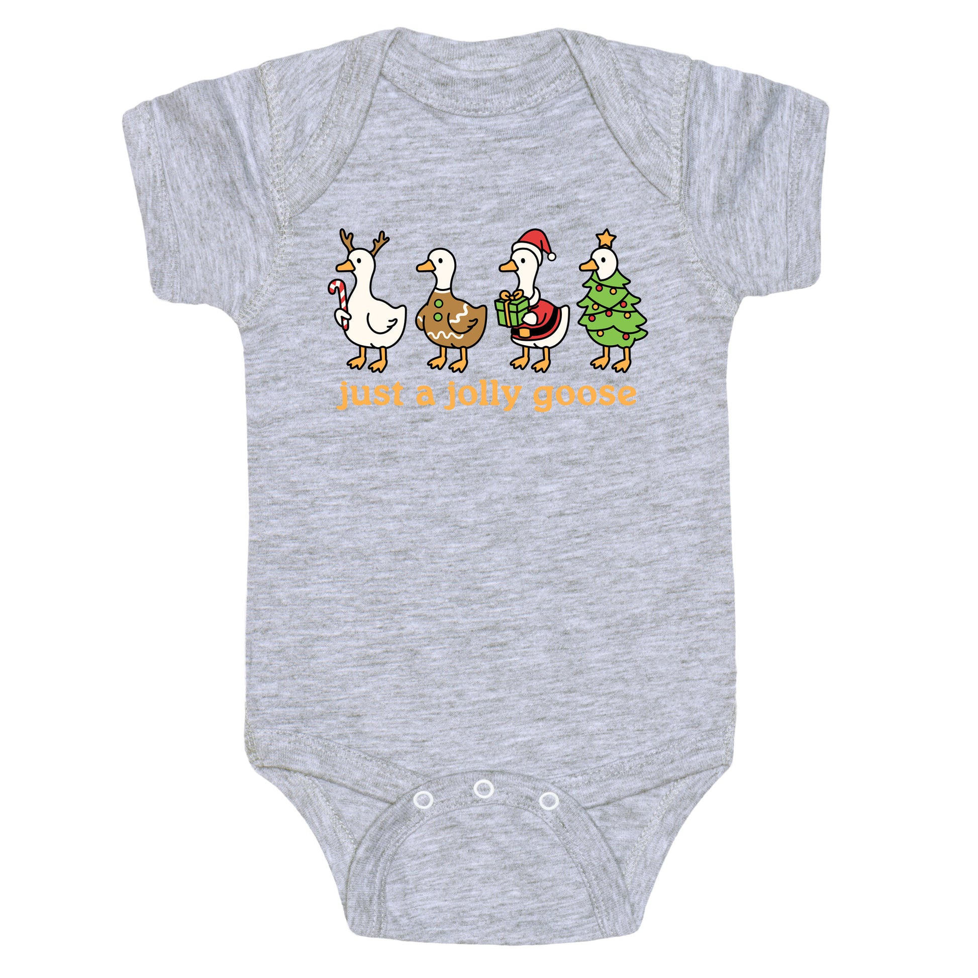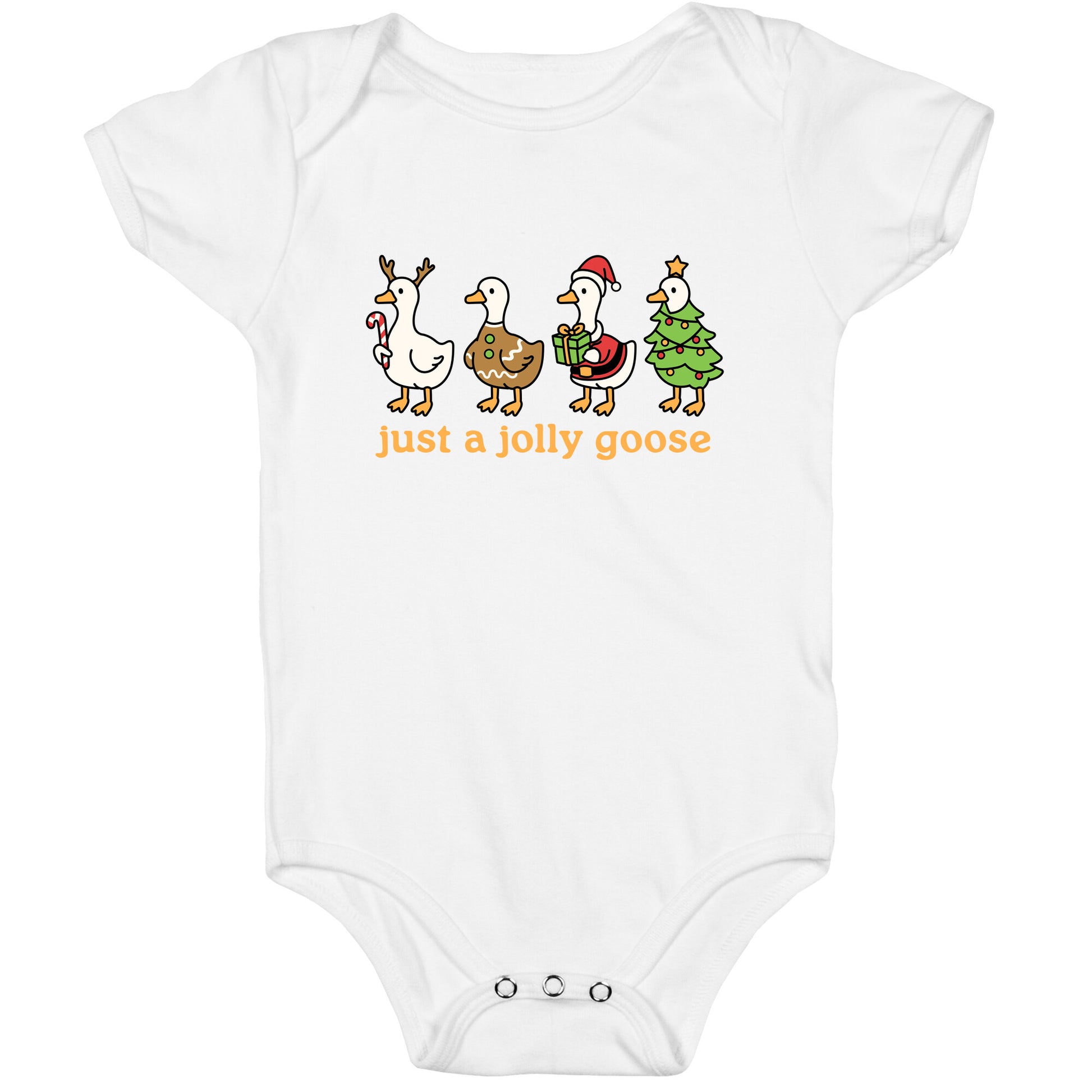 Bring the honk to the holidays with Just a Jolly Goose spreading festive chaos and questionable cheer. Perfect for anyone who believes Christmas carols sound better when aggressively honked. Our Baby One Piece is made from exceedingly soft 100% ring spun cotton. They are featured with hemmed seams and a reinforced 3 snap bottom closure for easy diaper changes. Preshrunk for your convenience! Printed in the USA. Made with 100% Ring Spun Cotton.