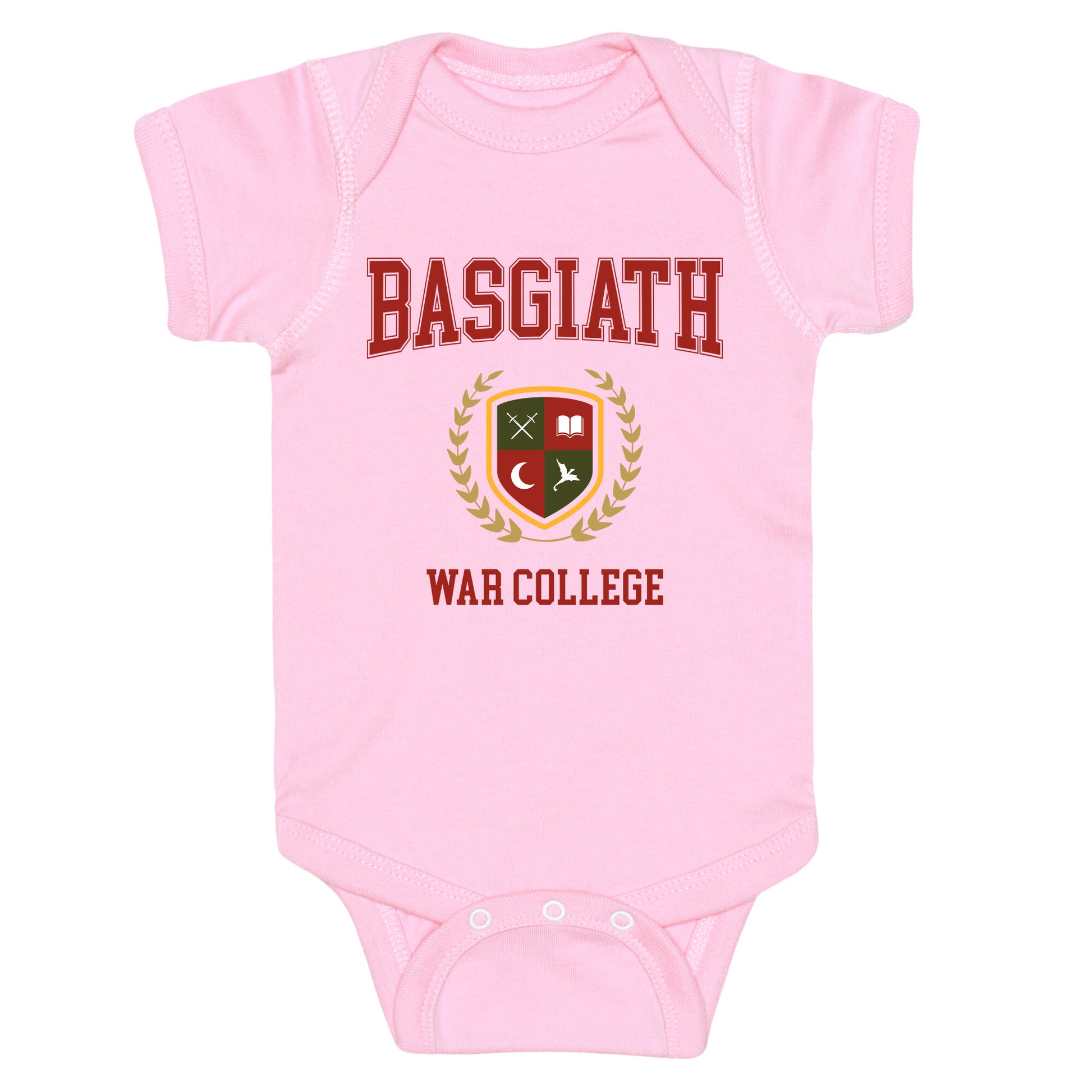 Channel the fierce spirit of Basgiath War College with this bold design that honors the legendary training grounds of dragon riders. A must-have for fans who want to show their allegiance to strength, strategy, and survival. Our Baby One Piece is made from exceedingly soft 100% ring spun cotton. They are featured with hemmed seams and a reinforced 3 snap bottom closure for easy diaper changes. Preshrunk for your convenience! Printed in the USA. Made with 100% Ring Spun Cotton.