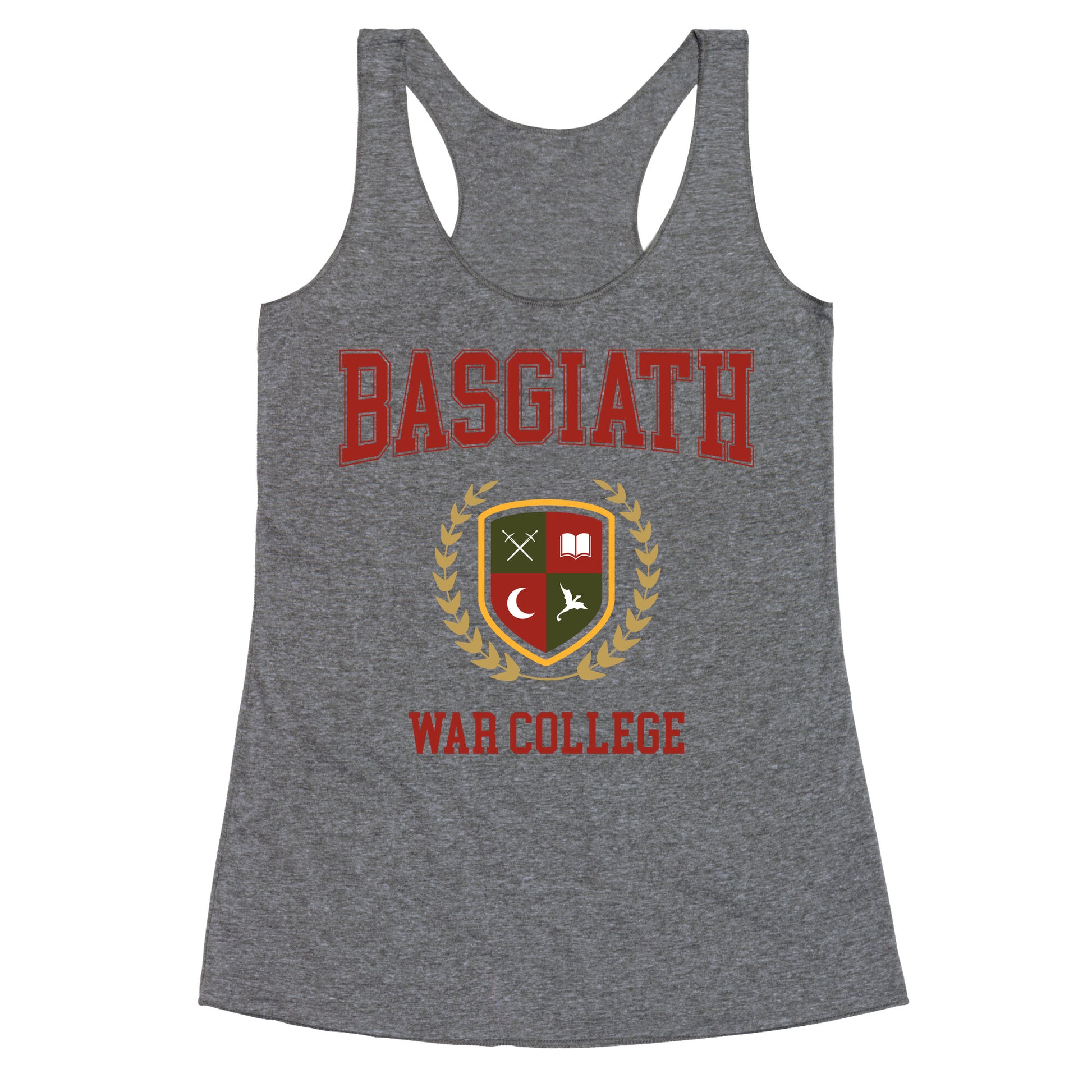 Channel the fierce spirit of Basgiath War College with this bold design that honors the legendary training grounds of dragon riders. A must-have for fans who want to show their allegiance to strength, strategy, and survival. Our super comfortable Womens Raw Edge Racerback features a soft tri-blend, unhemmed fabric, with a fashionable bell-like shape for the bottom. Preshrunk for your convenience! Printed in the USA. Made with 50% Polyester 25% Ring Spun Cotton, and 25% Rayon.