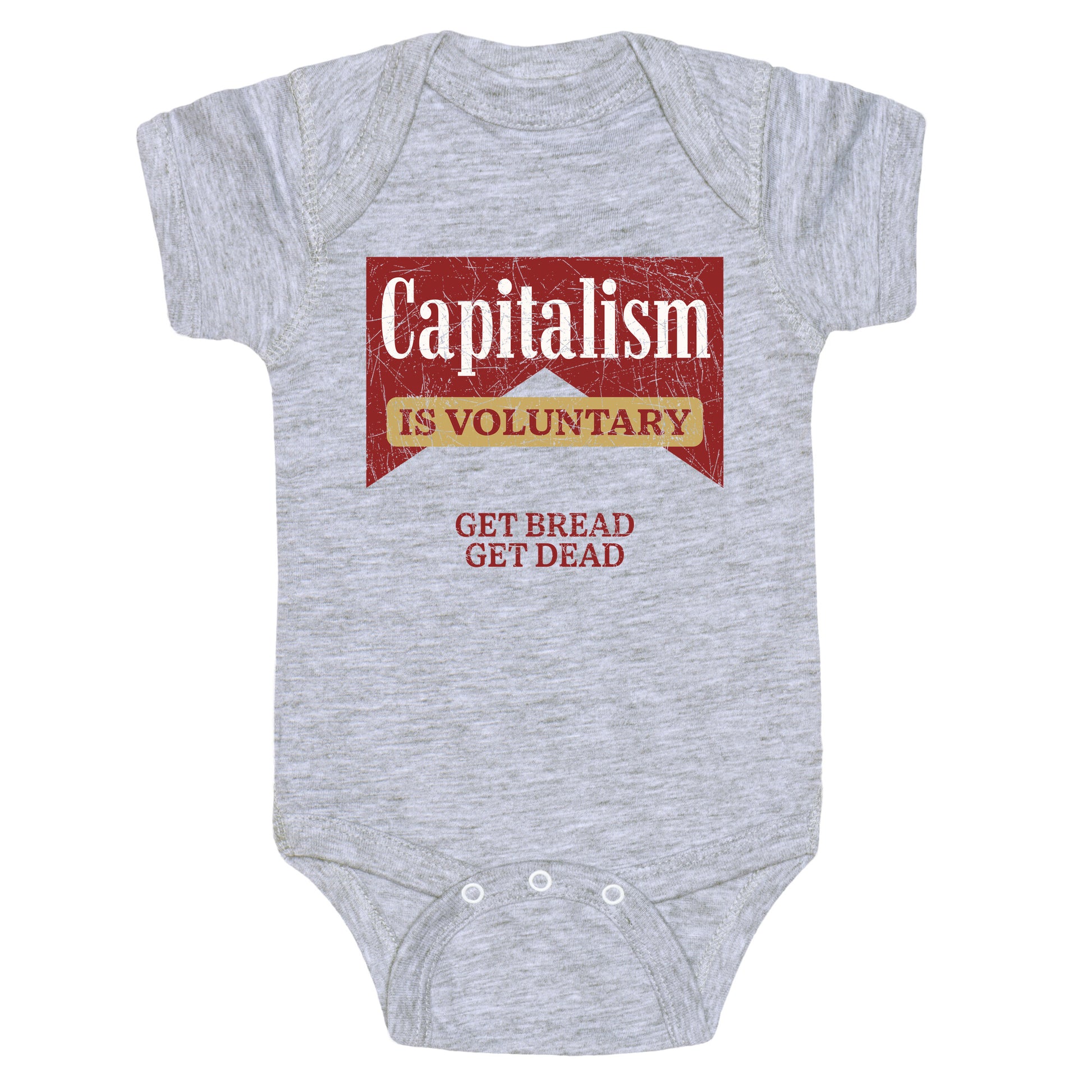 Wear your disillusionment loud a middle finger to the myth of the "free market." "Capitalism is Voluntary \(Get Bread Get Dead\)" isnt a slogan, its a eulogy with style. Our Baby One Piece is made from exceedingly soft 100% ring spun cotton. They are featured with hemmed seams and a reinforced 3 snap bottom closure for easy diaper changes. Preshrunk for your convenience! Printed in the USA. Made with 100% Ring Spun Cotton.
