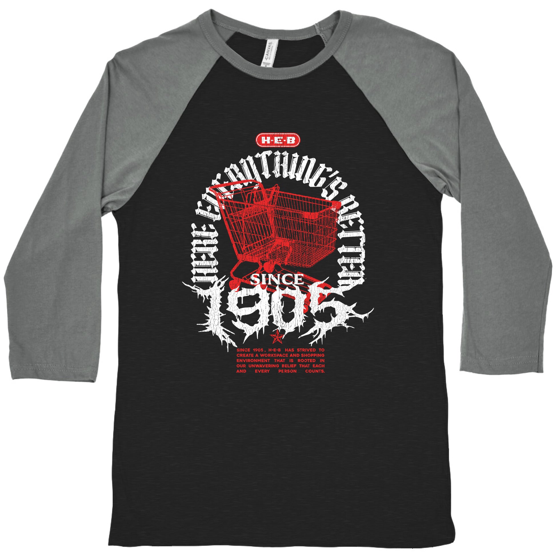 Show your Texas pride with this bold H-E-B Metal shirt, inspired by classic heavy metal band designs. Perfect for fans who want to rock their grocery game with attitude and hometown spirit. Our exceedingly soft and relaxed fit Tri-Blend Baseball Tee features a three-quarter length sleeve, crew neck, fun contrasting color sleeves and neck trim. Preshrunk for your convenience! Printed in the USA. Made with 50% Polyester, 25% Cotton and 25% Rayon