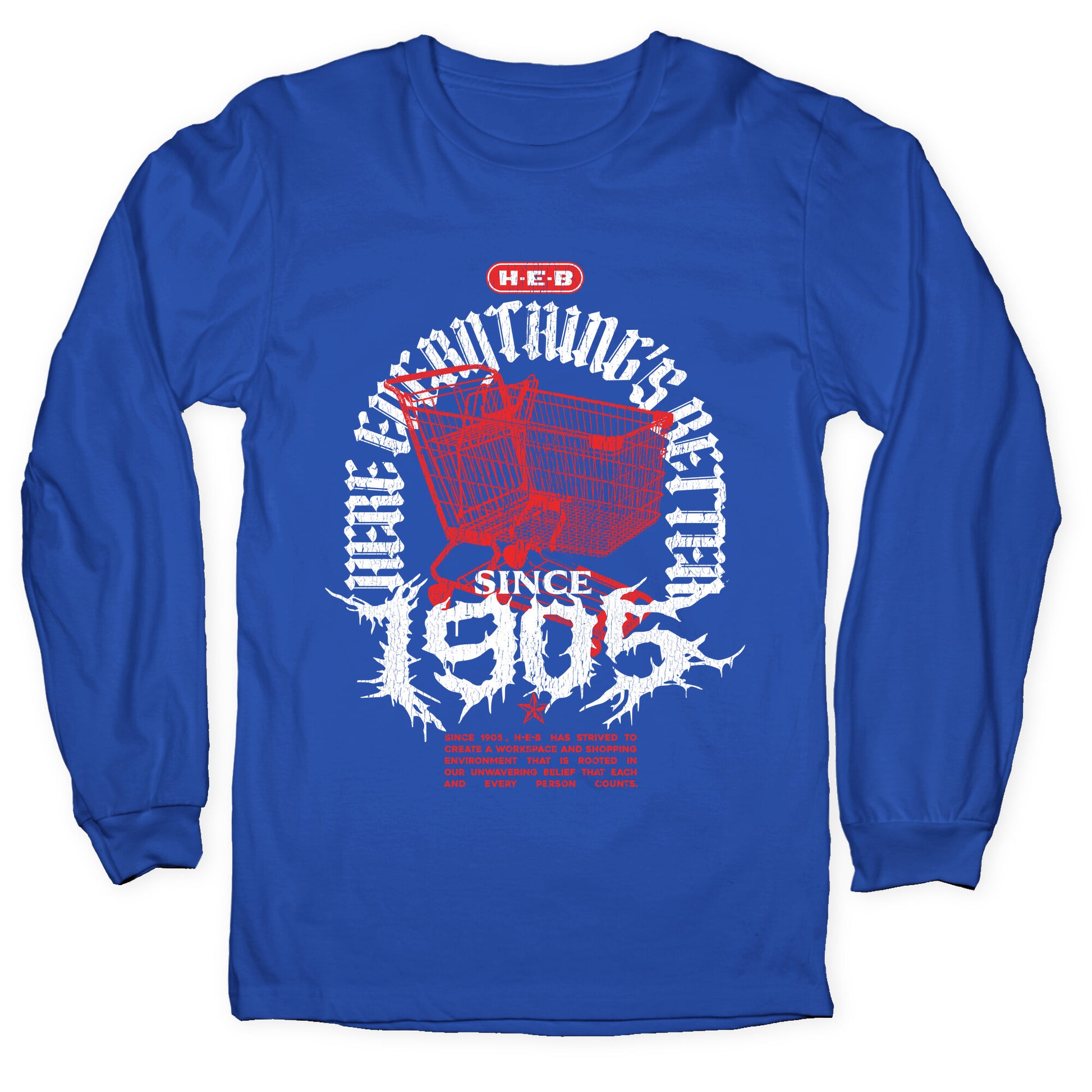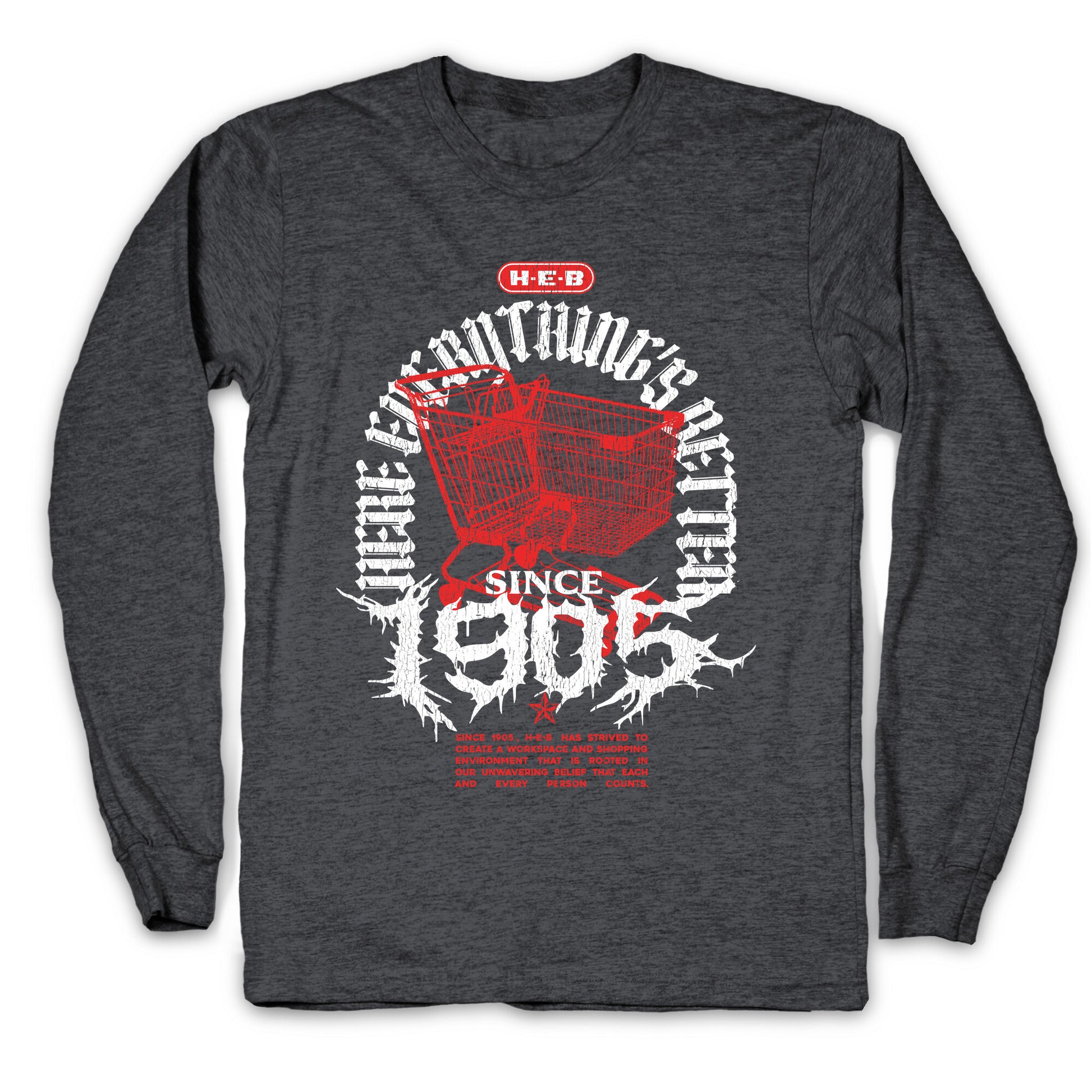 Show your Texas pride with this bold H-E-B Metal shirt, inspired by classic heavy metal band designs. Perfect for fans who want to rock their grocery game with attitude and hometown spirit. Our Unisex Long Sleeve Tee is made from a soft 100% cotton jersey knit. It features a crew neckline with ribbed cuffs and hemmed bottom for durability. Preshrunk for your convenience! Printed in the USA. Athletic Gray is made up of 90% cotton and 10% polyester.