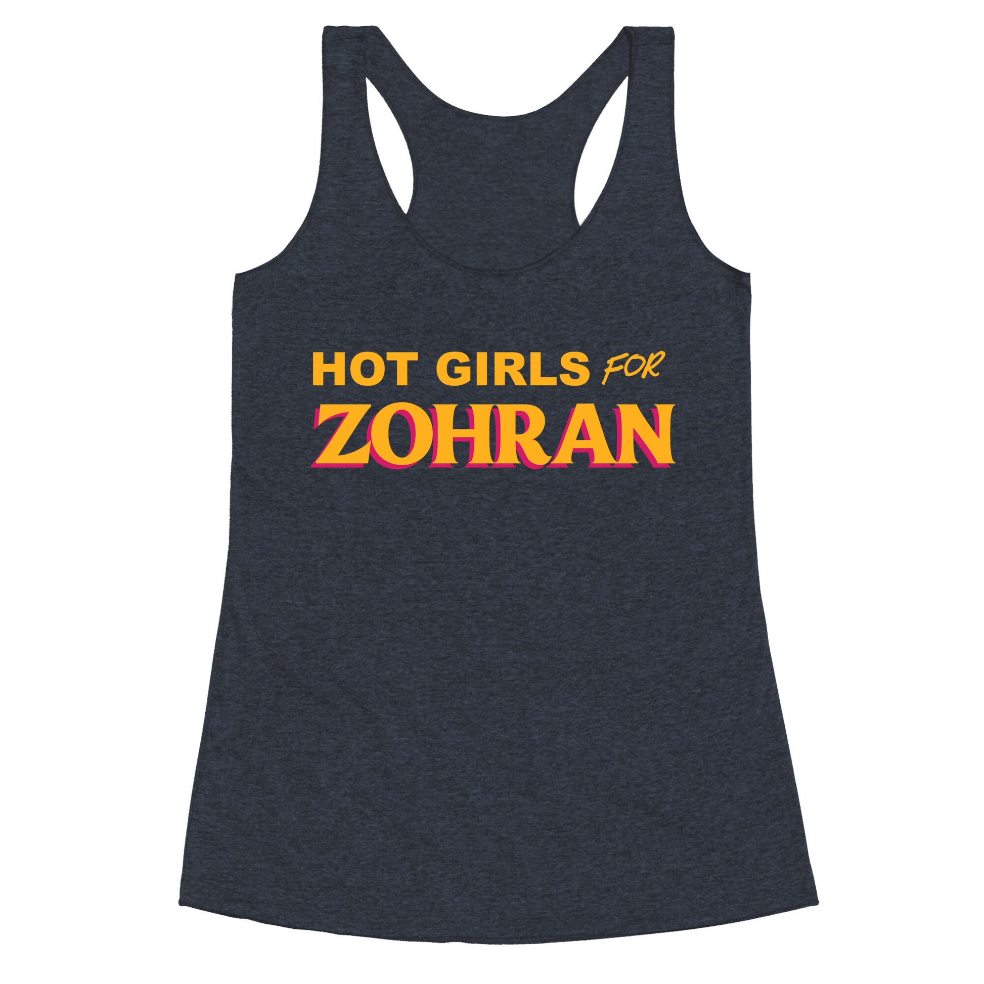 Turn heads and spark conversation with this bold "Hot Girls for Zohran" tee that celebrates confidence and charisma. Perfect for those who wear their energy and their support loud and proud. Our super comfortable Womens Raw Edge Racerback features a soft tri-blend, unhemmed fabric, with a fashionable bell-like shape for the bottom. Preshrunk for your convenience! Printed in the USA. Made with 50% Polyester 25% Ring Spun Cotton, and 25% Rayon.